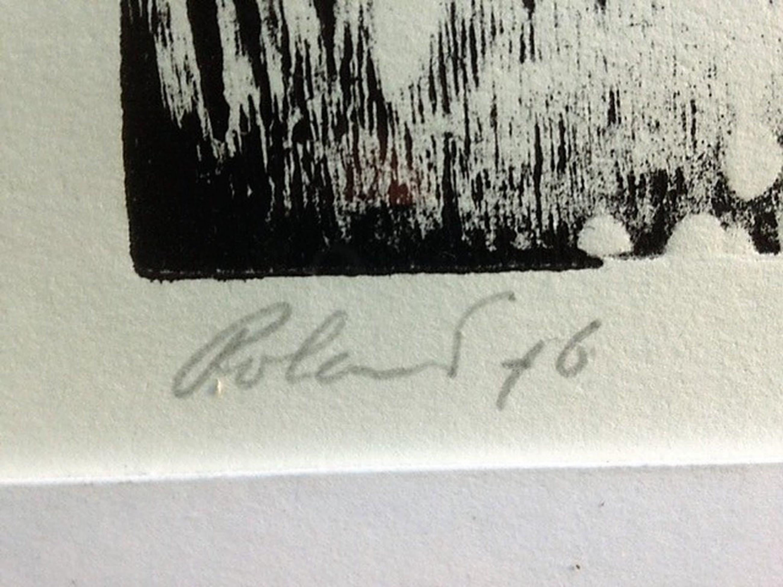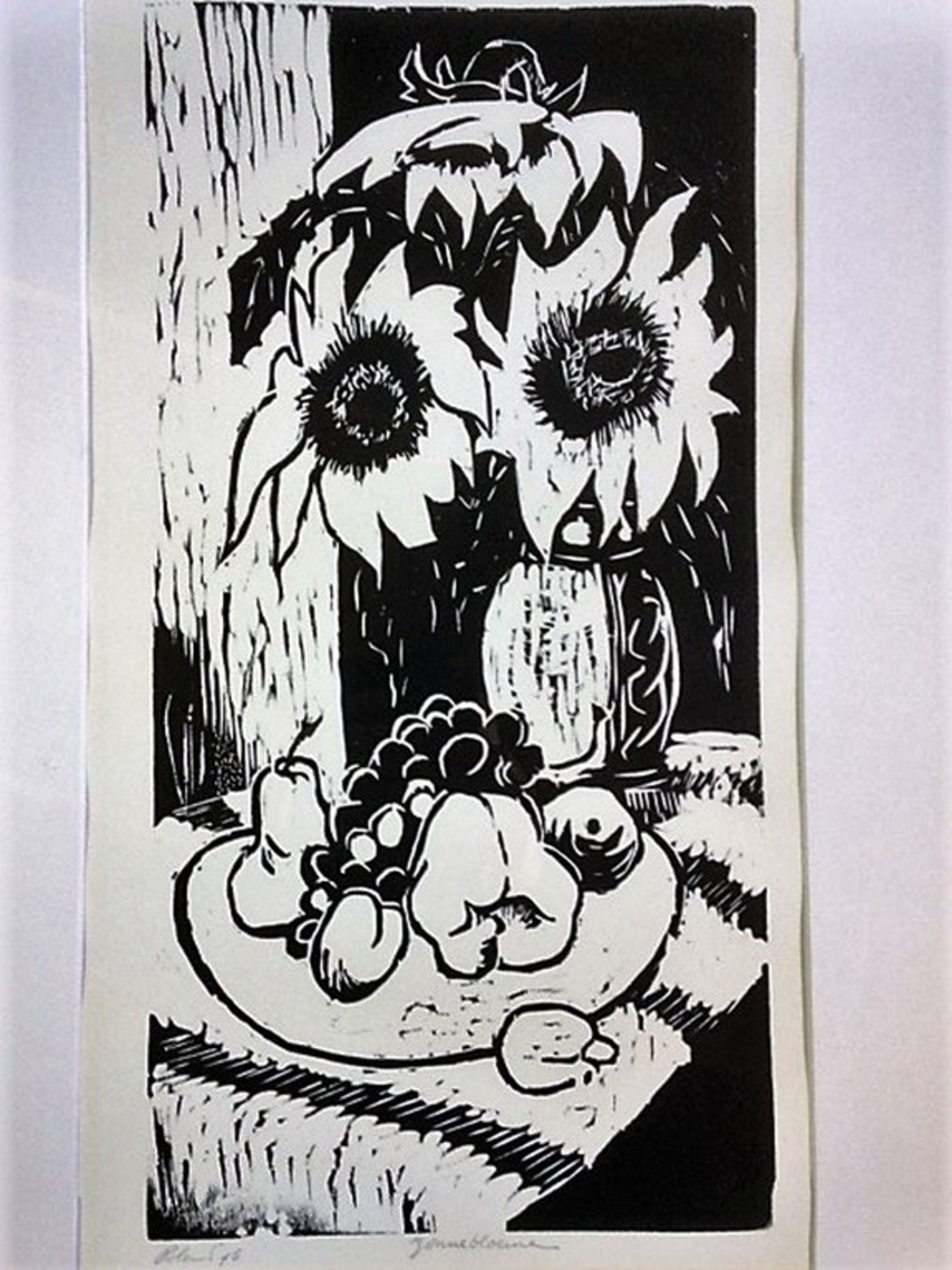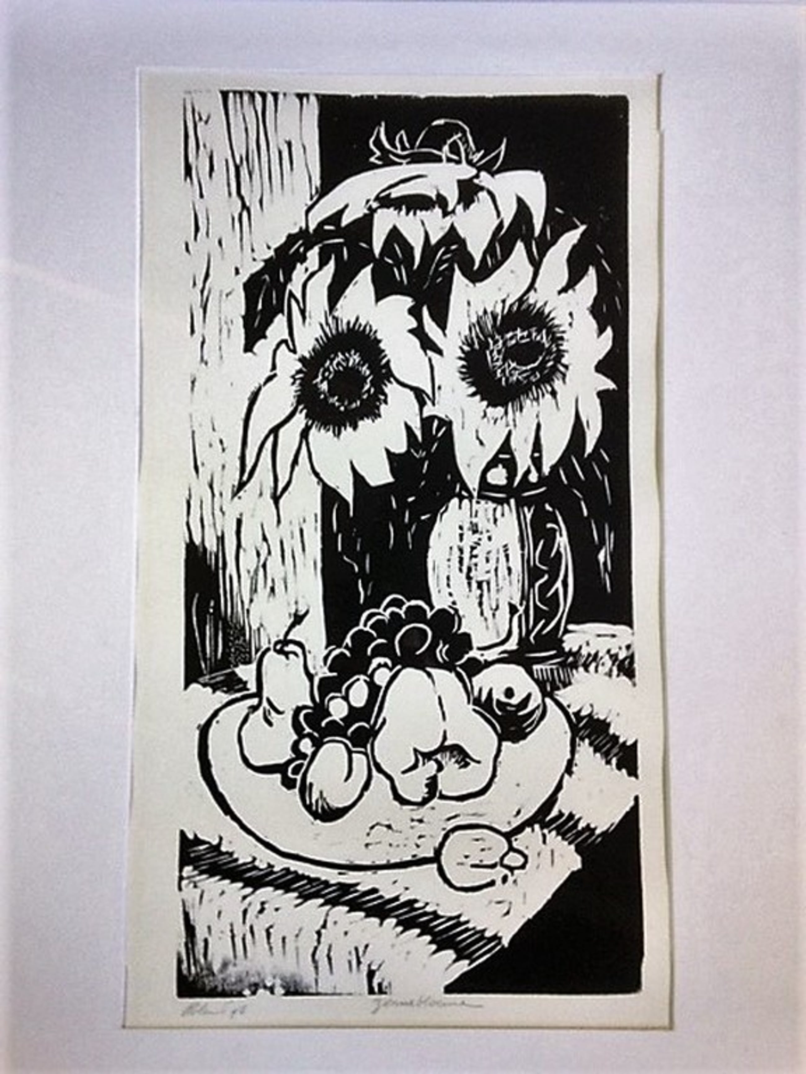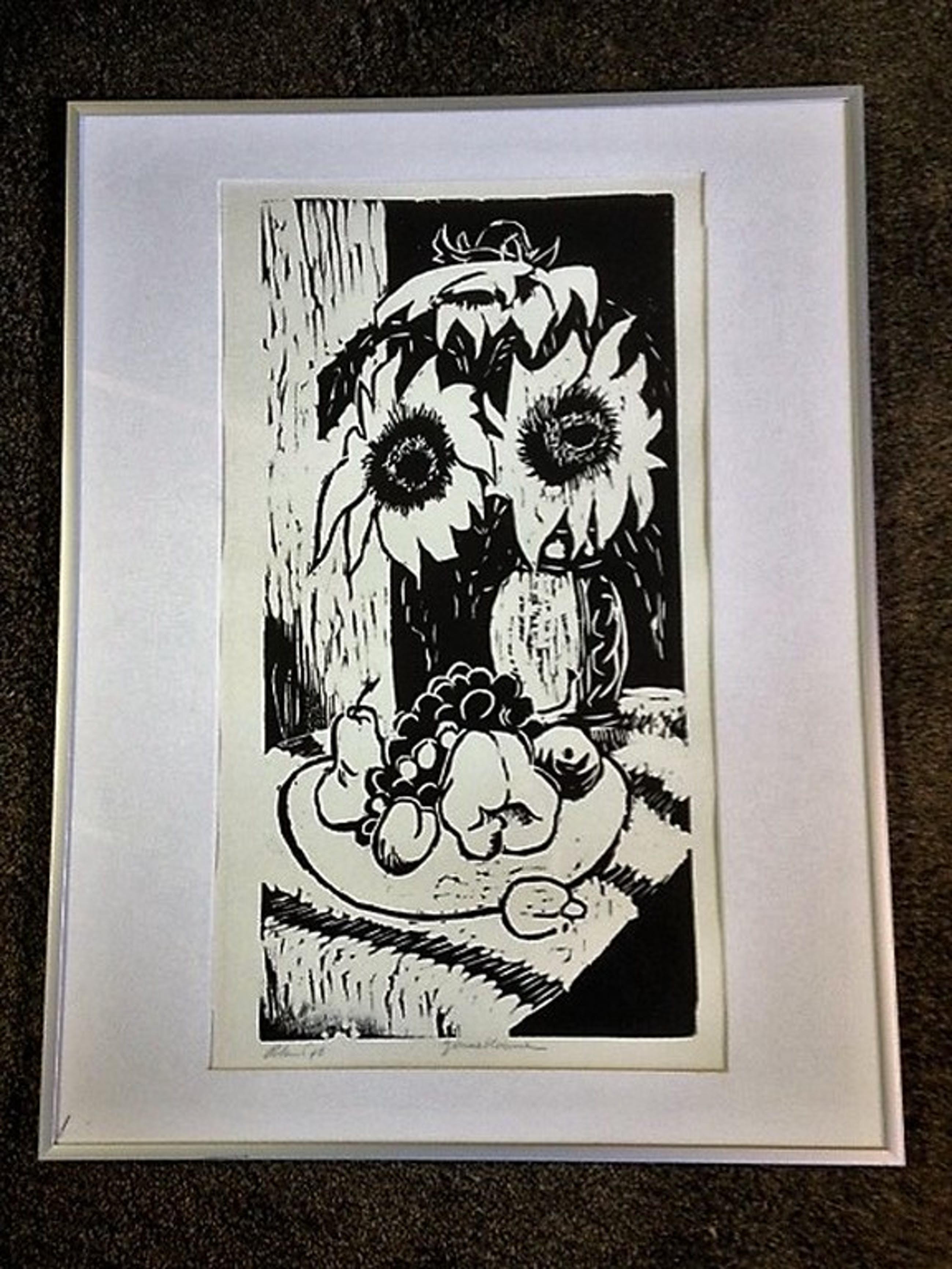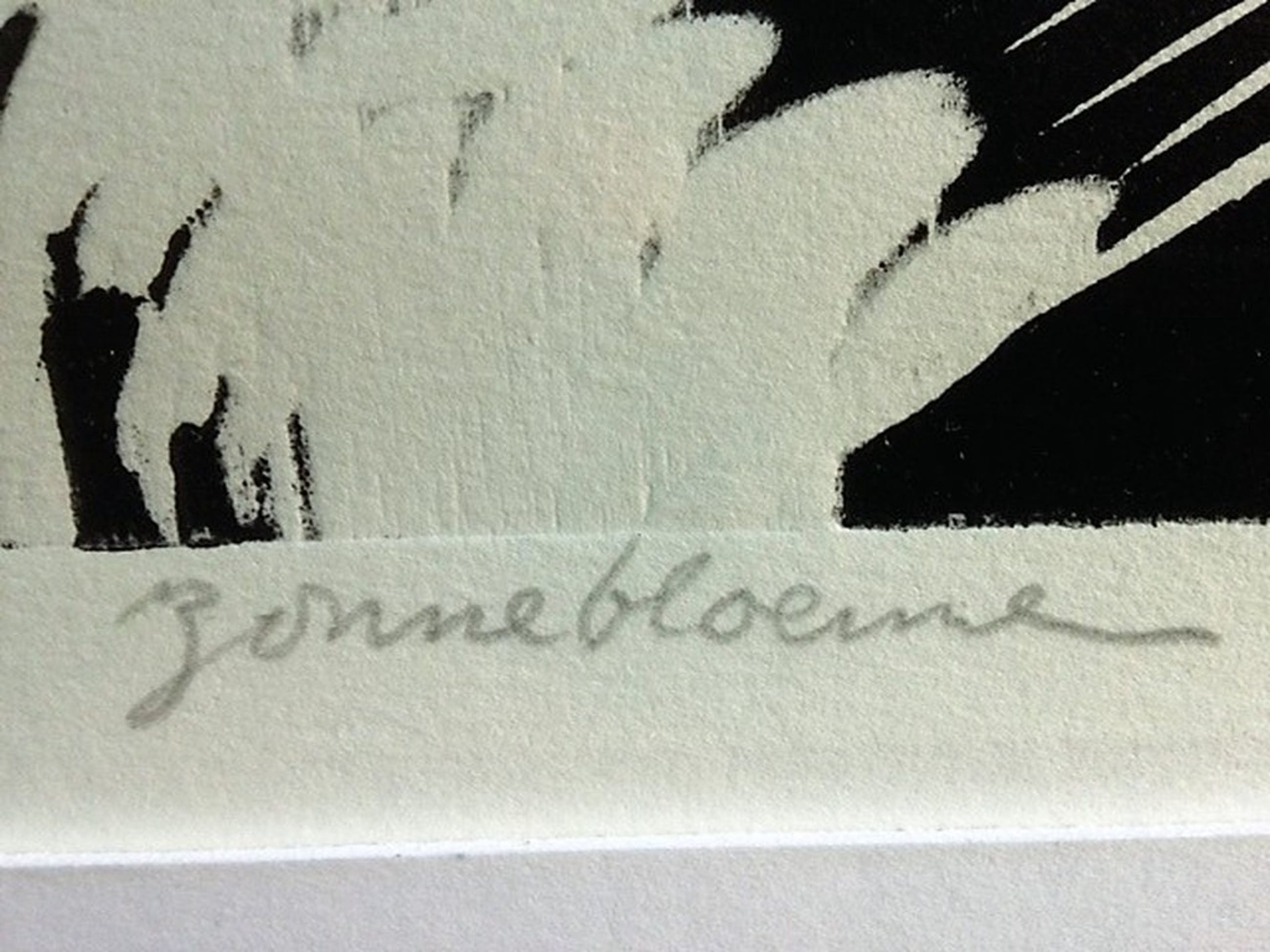 Fraaie houtsnede, titel "Zonnebloemen", naam kunstenaar: G. Roland. Gesigneerd met potlood direct onder de houtsnede. Het werk is geplaatst in een smetteloze passe-partout en deze is vervolgens ingelijst en voorzien van glas. De afmetingen van de houtsnede zijn: 31 cm x 54 cm. Inclusief de aluminium lijst zijn de afmetingen: 51 cm x 66 cm. Het geheel verkeert in een onberispelijke staat.