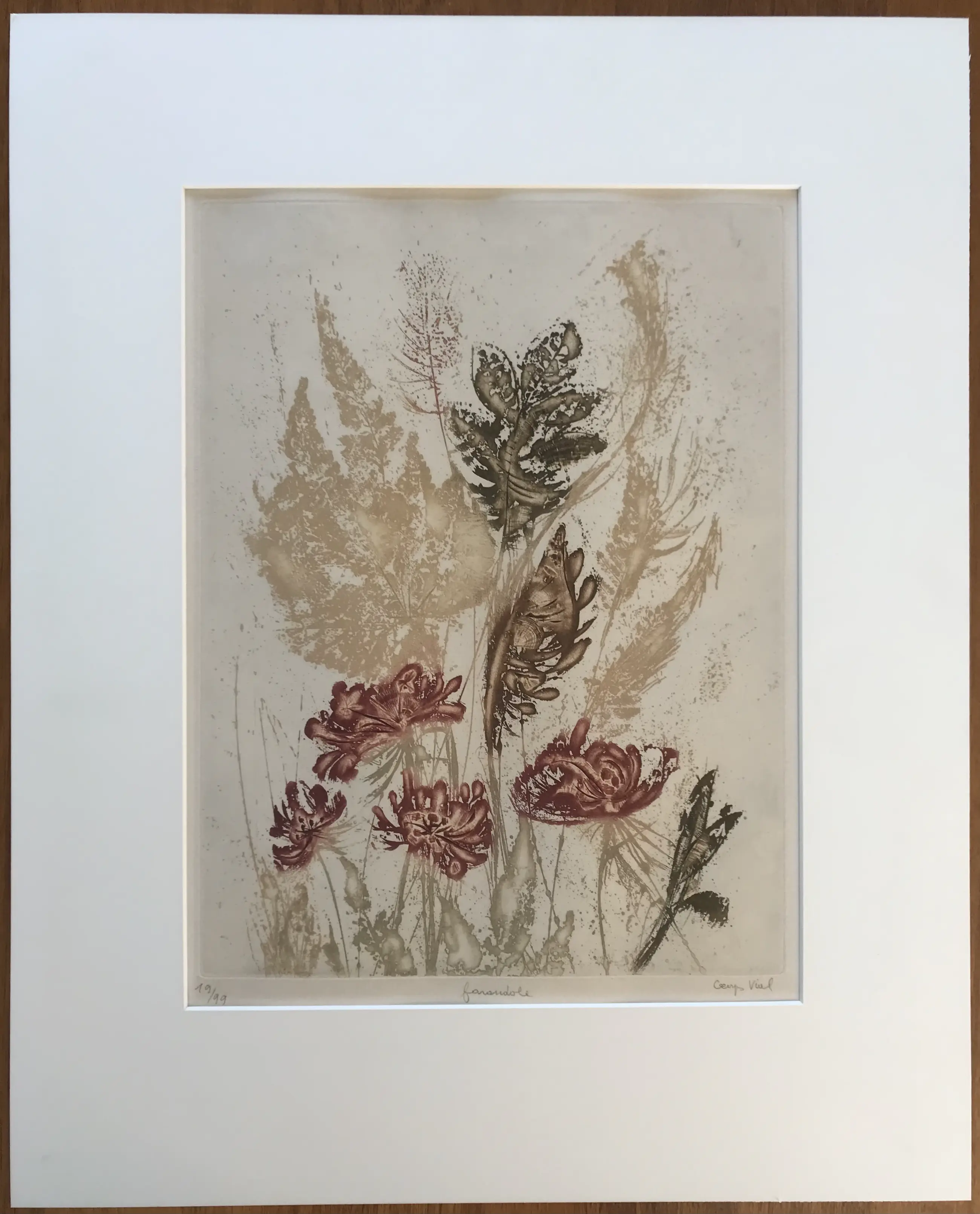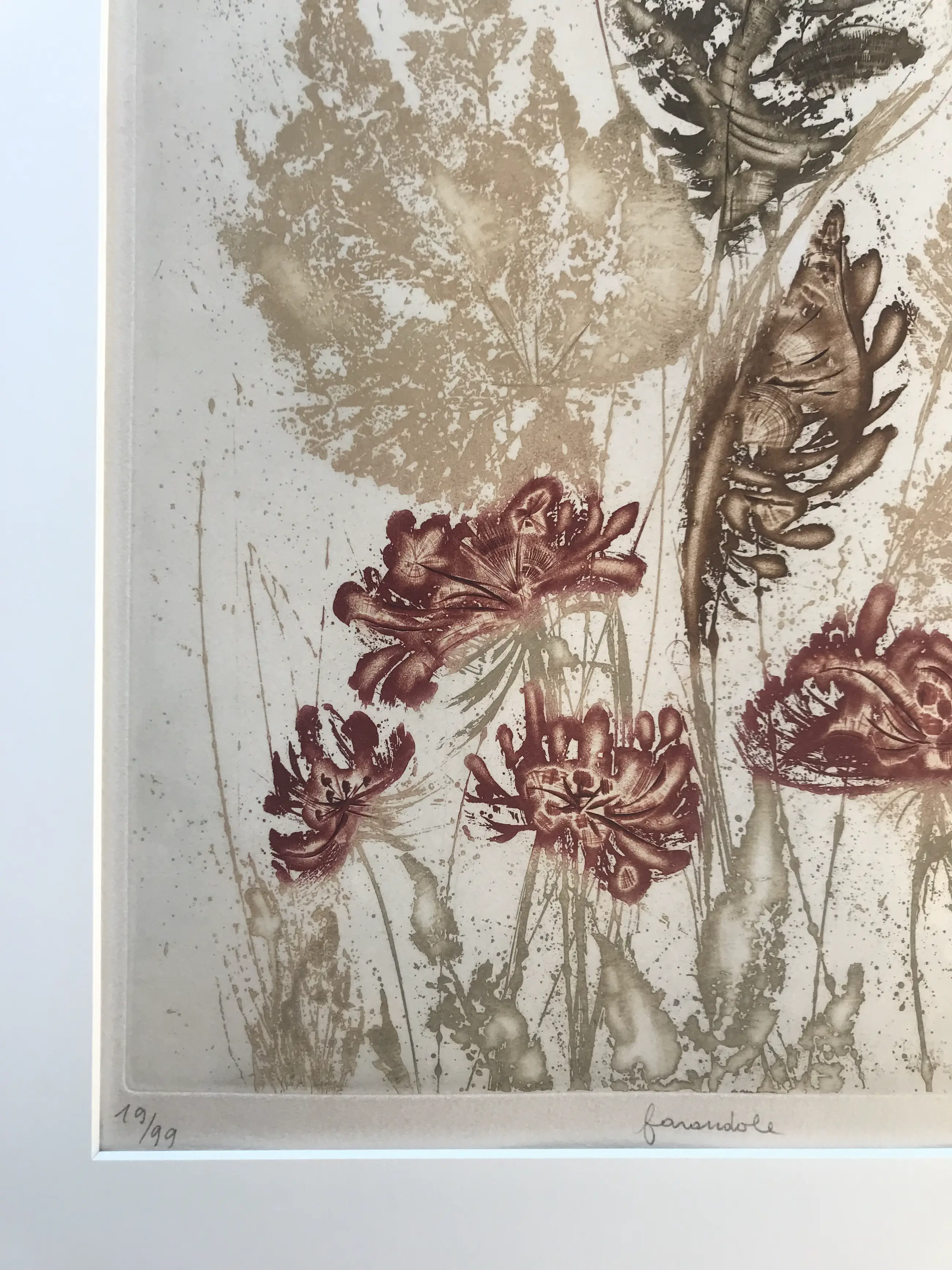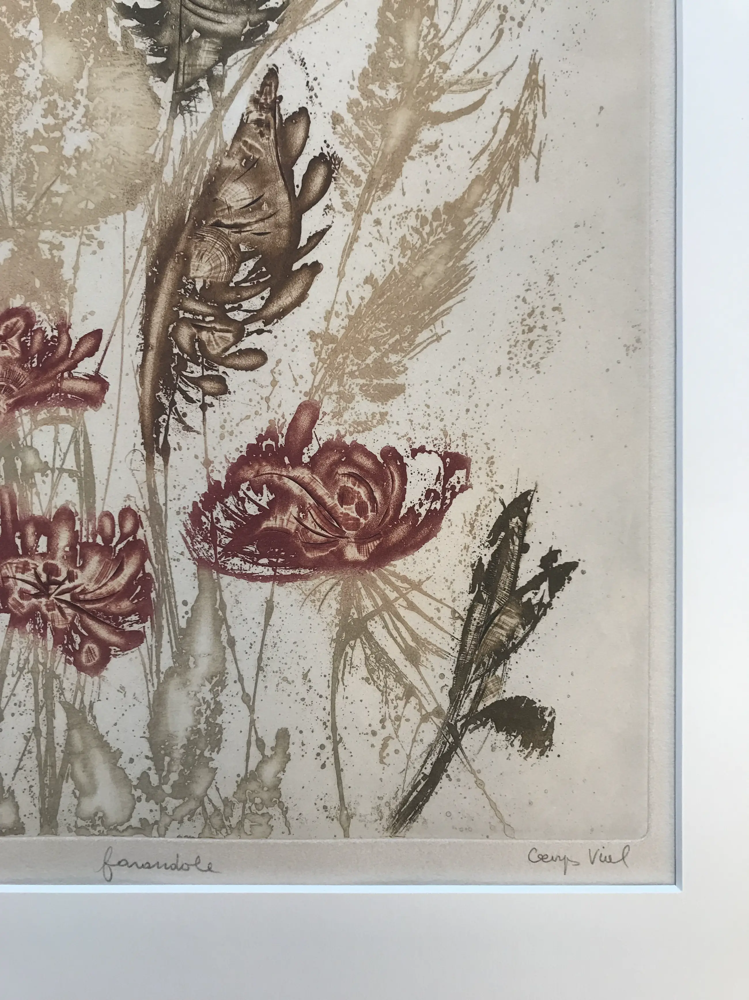 "Farandole" is een origineel kunstwerk gerealiseerd door Georges Vial in 1989. Gesigneerd in potlood in de rechter benedenhoek. Genummerd in potlood linksonder. Oplage van 99 prenten. Dit is nr 19.
