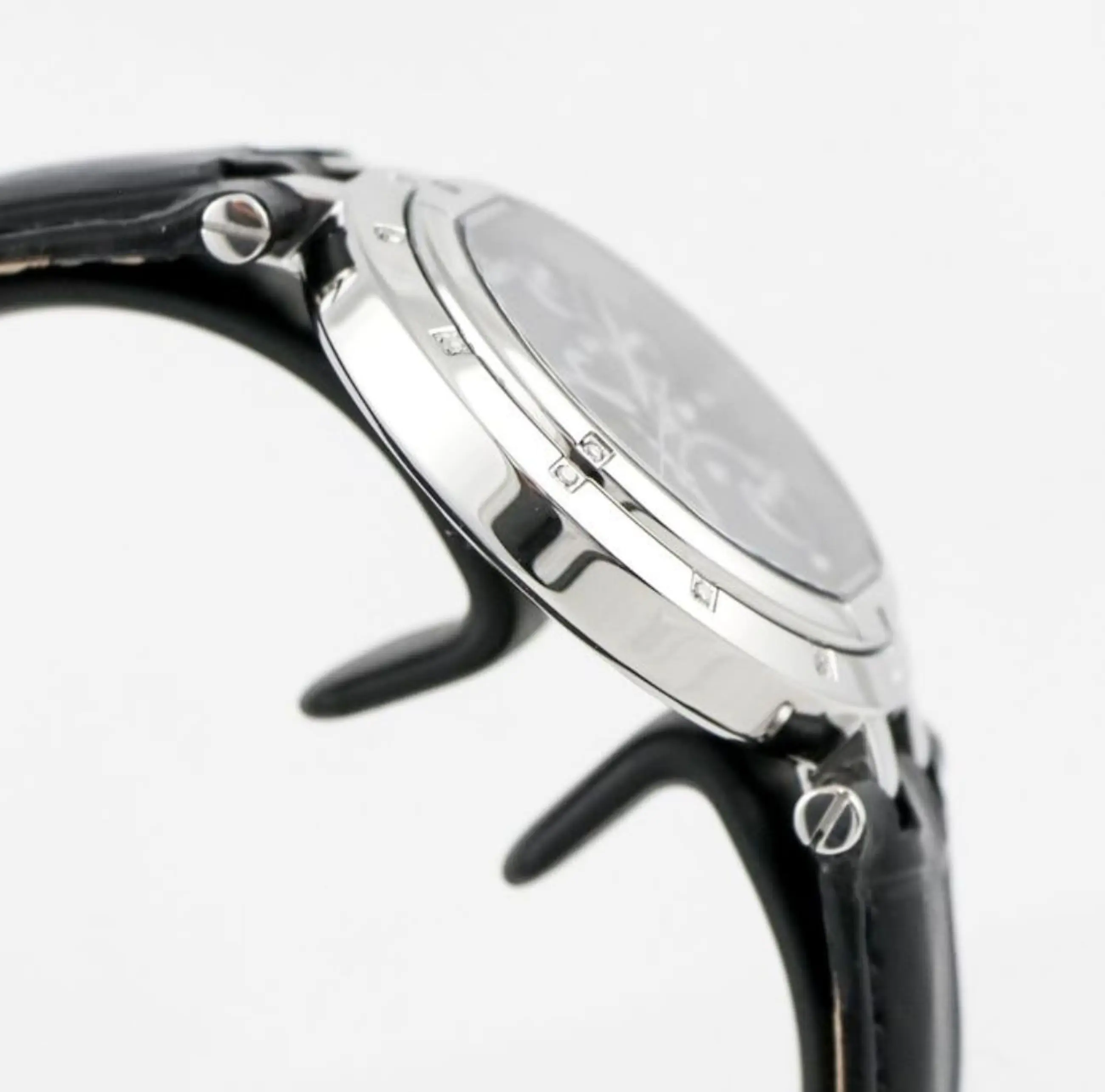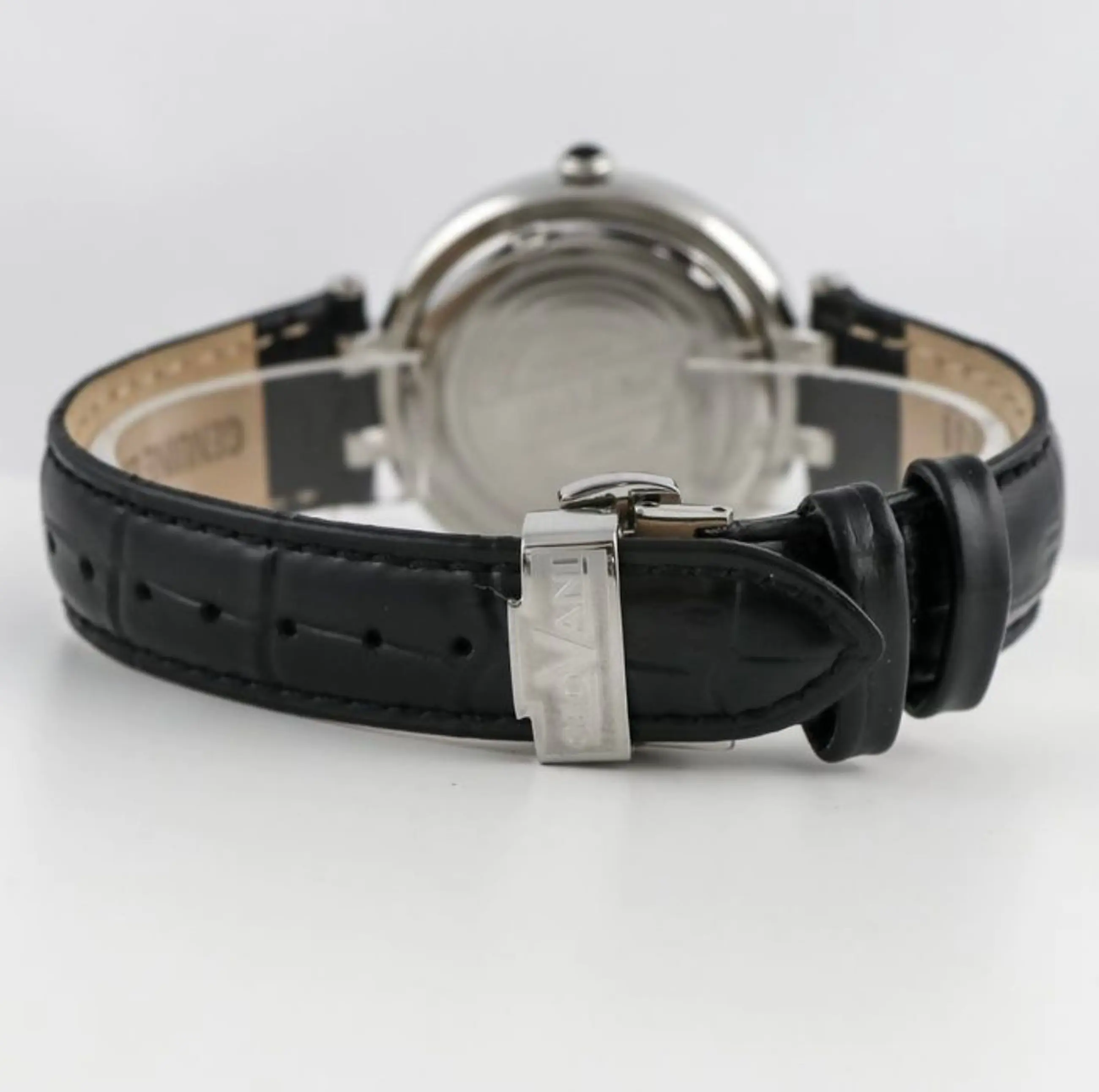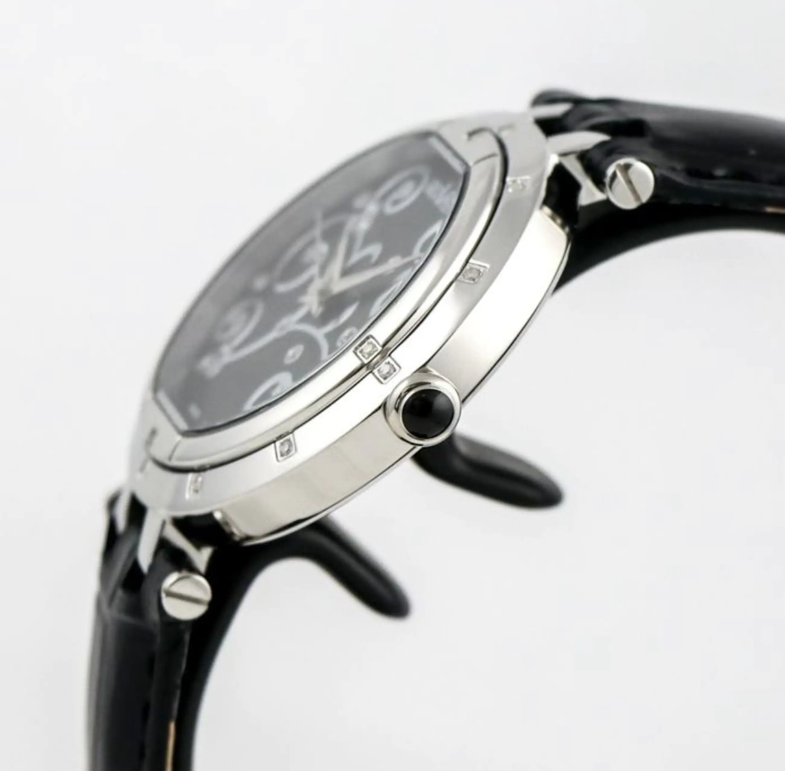 Wijzerplaat: Zwart parelmoer. Zilverkleurige wijzers en patronen gevuld met echte diamanten. Ronde wijzerplaat.