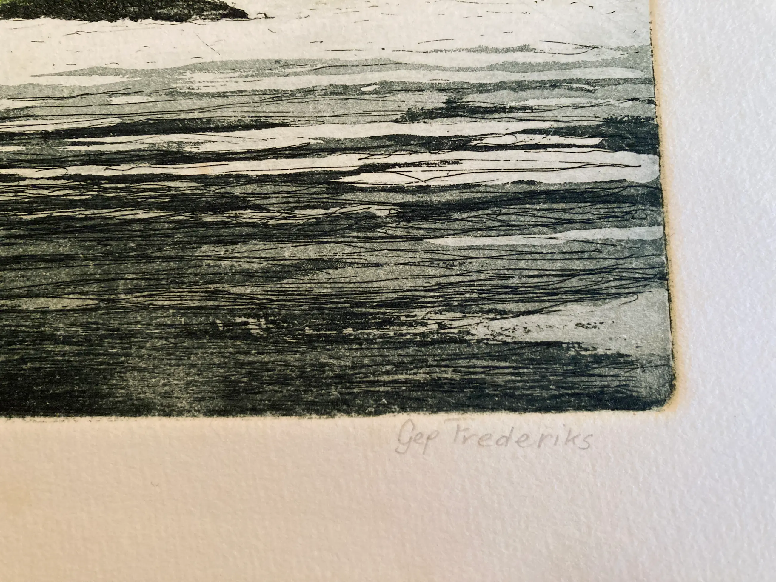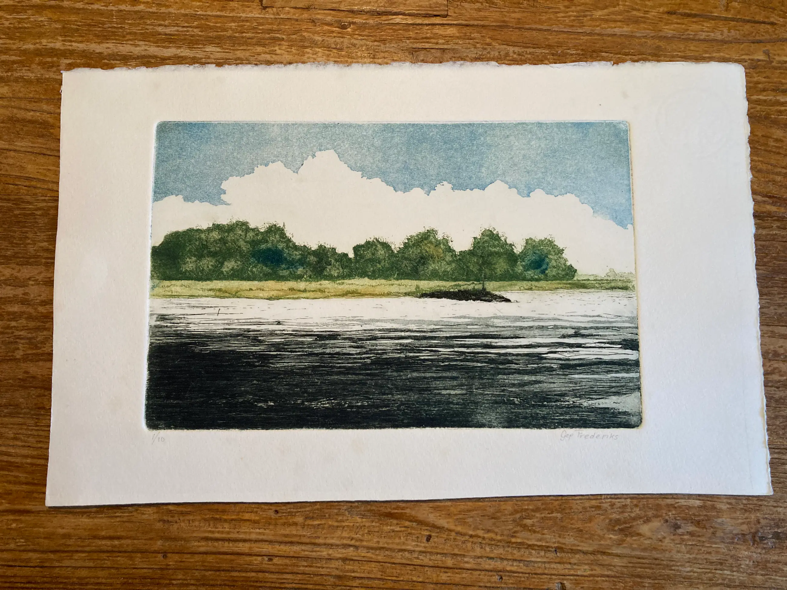Kleuren Ets van de Oosterbeekse kunstenaar Gep Frederiks. Betreft een voorstelling van de landschap van de Nederrijn. Uniek is dat het de eerste druk is van een kleine oplage van 10 stuks. Handgeschept papier, voorzien van watermerk. Het werk is gesigneerd. 32,5 x 21 cm titel is Rijn No. 33