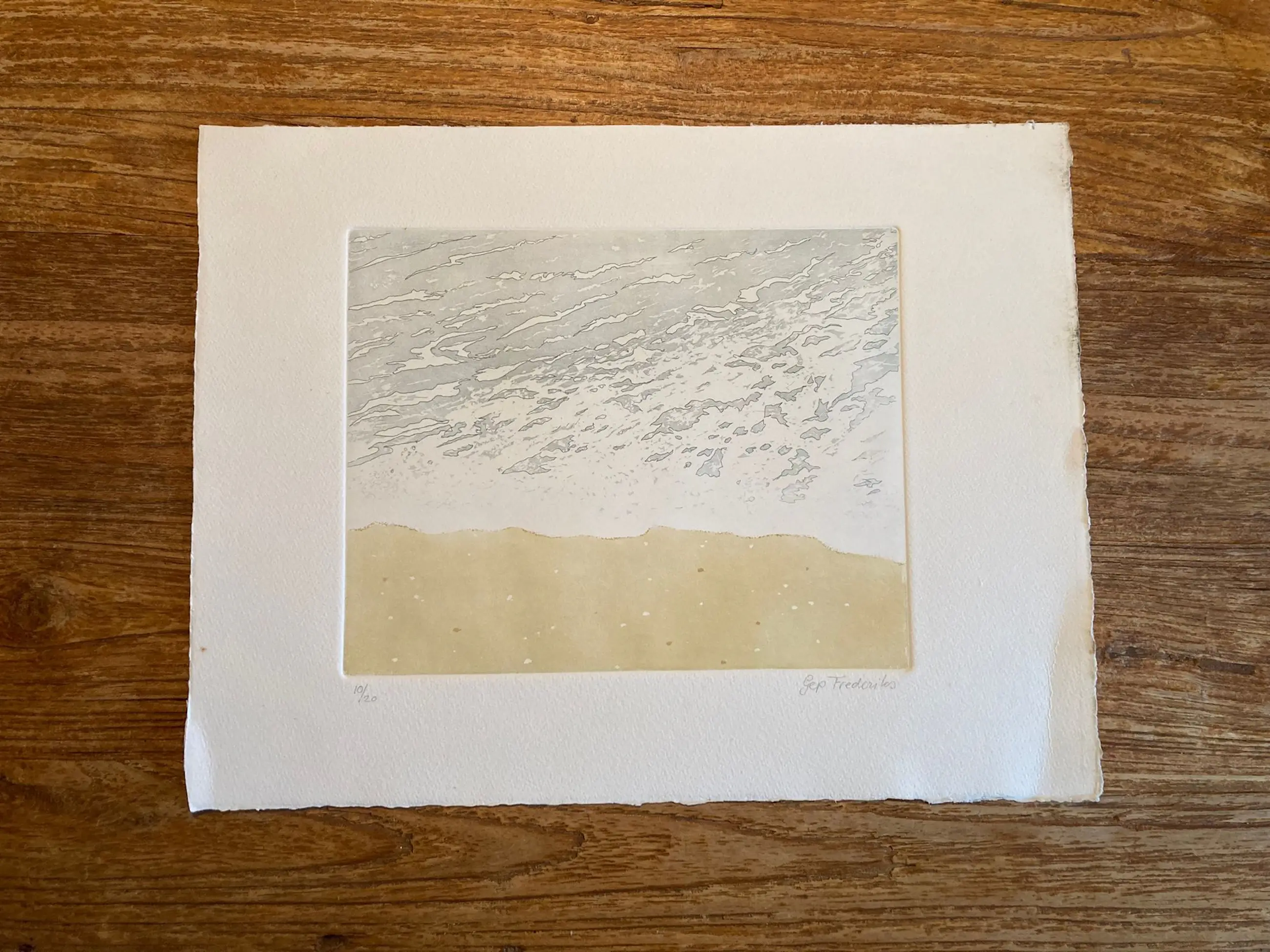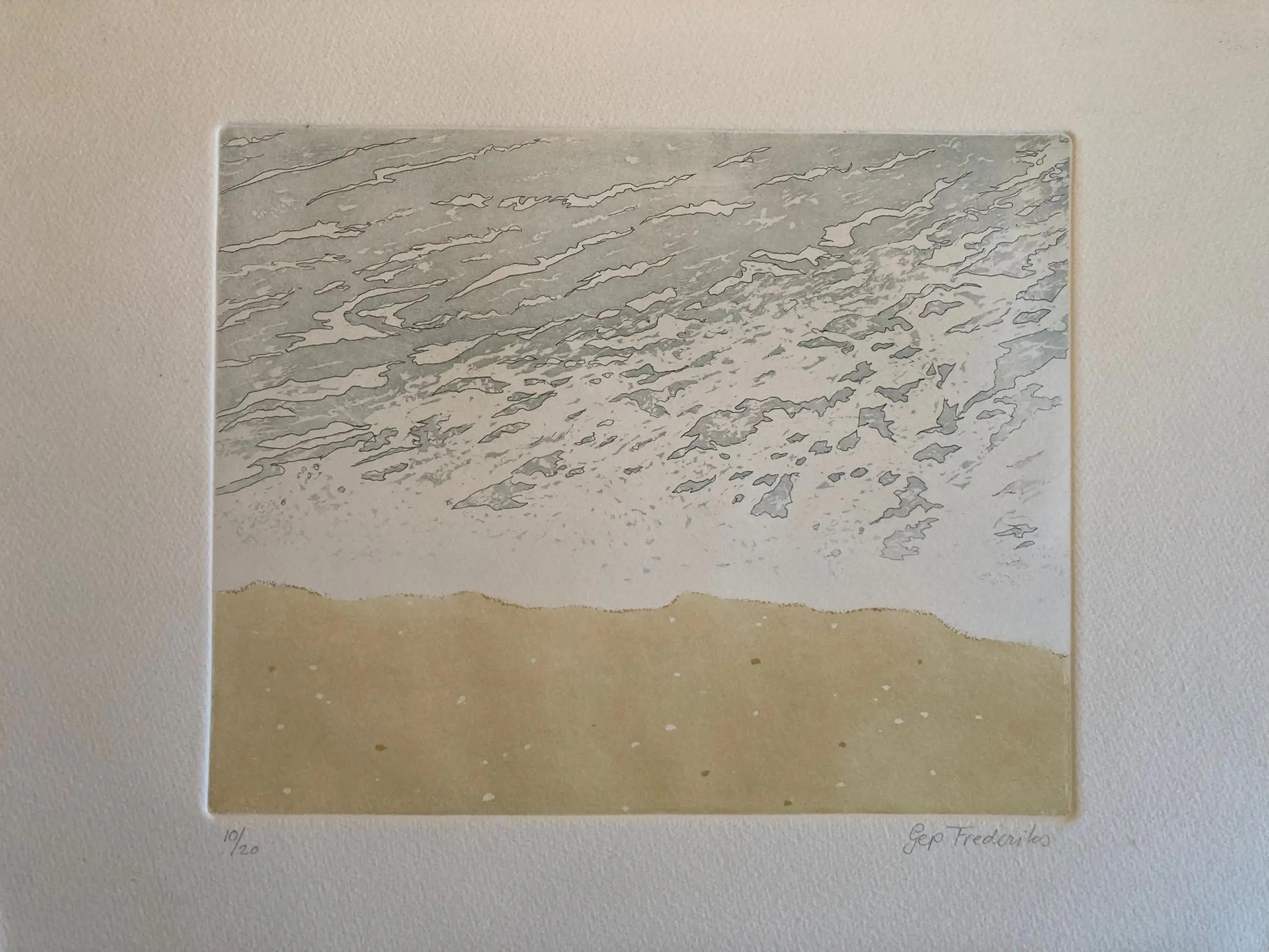 Ets van de Oosterbeekse kunstenaar Gep Frederiks. Het is een voorstelling van de terugtrekkende zee op het strand (van Texel). Betreft een kleurendruk, nummer 10 uit een kleine oplage van 20. De kleurenets is gesigneerd. Zie foto's om een beeld te krijgen van het werk.