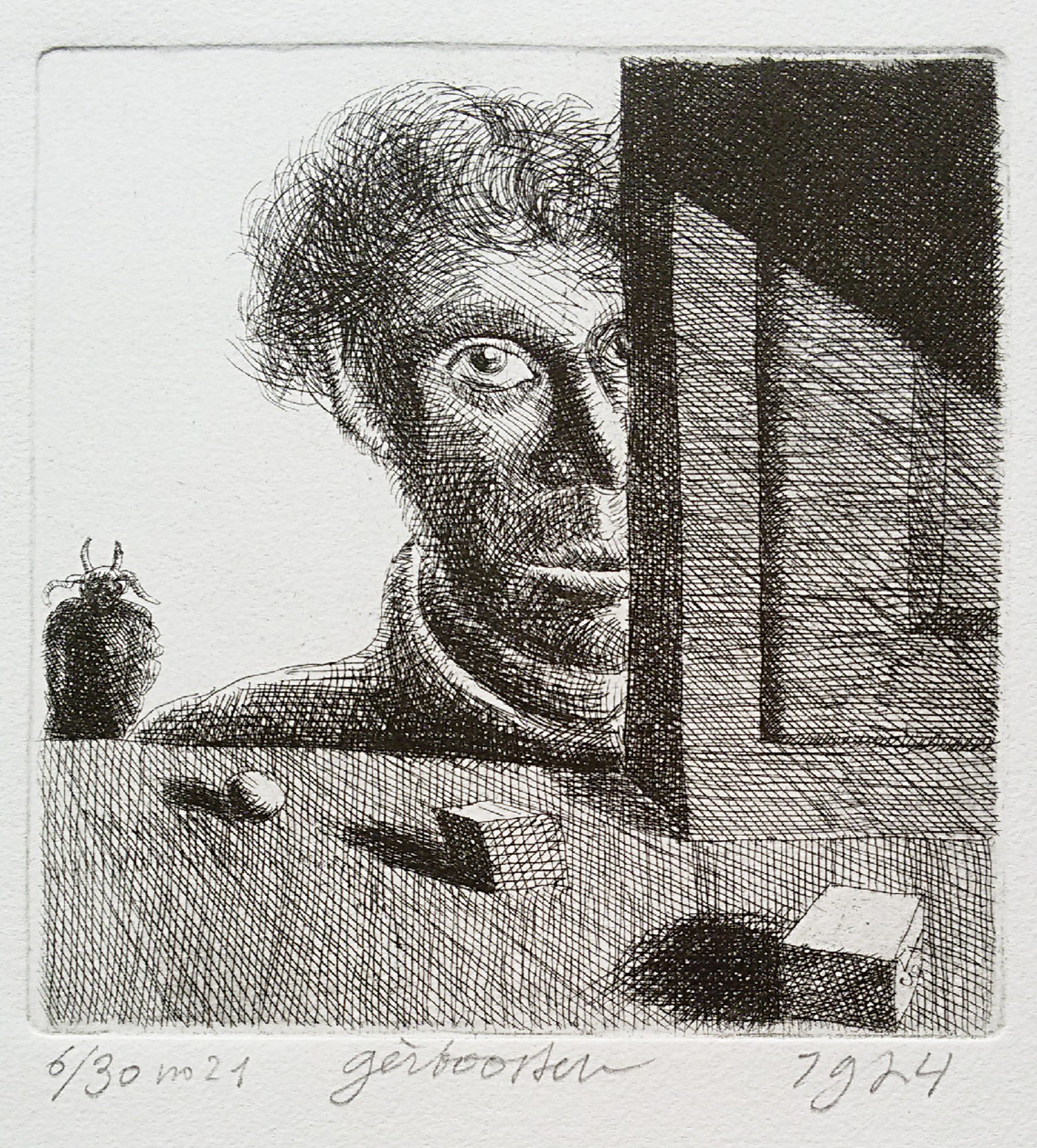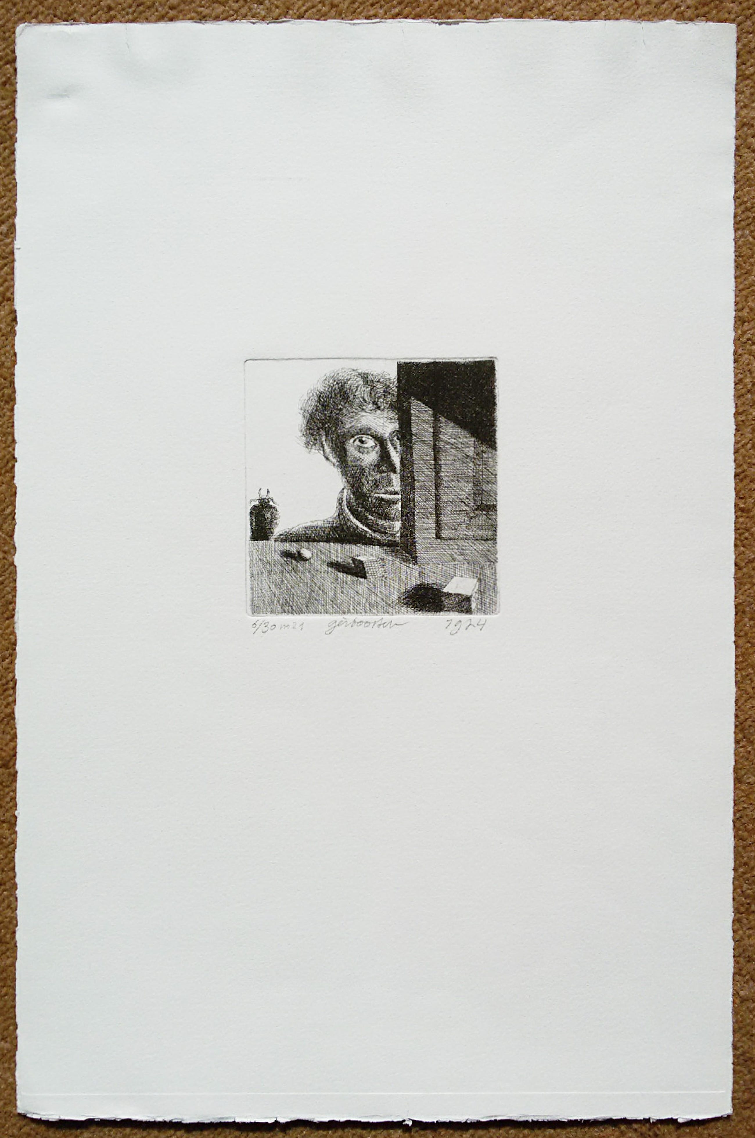 Leuk zelfportret van de Maastrichtenaar Ger Boosten. Ets op geschept papier, met potlood gesigneerd, gedateerd (1974) en genummerd (6/30). In zeer goede conditie.