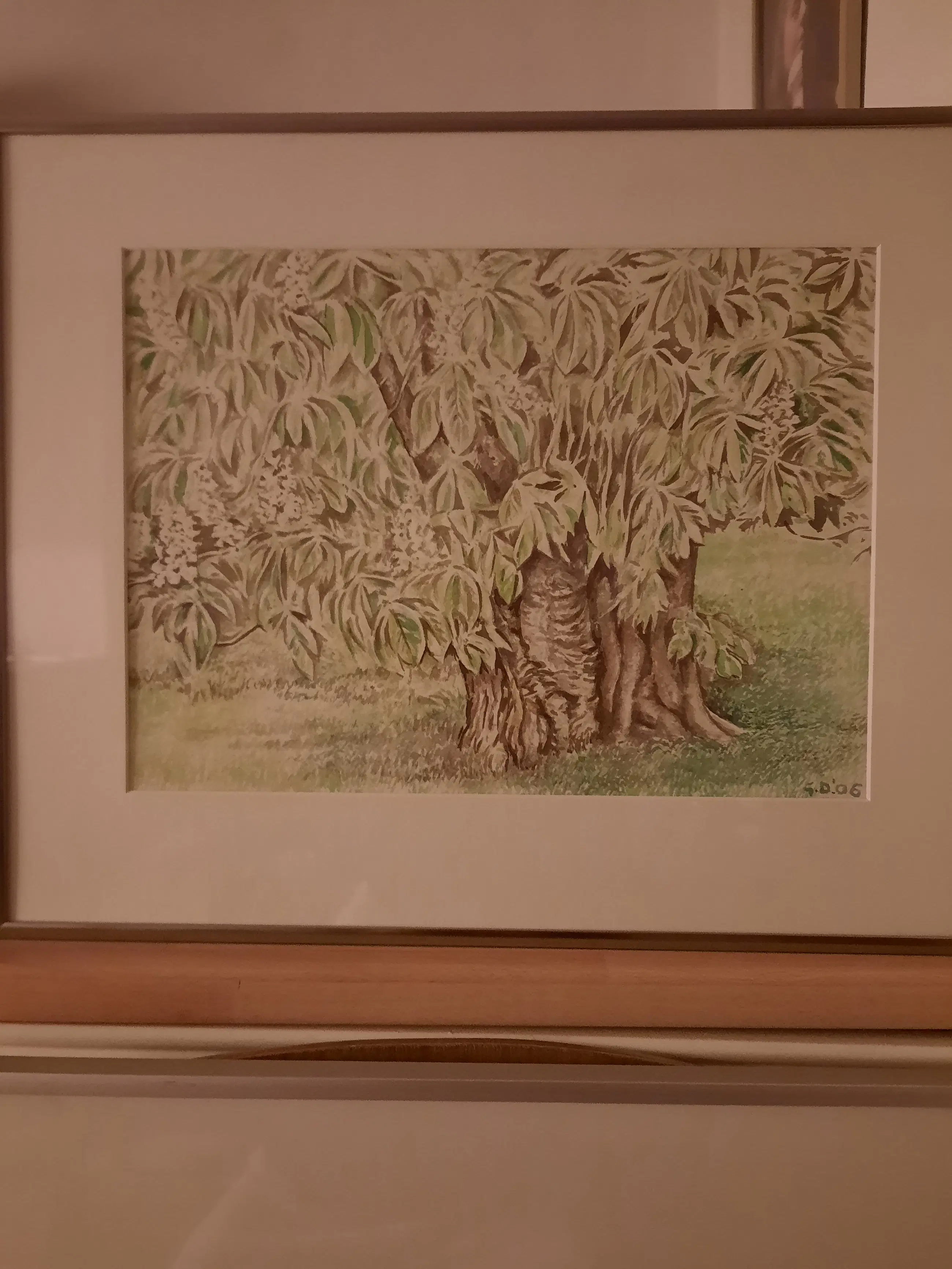 Mooie realistische compositie van bloeiende paardenkastanjeboom. In zeer goede staat verkerende aquarel. Goed ingelijst.