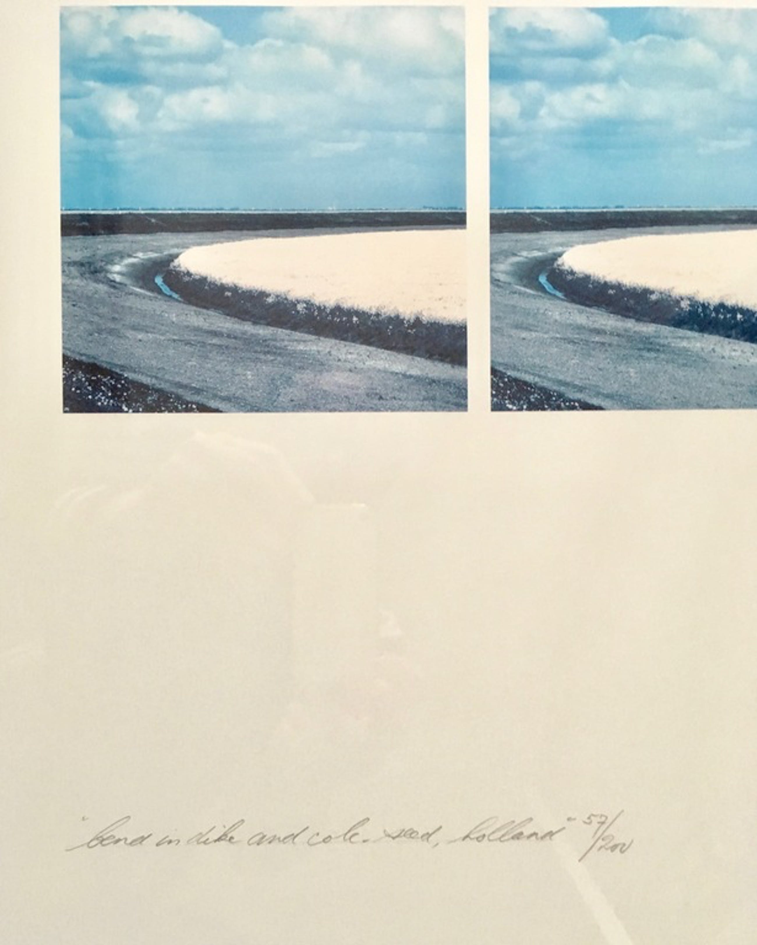Conceptueel fotowerk door Ger Dekkers uit 1998, in offset kleurendruk op affiche, in oplage van 200 exemplaren, gesigneerd en gedateerd in potlood: 'bend in dike and cole-seed, holland', 57/200, Ger Dekkers 1998.