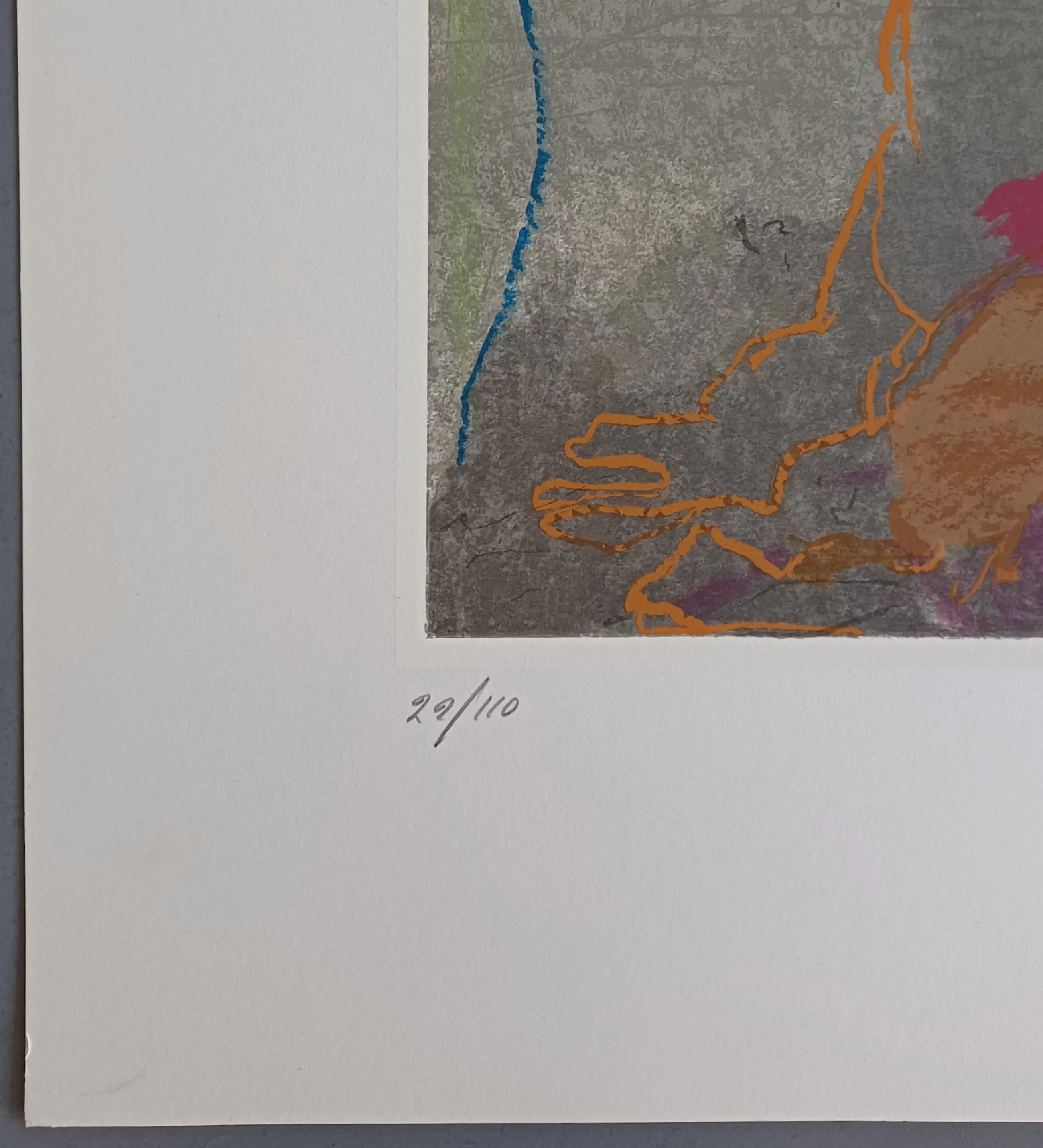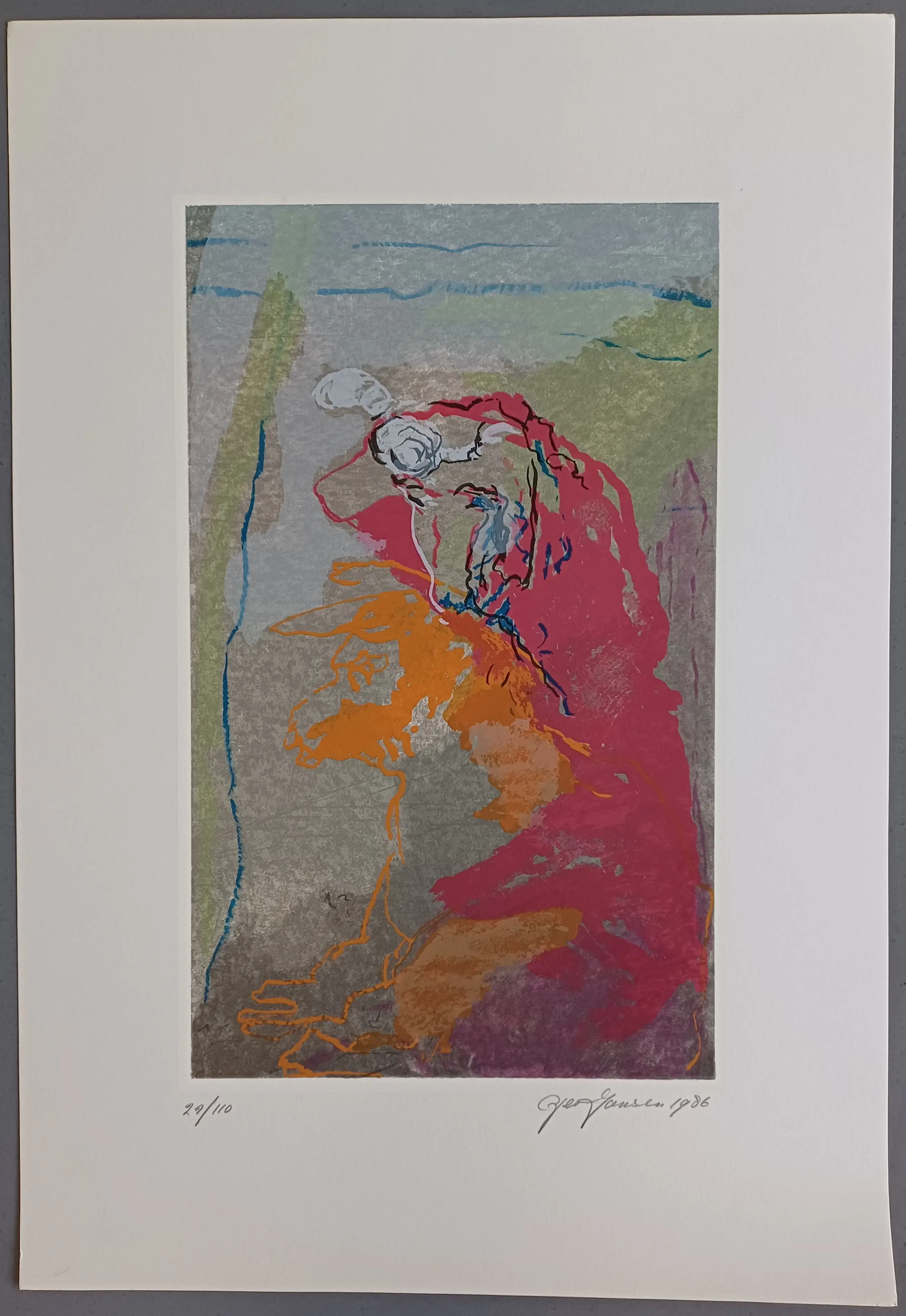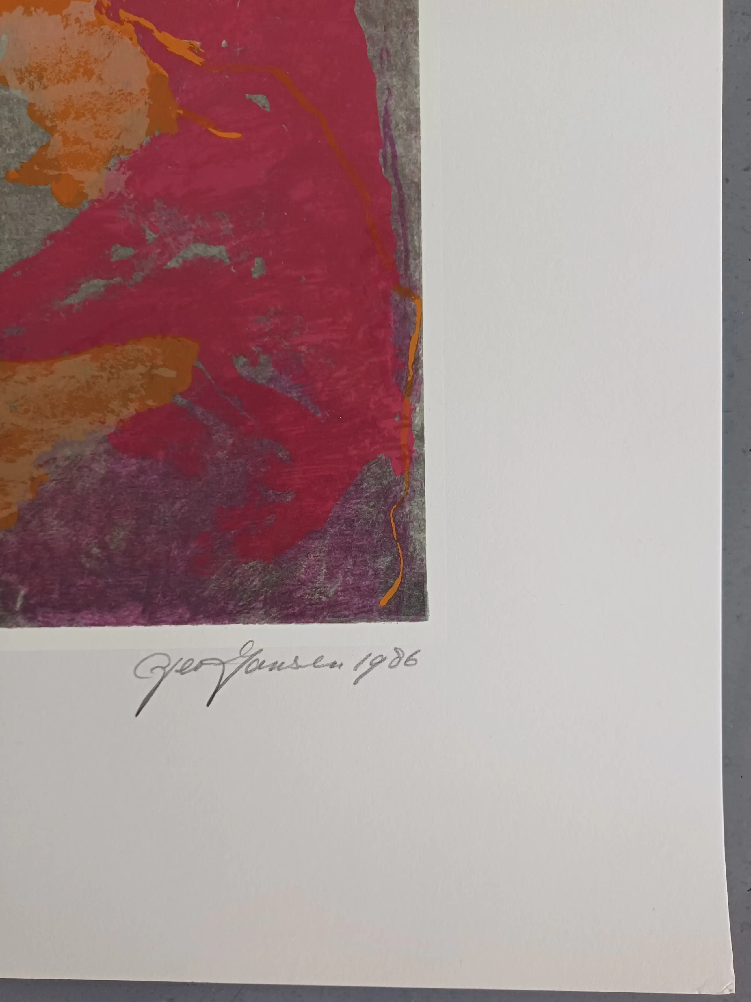 Gesigneerde zeefdruk van de kunstenaar Ger Jansen (1936-2010) uit 1986 met een oplage van 110 stuks. Rechtsonder is het werk gesigneerd in potlood en 1986 Linksonder genummerd met 22/110 Papiermaat 52 x 36 cm. (hxb) Op de hoekjes van het papier zijn zeer kleine stoot vouwtjes zichtbaar en bij de linker onder hoek een klein vlekje, verder is de zeefdruk in prima staat en is nooit ingelijst geweest.