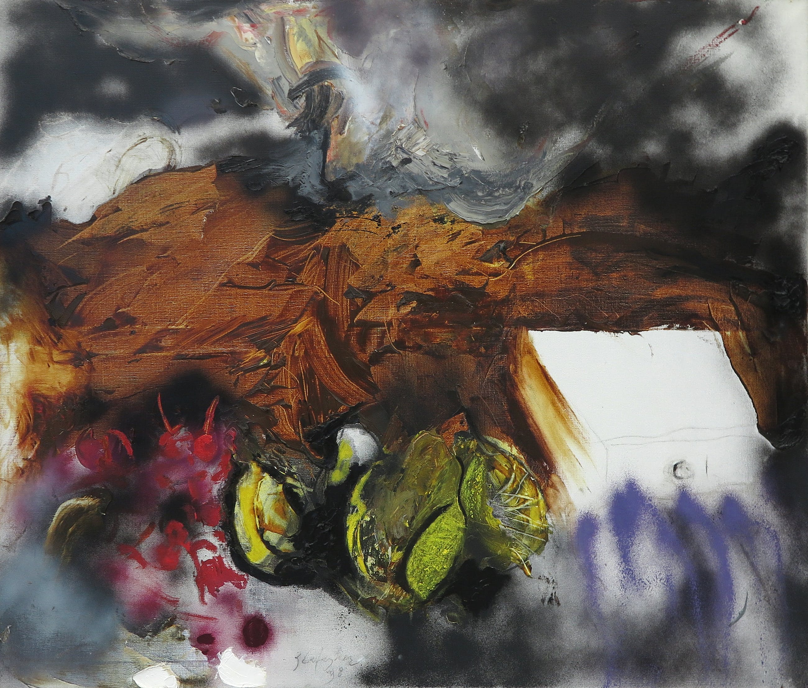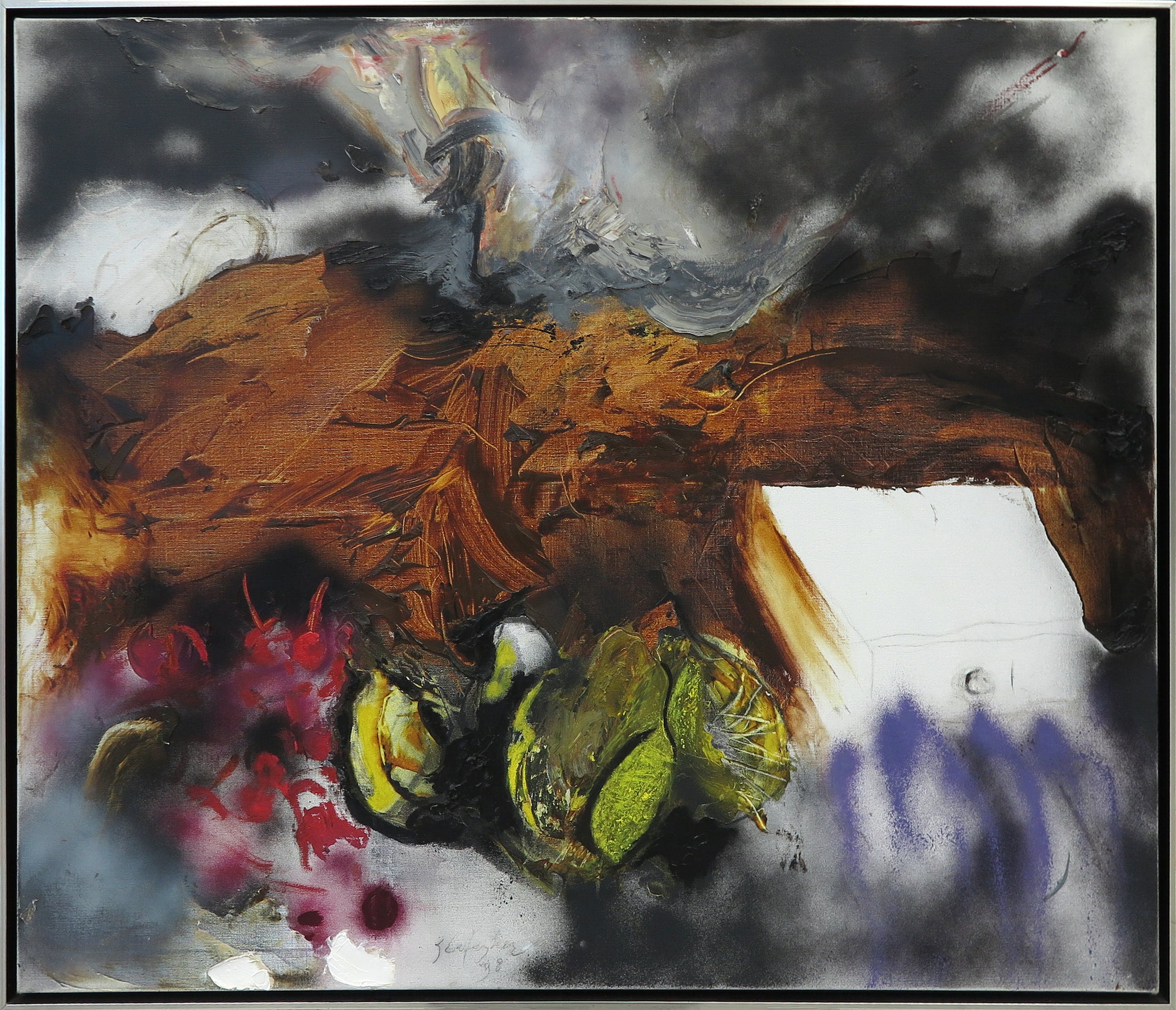 Groot en krachtig werk van Ger Lataster in zijn karakteristieke stijl. Geschilderd in gemengde techniek in olieverf en spuitbus. Het werk is langs de onderste rand gesigneerd en gedateerd.