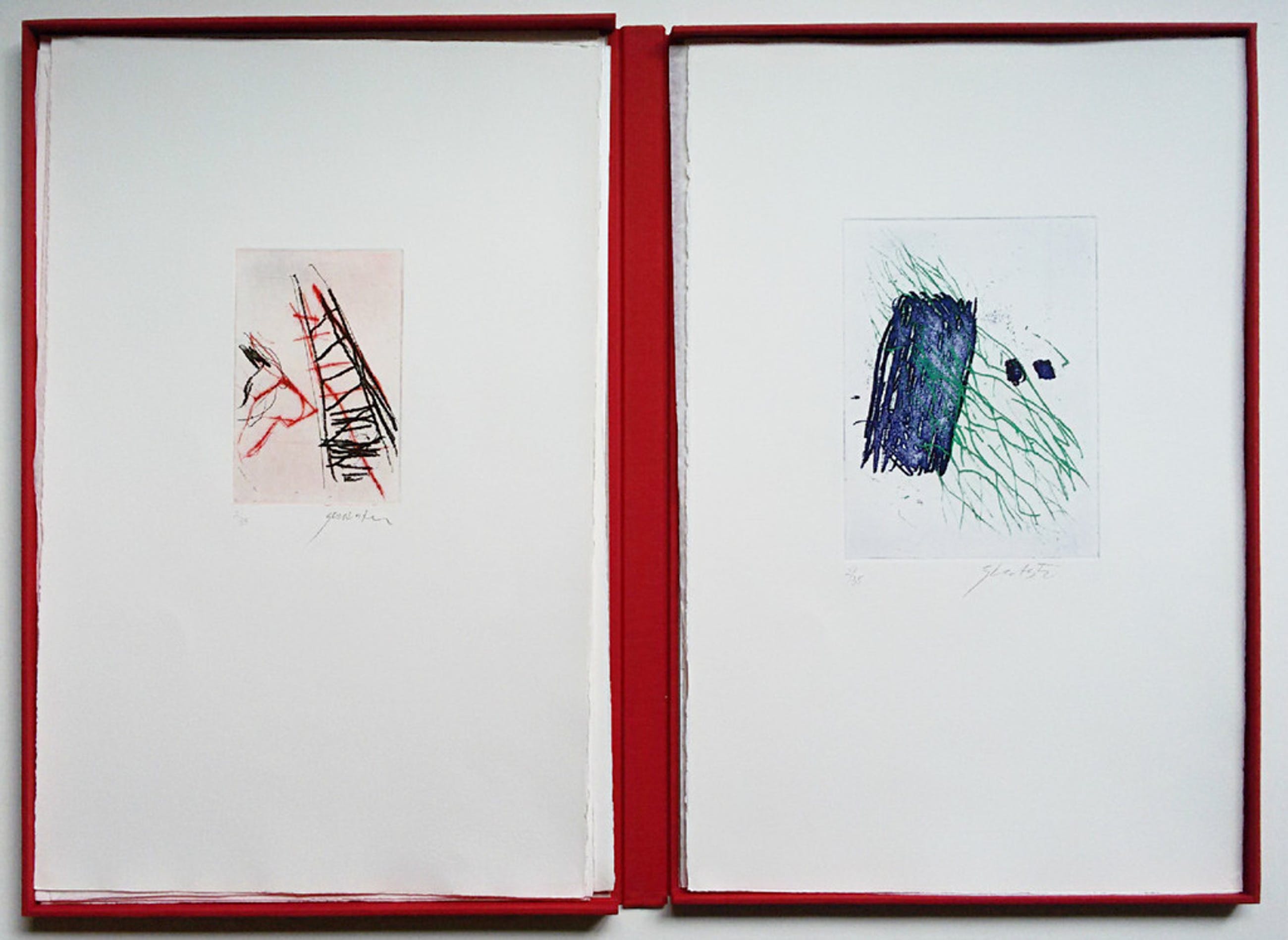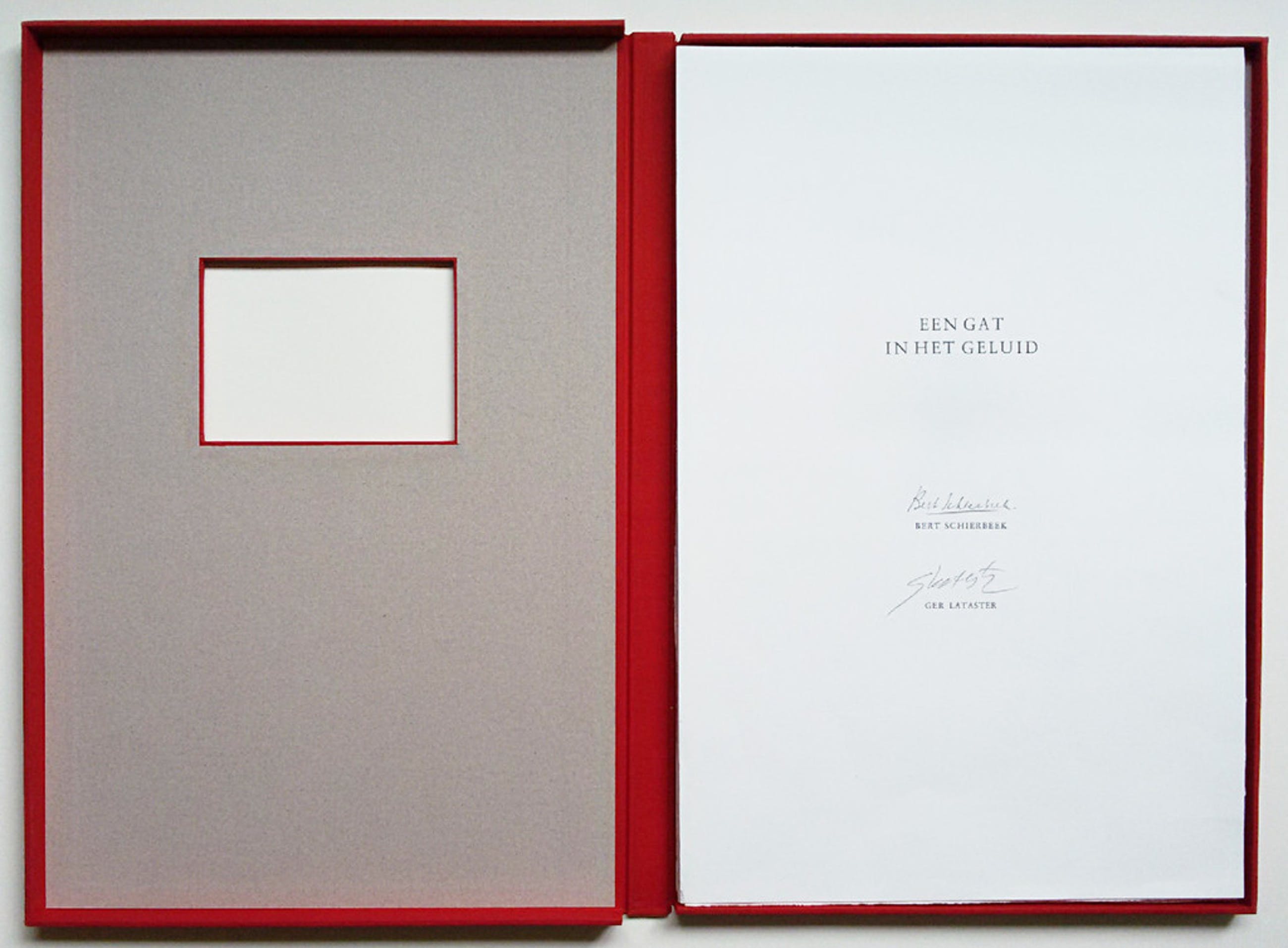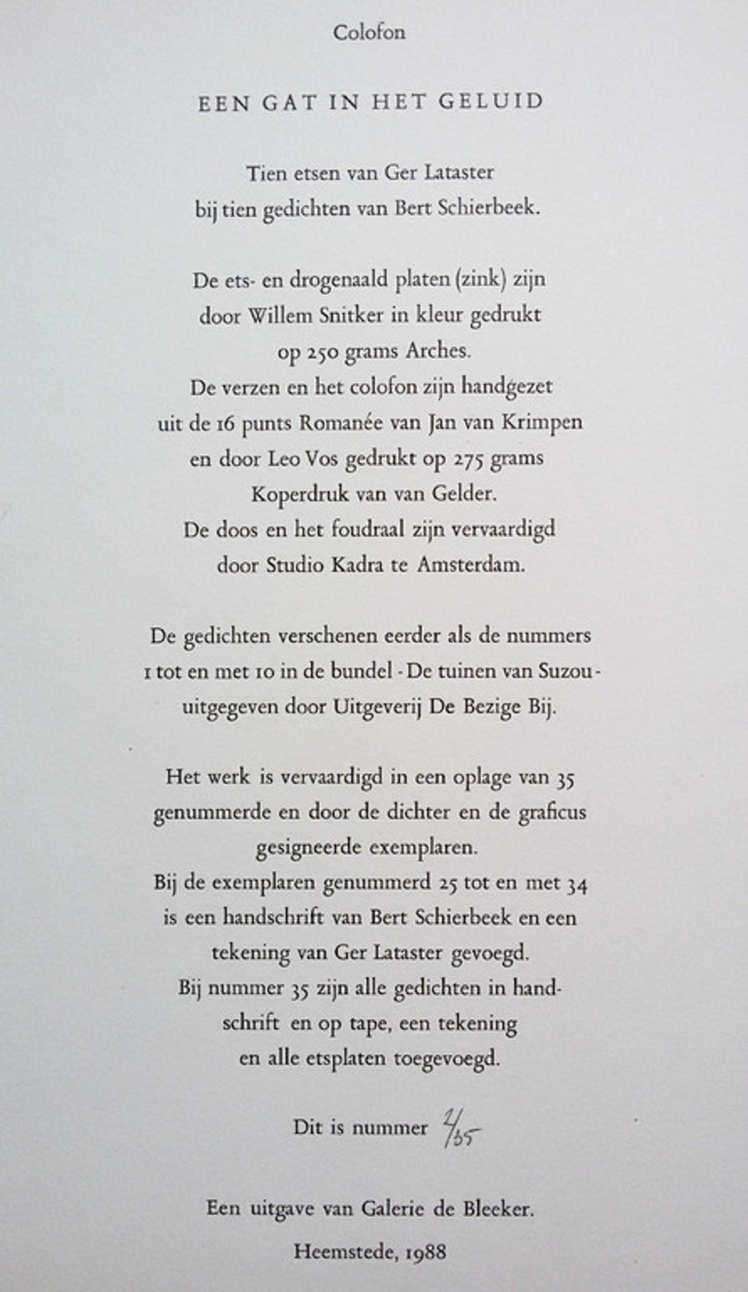 Complete uitgave van Een gat in het geluid van Ger Lataster en Bert Schierbeek. Tien etsen van Lataster bij tien gedichten van Schierbeek. Elke ets op 250 grams Arches papier, met potlood gesigneerd en genummerd (2/35) door Lataster, het titelblad gesigneerd door zowel Ger Lataster als Bert Schierbeek. Uitgegeven door galerie De Bleeker uit Heemstede in 1988. Er zijn van dit werk 35 exemplaren uitgegeven, dit is exemplaar nummer 2.