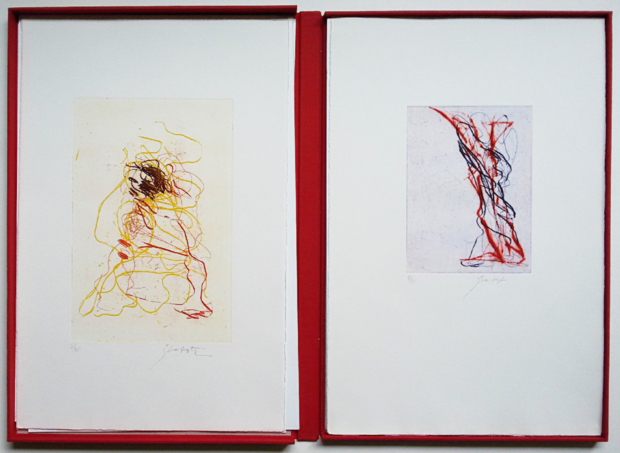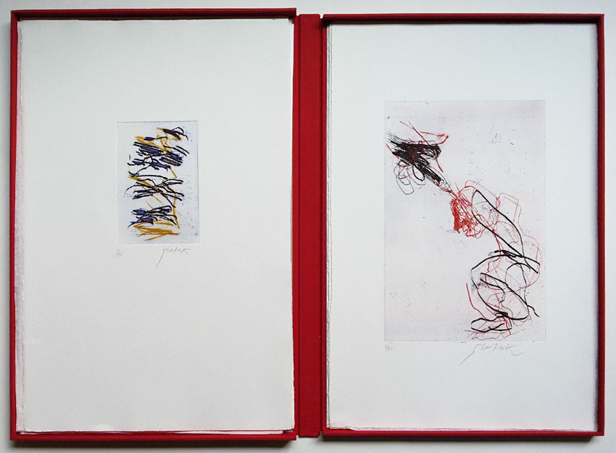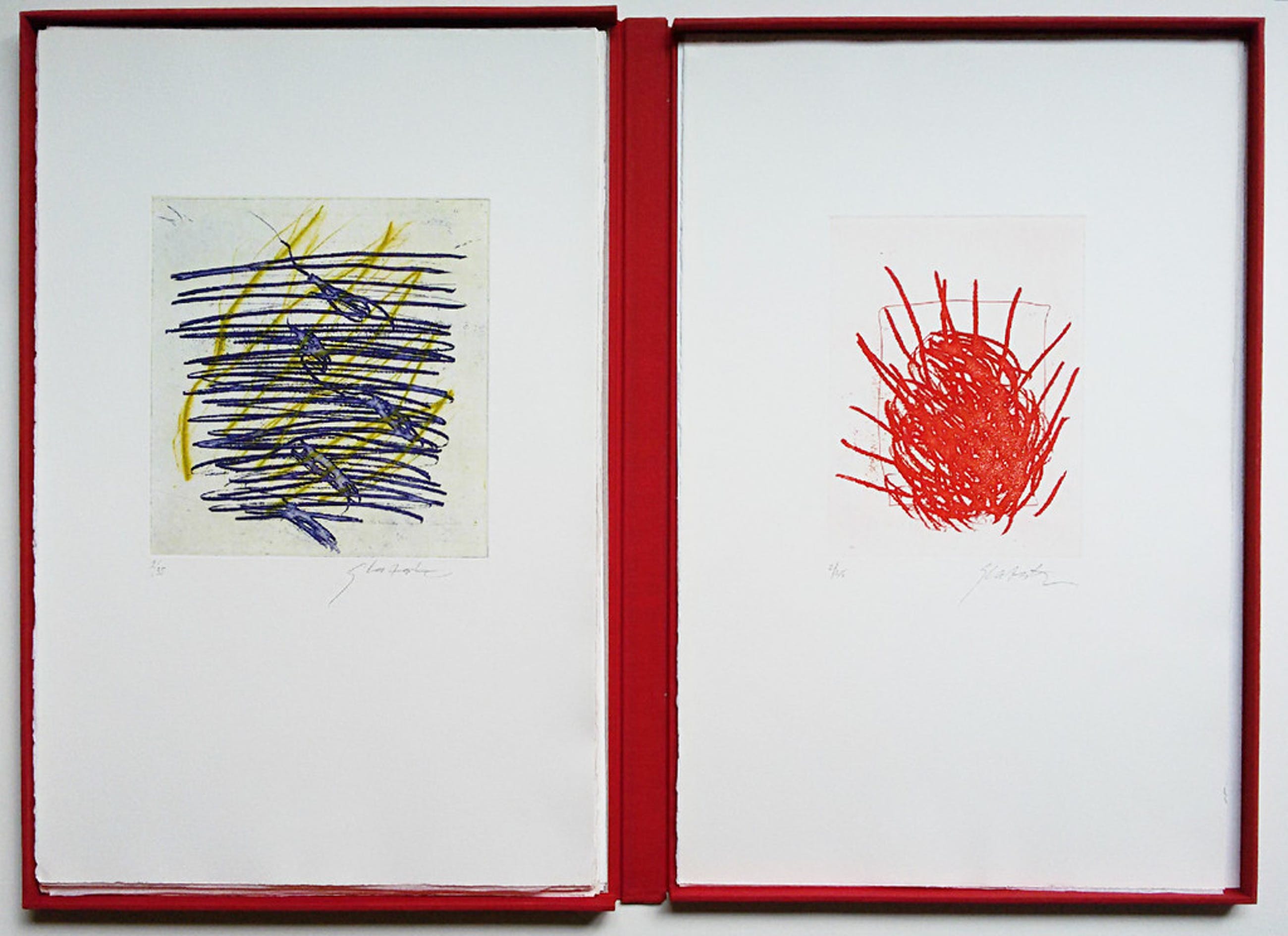 Complete uitgave van Een gat in het geluid van Ger Lataster en Bert Schierbeek. Tien etsen van Lataster bij tien gedichten van Schierbeek. Elke ets op 250 grams Arches papier, met potlood gesigneerd en genummerd (2/35) door Lataster, het titelblad gesigneerd door zowel Ger Lataster als Bert Schierbeek. Uitgegeven door galerie De Bleeker uit Heemstede in 1988. Er zijn van dit werk 35 exemplaren uitgegeven, dit is exemplaar nummer 2.