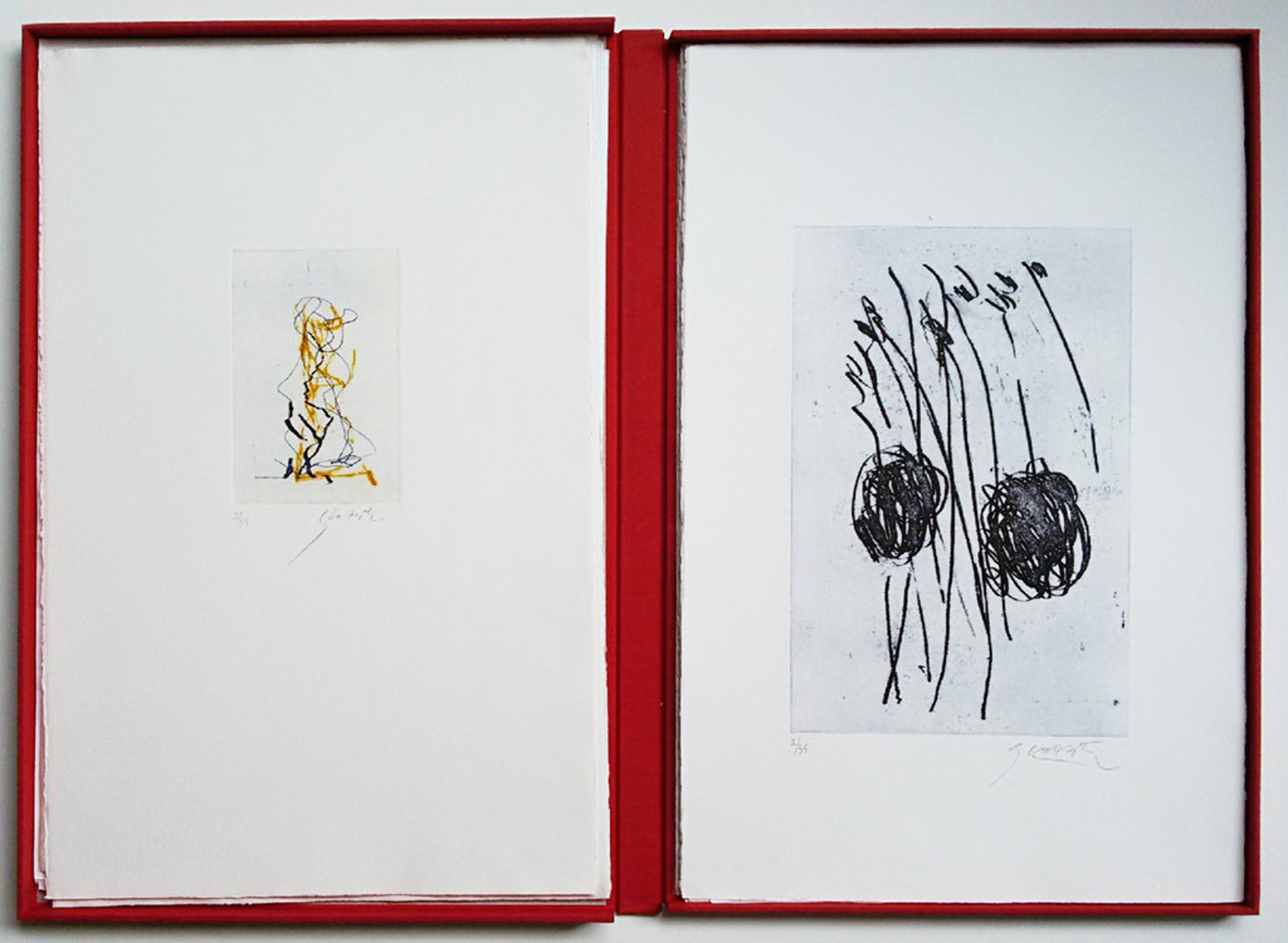 Afmetingen: 53cm x 36cm (foudraal), 50cm x 33cm (bladen), afmetingen etsen varieren