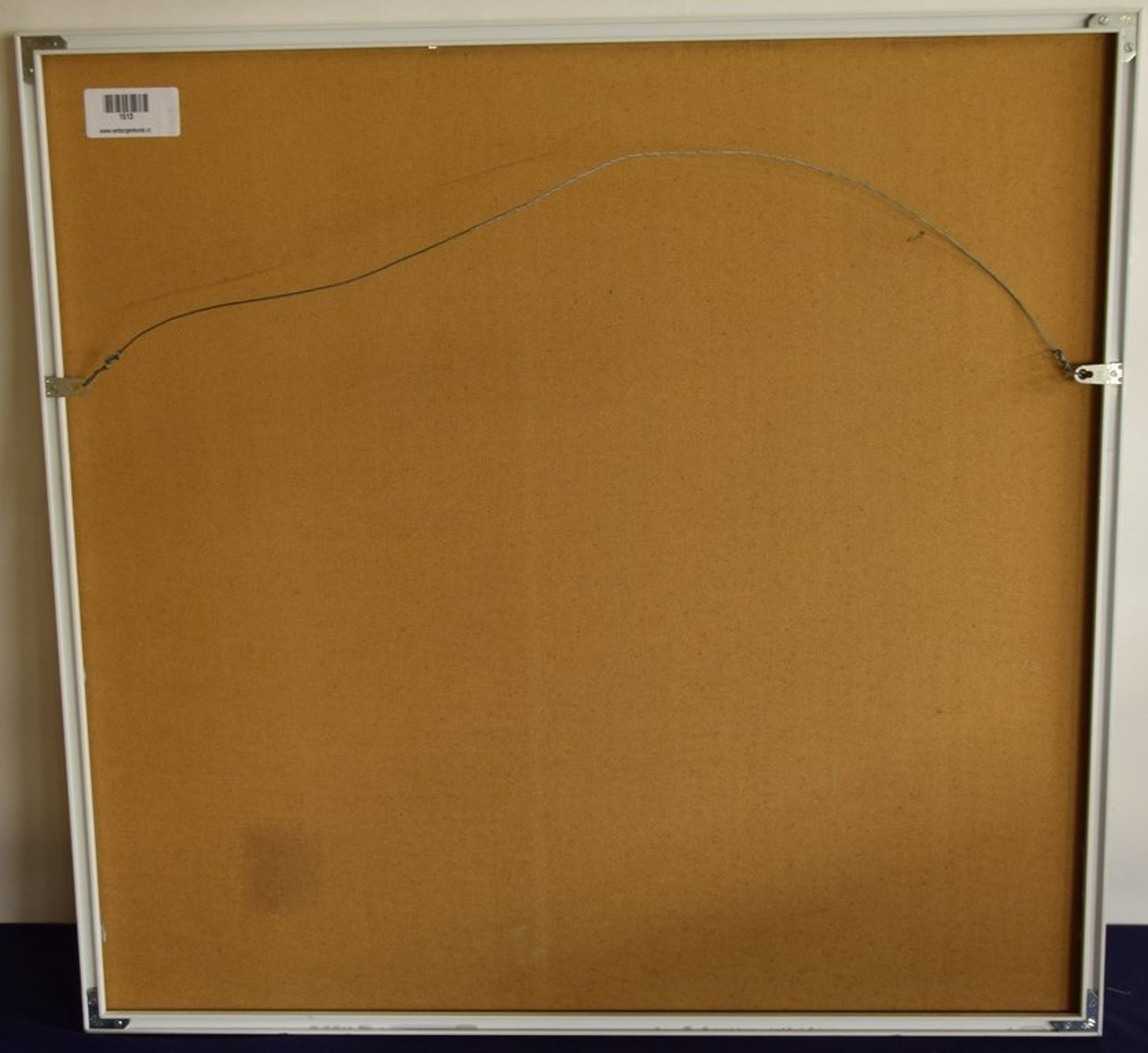 Het werk is verder zeer strak ingelijst in een witte aluminium lijst, hiervan is de glasplaat echter wel gebroken.
