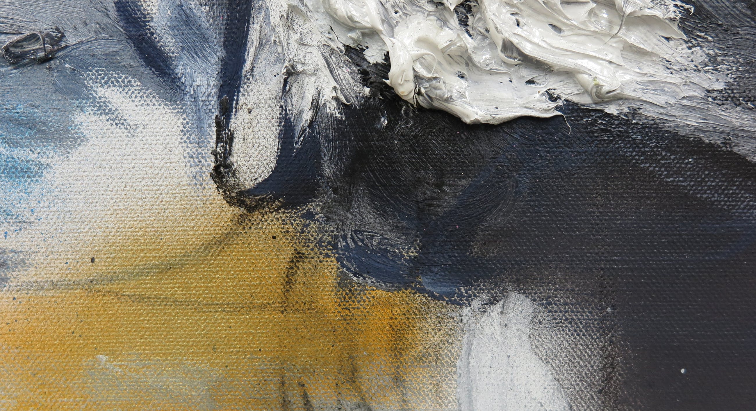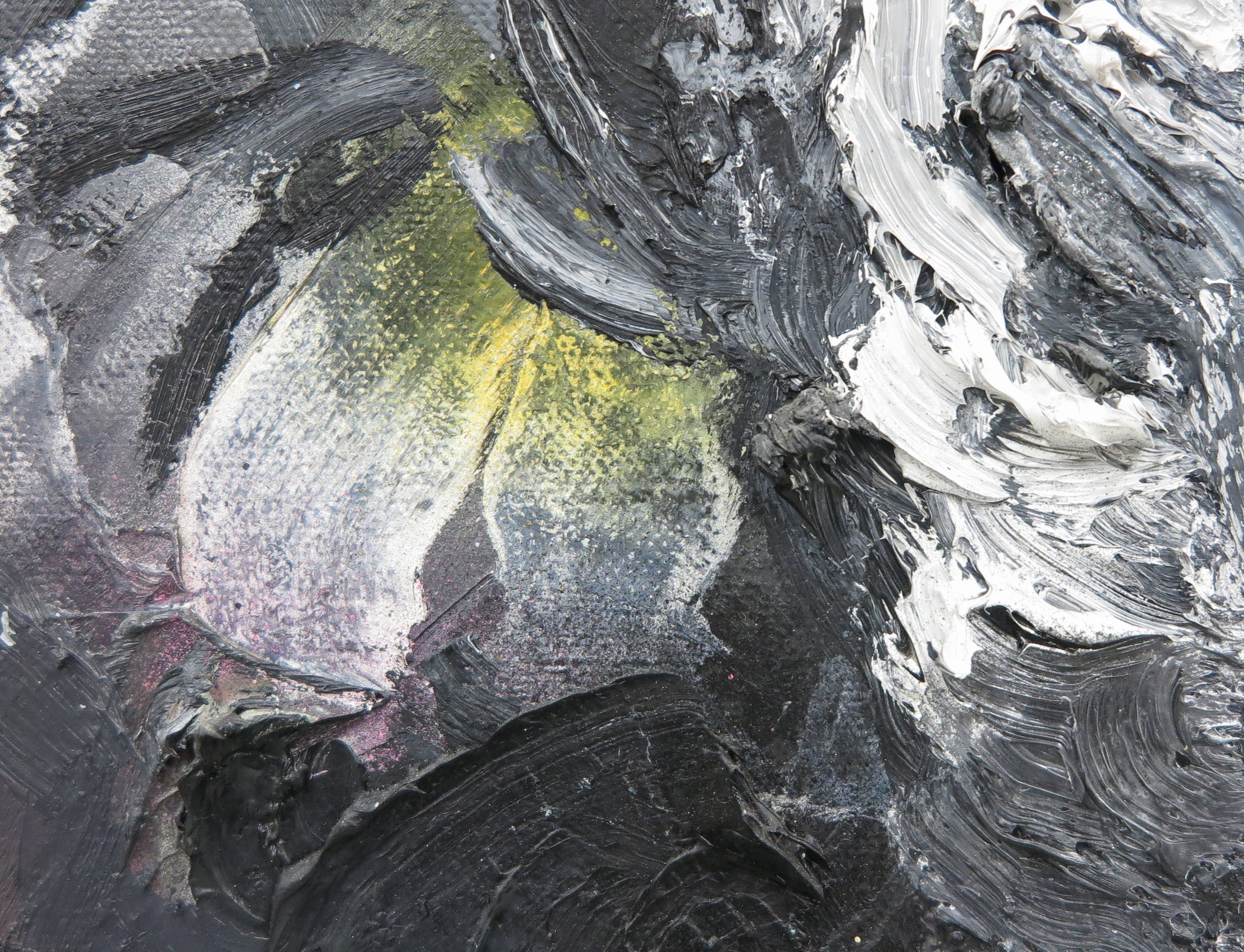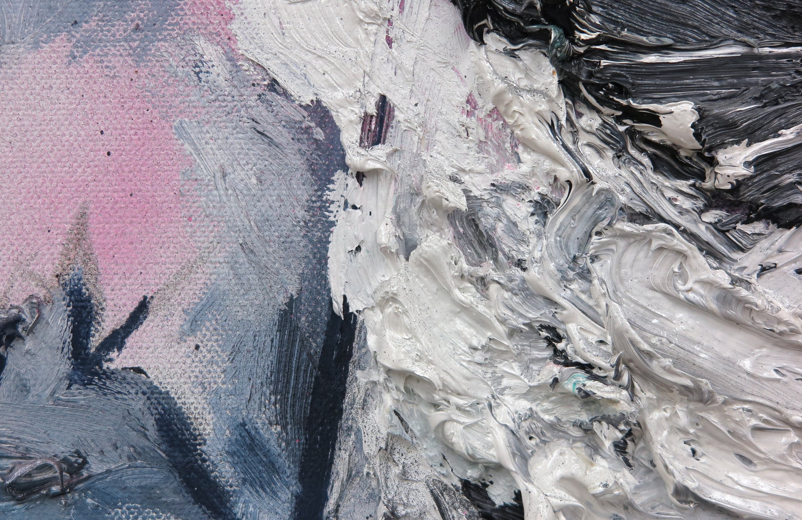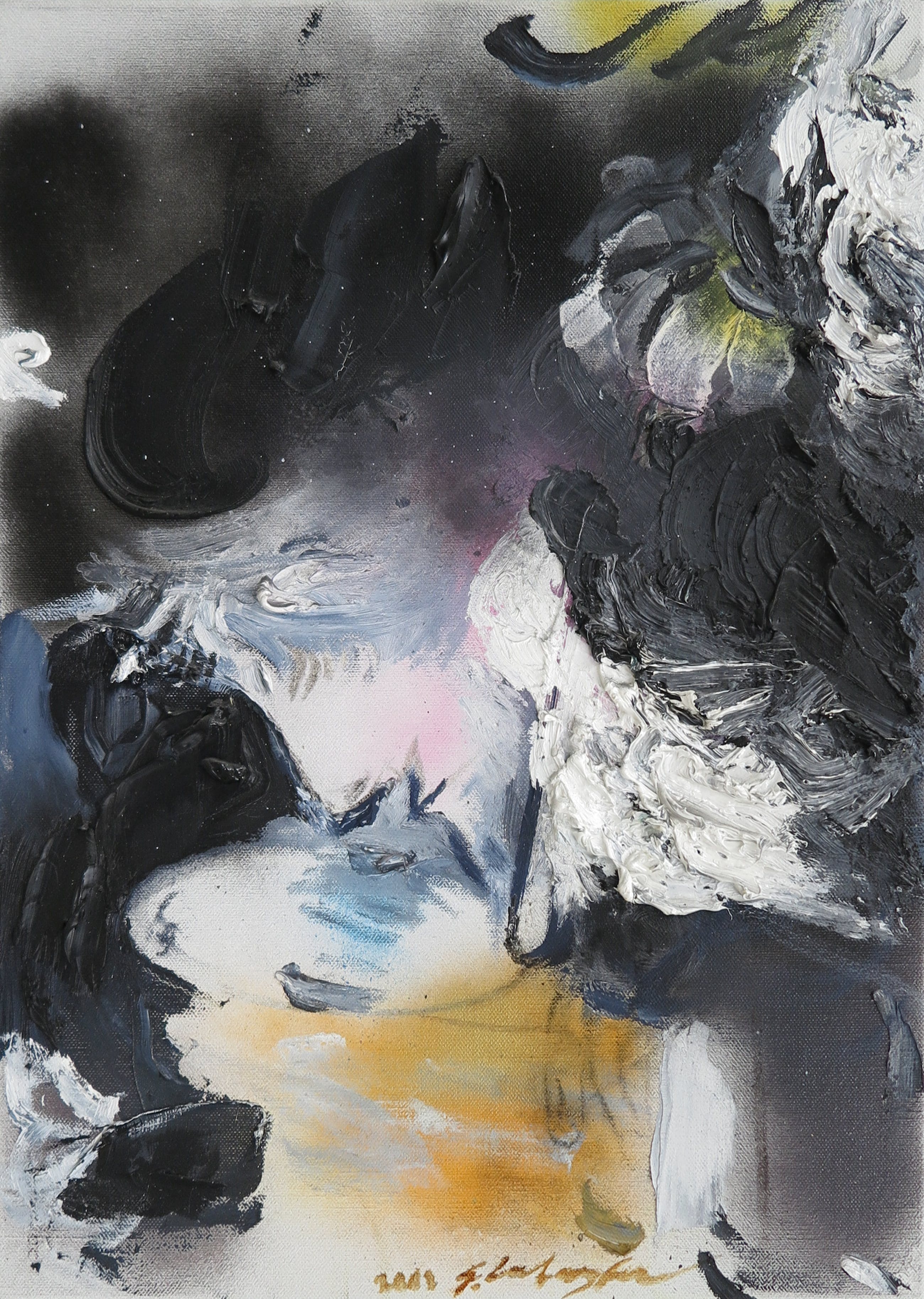 Zeer sprekende compositie in impasto (olieverf) en spuitbus op doek in wit, zwart en grijstinten en kleuraccenten in roze, oranje en geel, in de kenmerkende stijl van Lataster. Het werk is gevat in een houten baklijst met zilverkleurige rand.