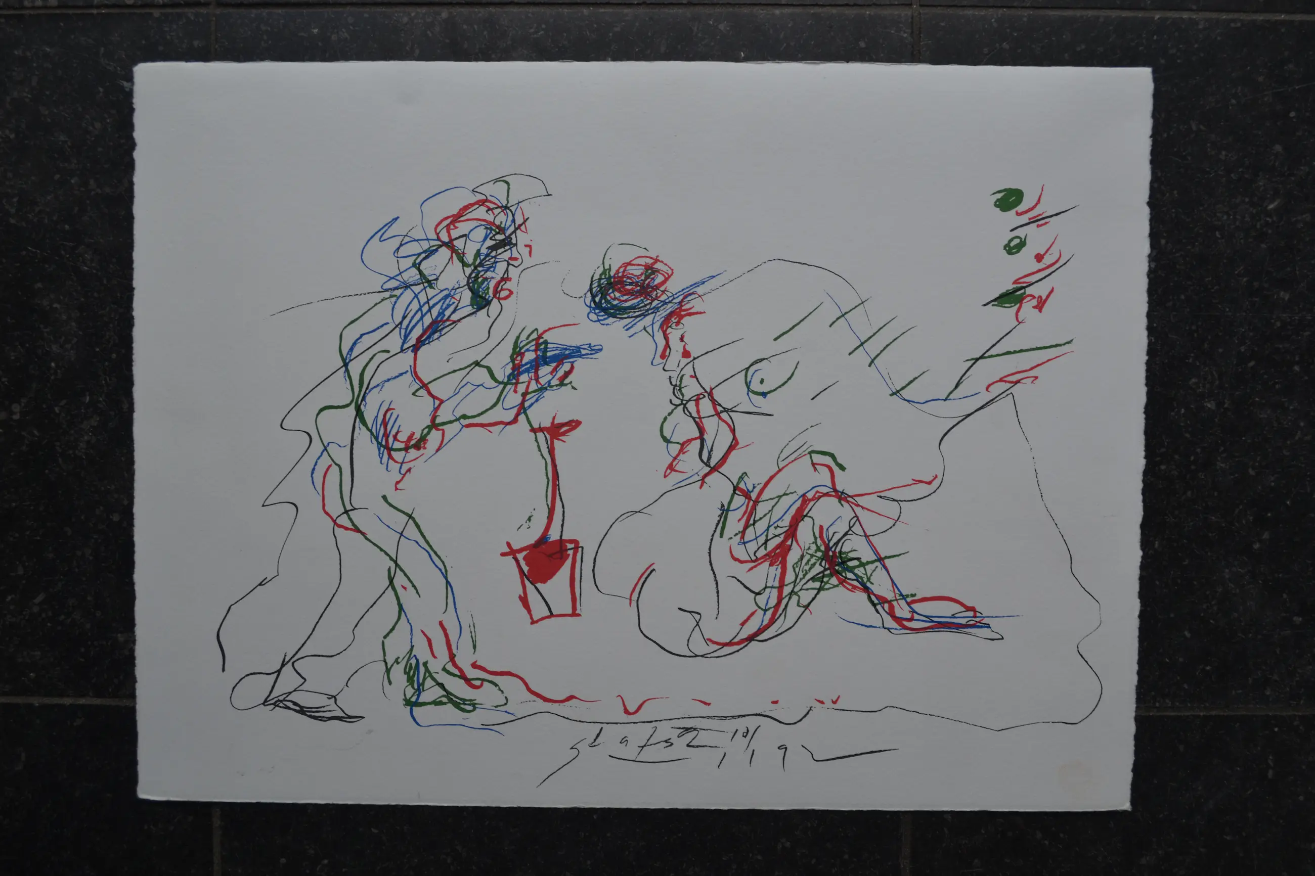 Fraaie kleurenlithografie van Ger Lataster gedrukt op dik geschept papier, 1992. In de druk gesigneerd. Wordt goed verpakt en aangetekend verstuurd.