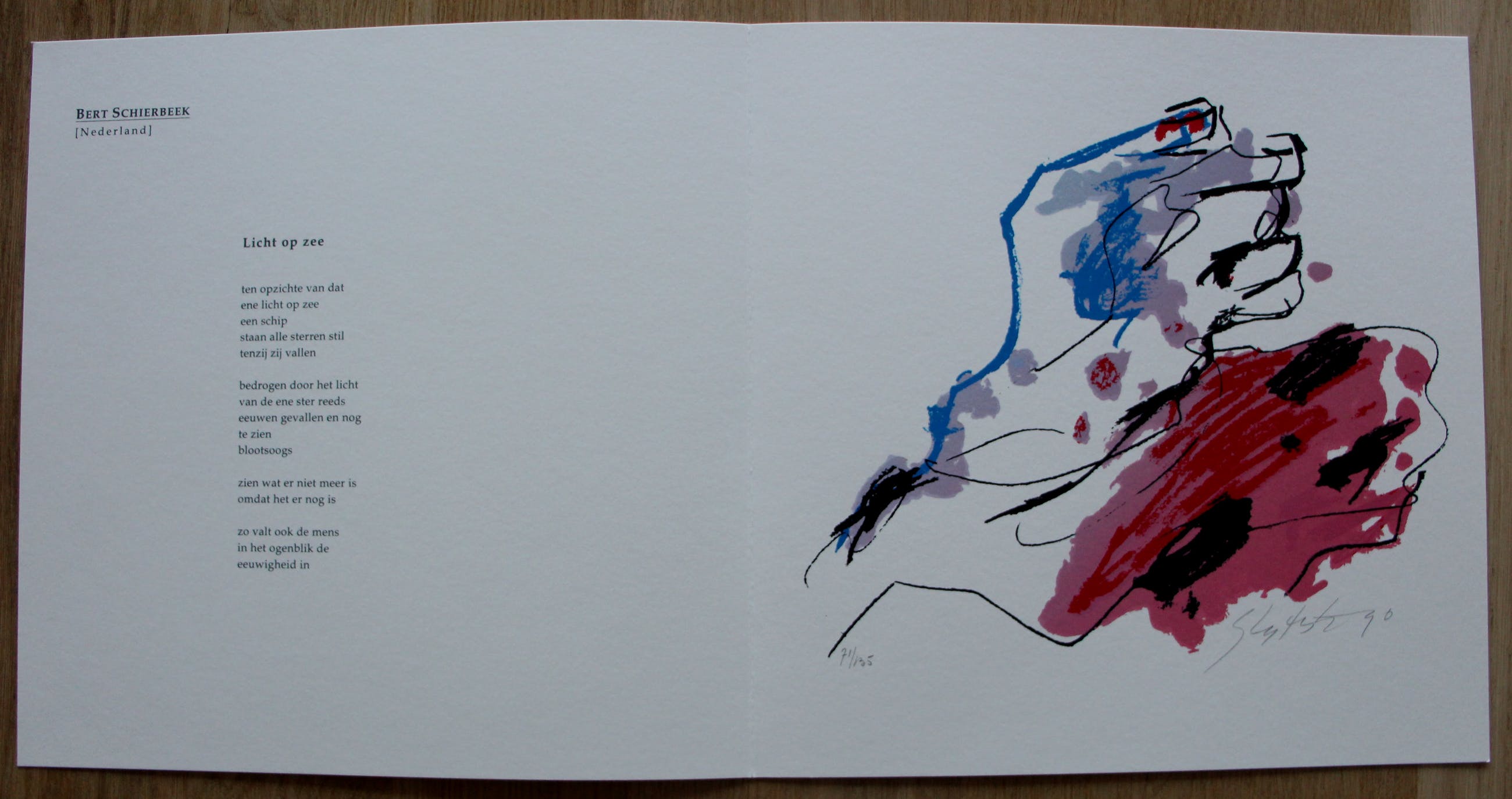 Zeefdruk van Ger Lataster. Met een gedicht van Bert Schierbeek: Licht op zee. Jaar: 1990. Nummer: 26/135. Afmetingen werk: H32 x b32cm. Afmetingen voorstelling: H28 x b28cm. Het werk is rechts onderaan, met potlood, gesigneerd door de kunstenaar. De authenticiteit van het, aangeboden, werk wordt volledig gegarandeerd. Een certificaat van echtheid kan, op aanvraag, worden gemaild.