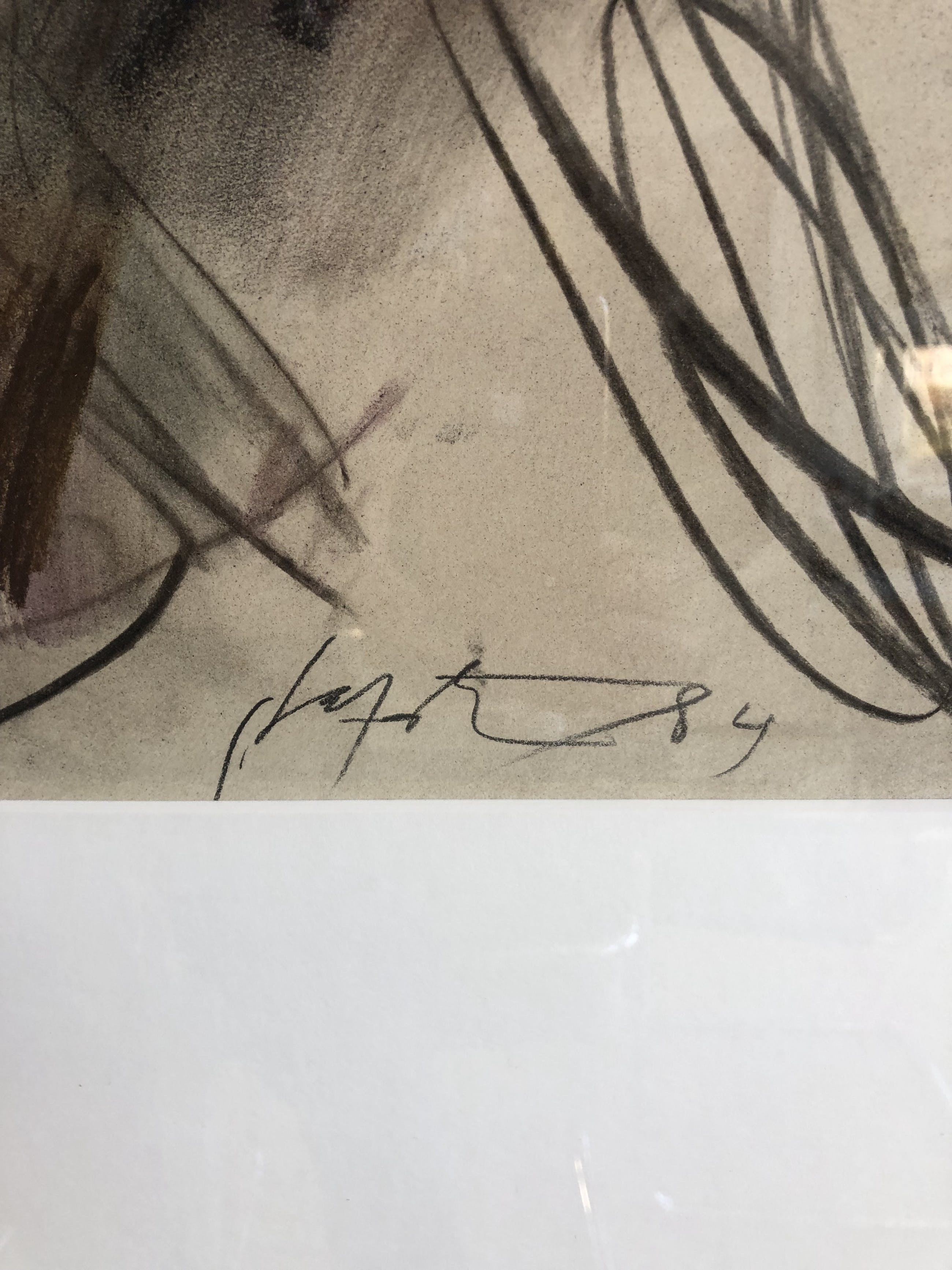 Originele tekening van Ger Lataster in prima conditie. Kan zo aan de muur worden opgehangen.Wij hebben een grote collectie Lataster en dit is een kenmerkende tekening binnen zijn oeuvre.U kunt het kunstwerk vooraf bekijken bij galerie Rotor in Gorinchem.Het is voor de conditie van het werk beter om hem in de lijst te houden en daarom adviseren wij het werk te komen ophalen of per koerier te laten bezorgen.Er is enige spiegeling bij het maken van de foto.