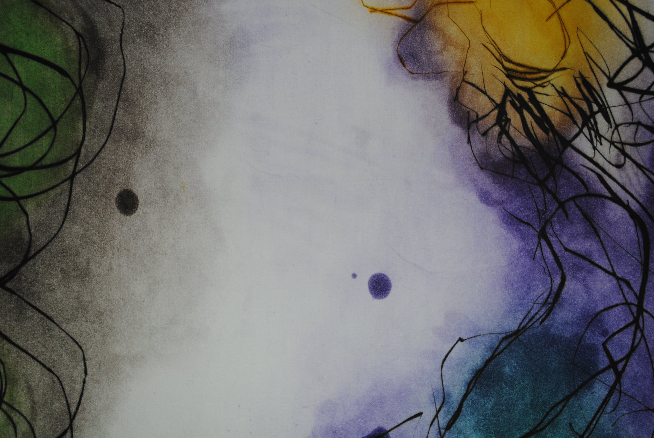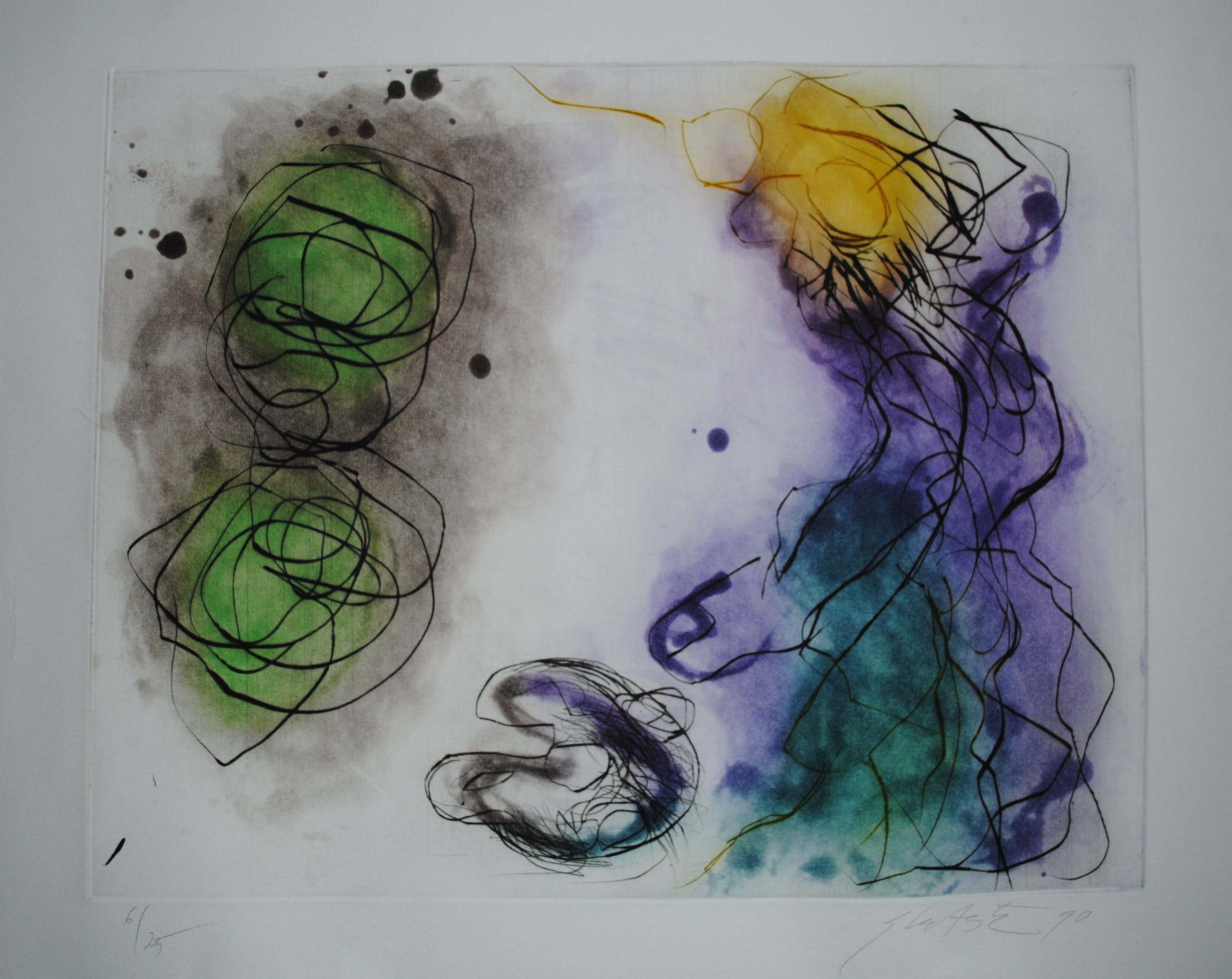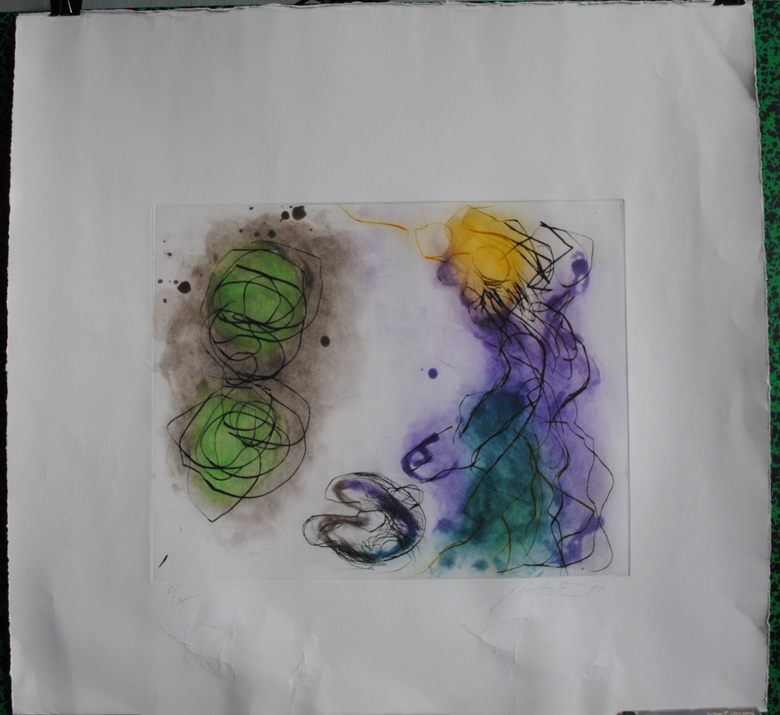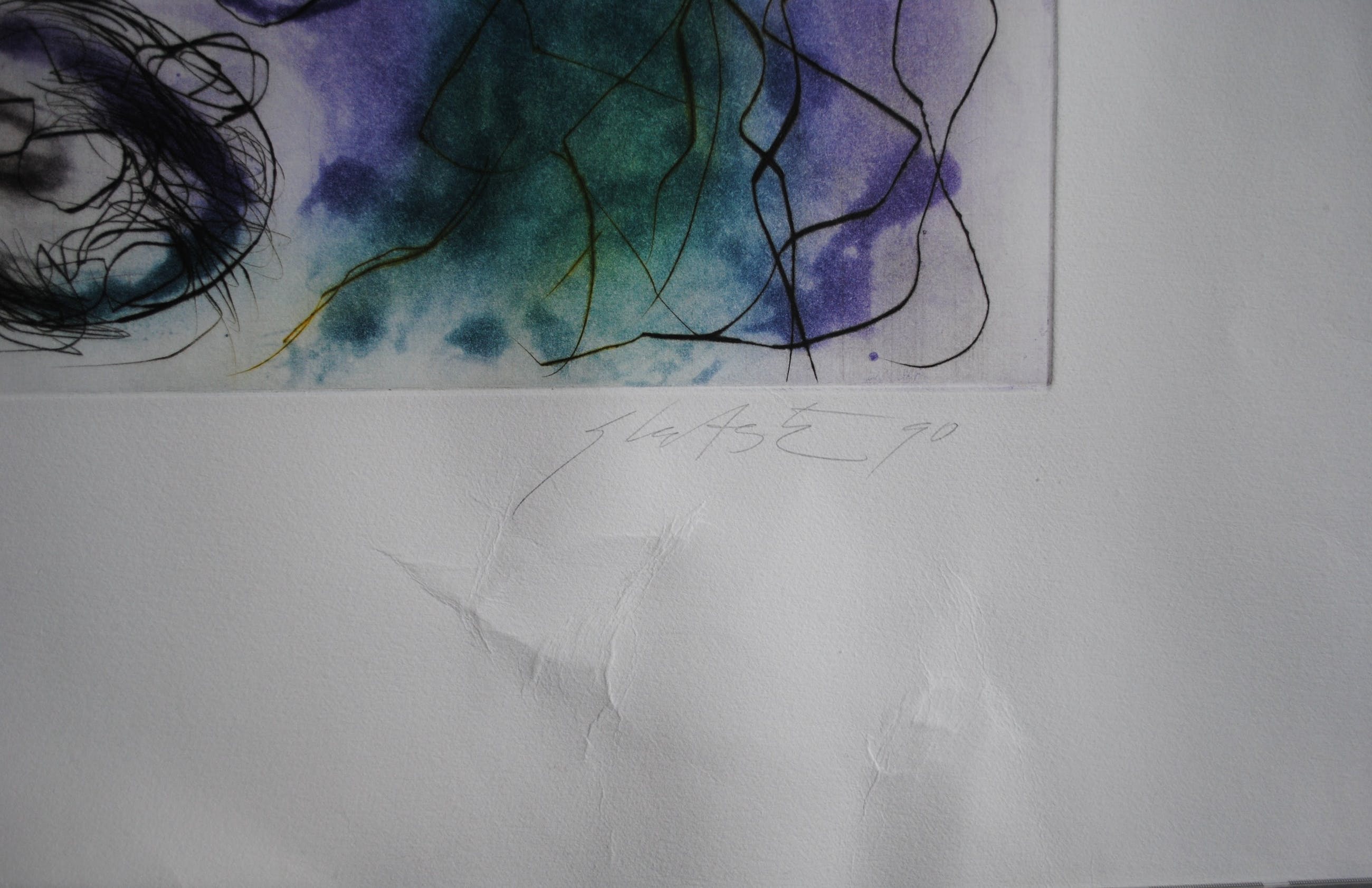 Kleurenets van Ger Lataster uit 1990 z.t., voorstellende de kunstenaar met zijn palet. Handgesigneerd, gedateerd en genummerd 6/25 met potlood. Formaat blad: 76 x 79 cm. Formaat afbeelding: 39 x 49 cm.