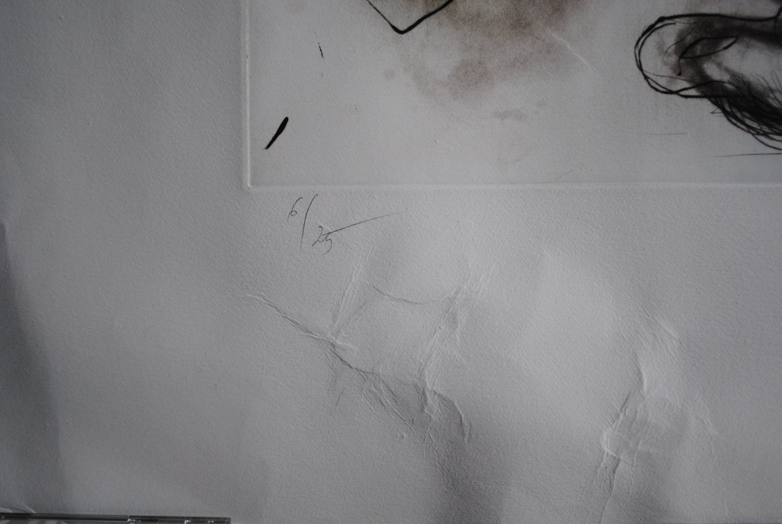 Het blad is nogal gekreukt, met name buiten de afbeelding. Bij gebruik van een passe-partout vallen de kreuken buiten de afbeelding weg en zal het geheel er vrij redelijk uitzien (zie foto 5). De ets wordt aangetekend verzonden in een stevige, ruime koker.