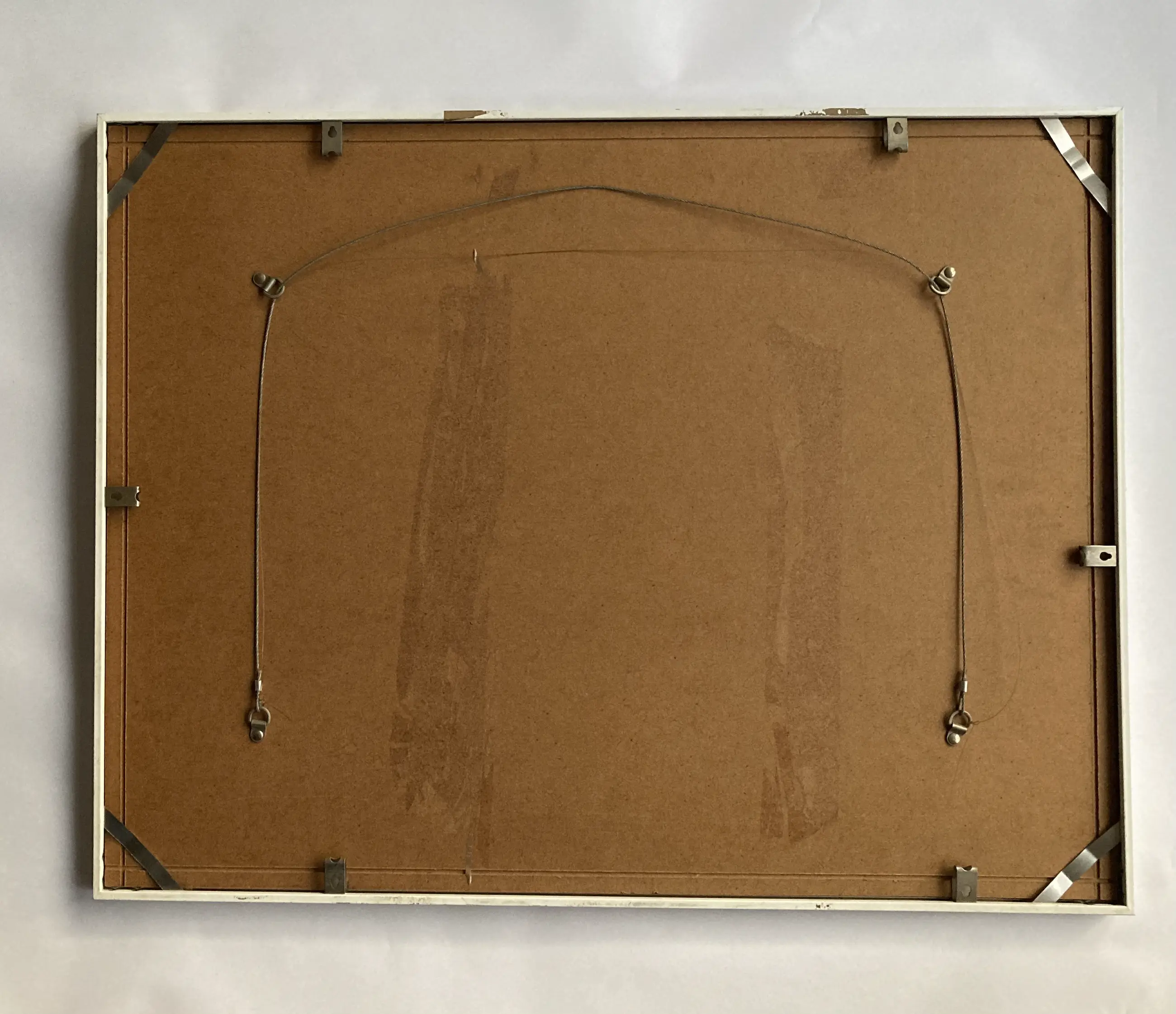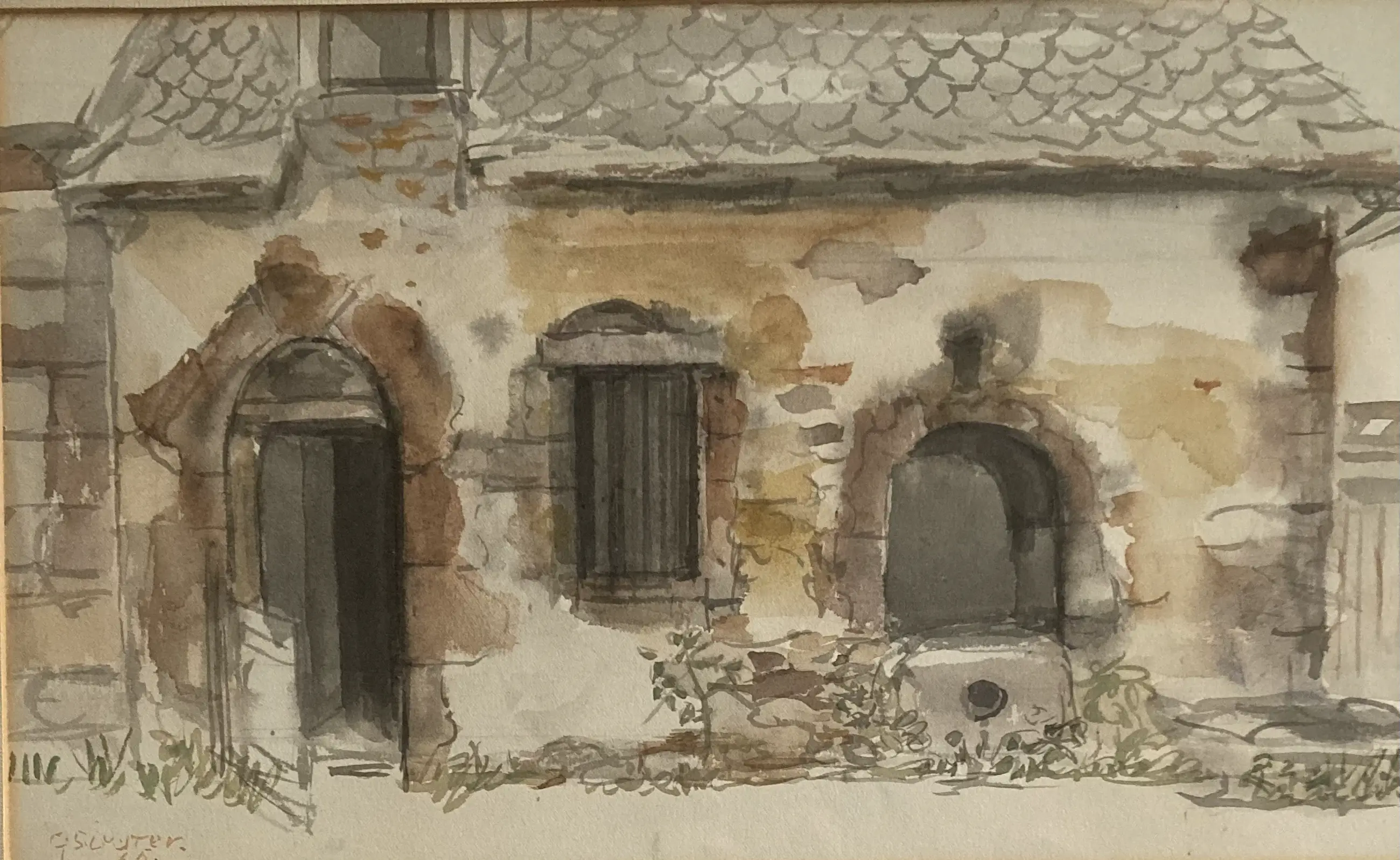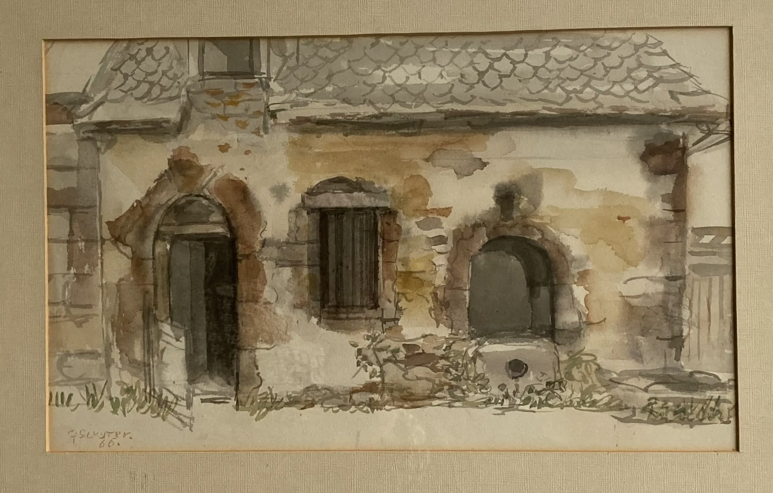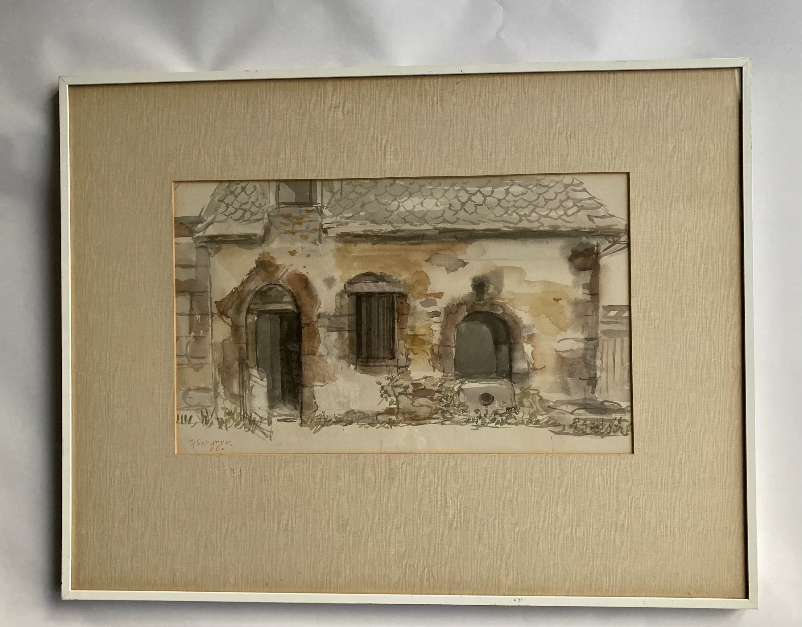 Aquarel van Ger Sluijter ingelijst onder passe partout en glas in een wit aluminium lijst. Afbeelding van een huis, in de stijl van Marius Bauer.