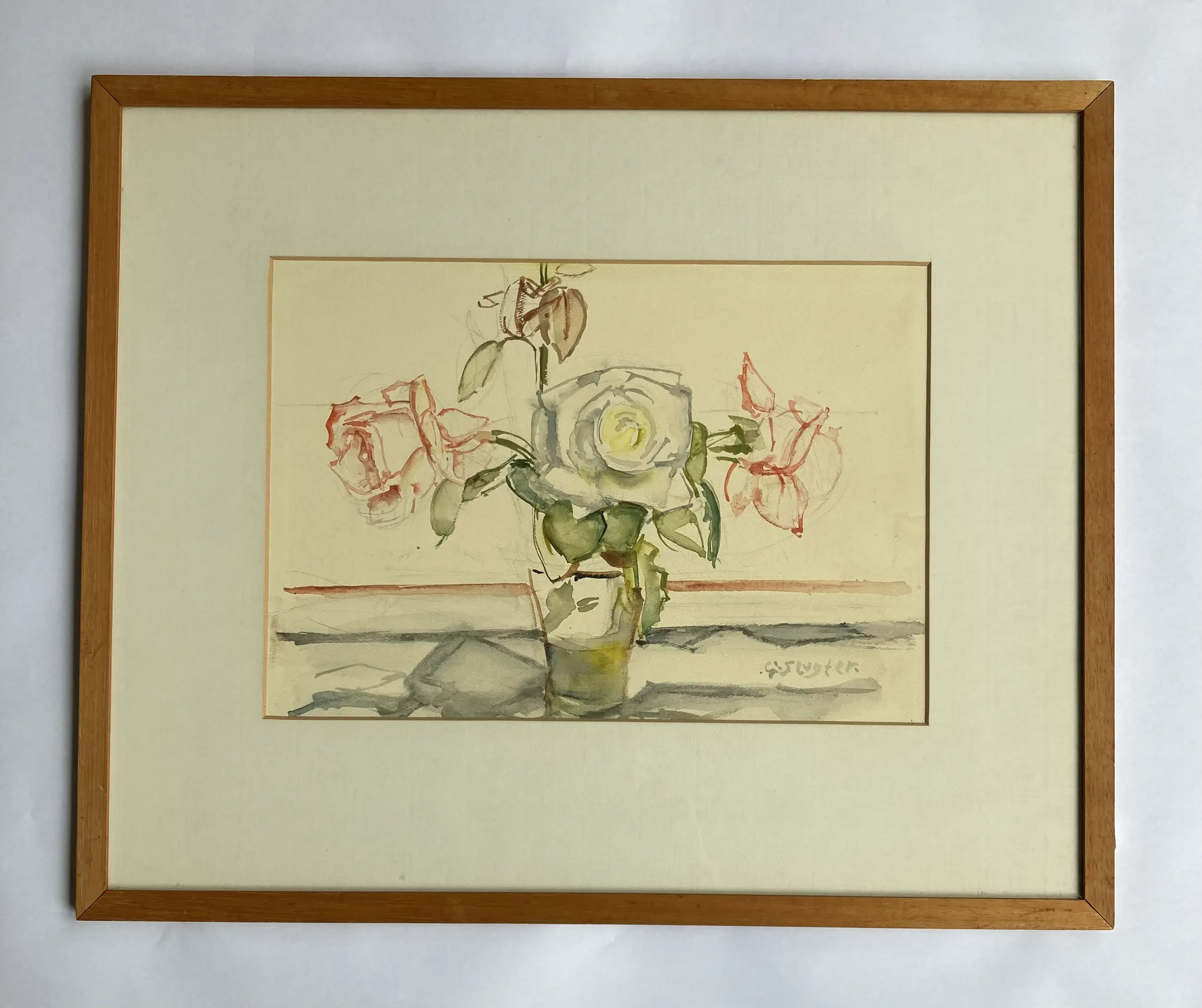 Aquarel van Ger Sluijter ingelijst in een eenvoudige baklijst. Op het sfeervolle kunstwerk zie je op de achtergrond potloodstrepen, van de voorschets? Mij onbekend.