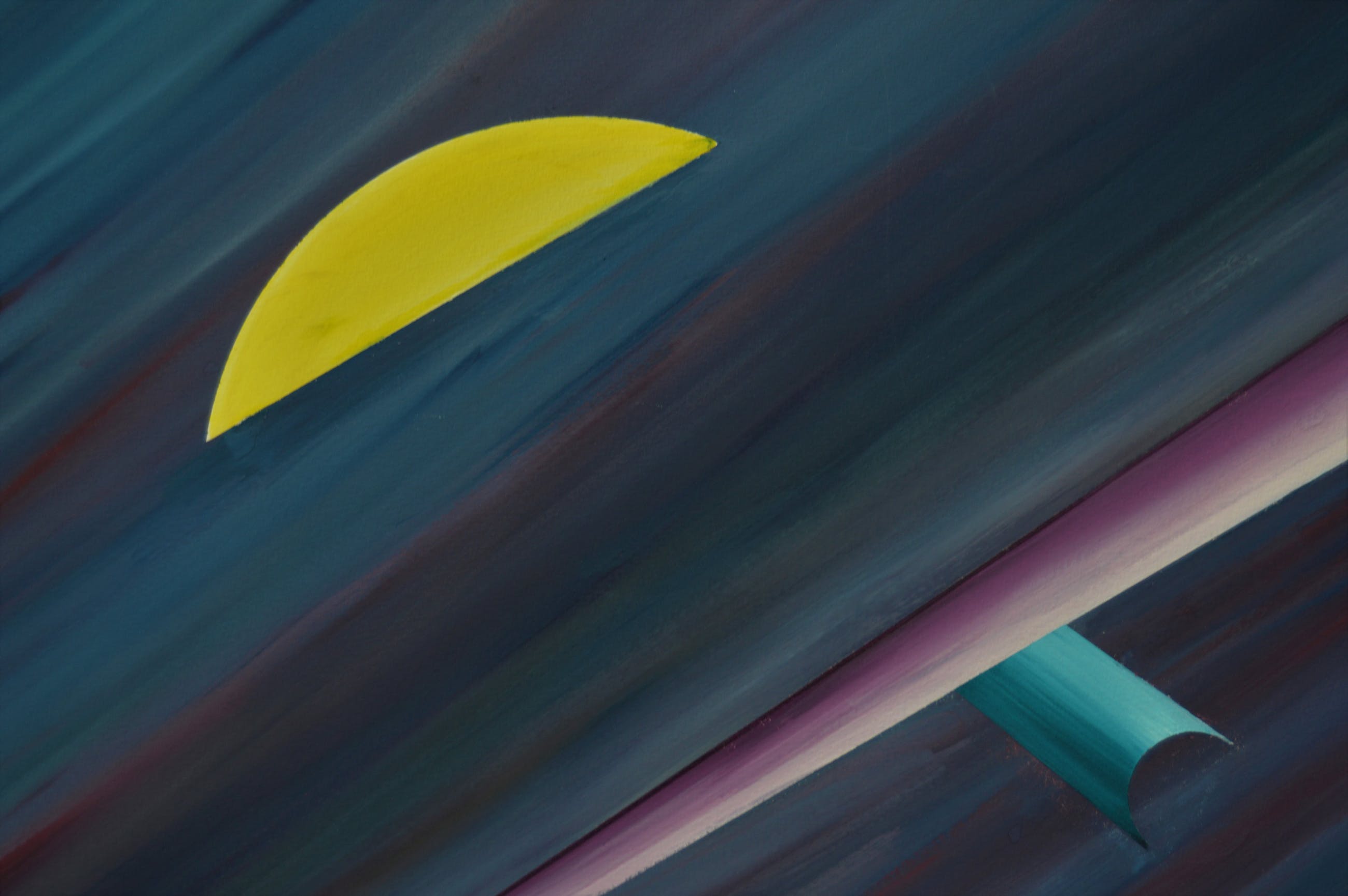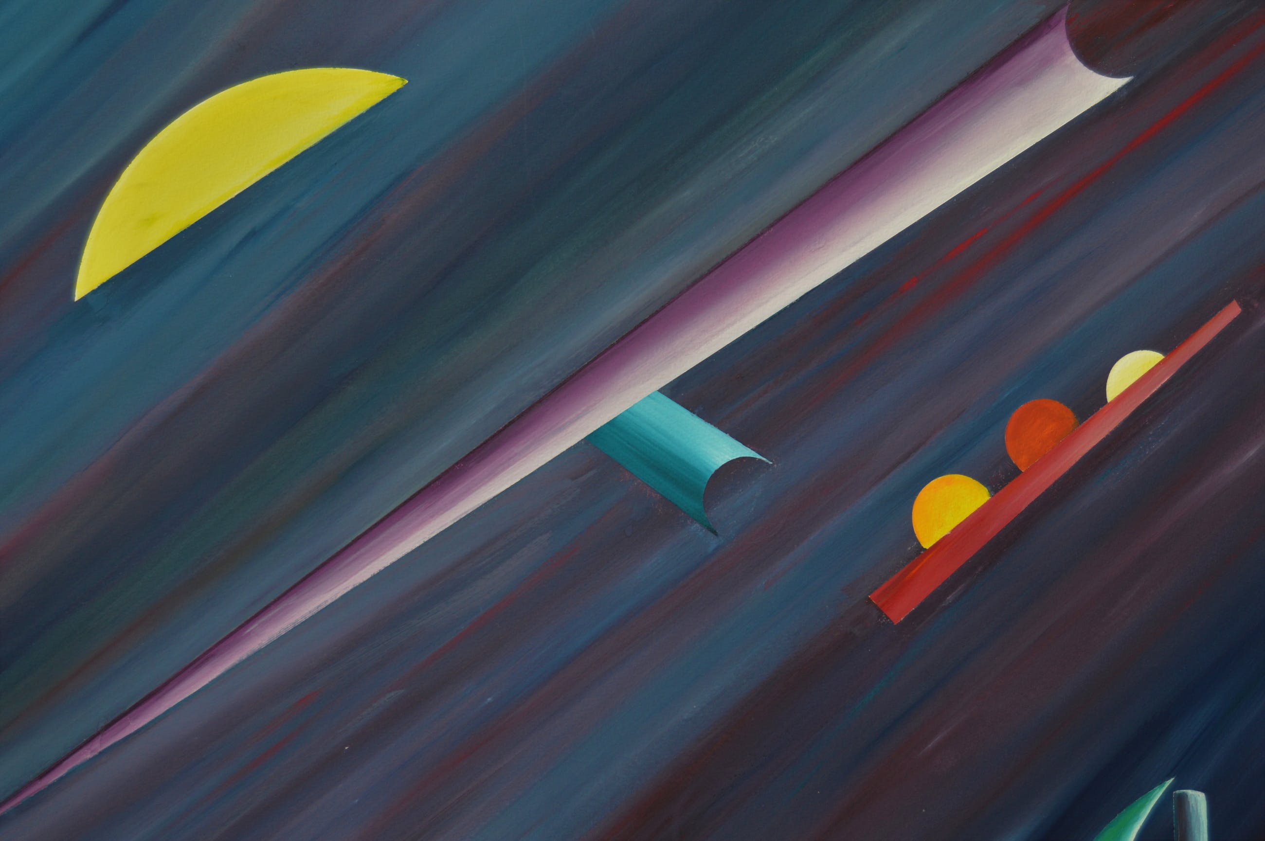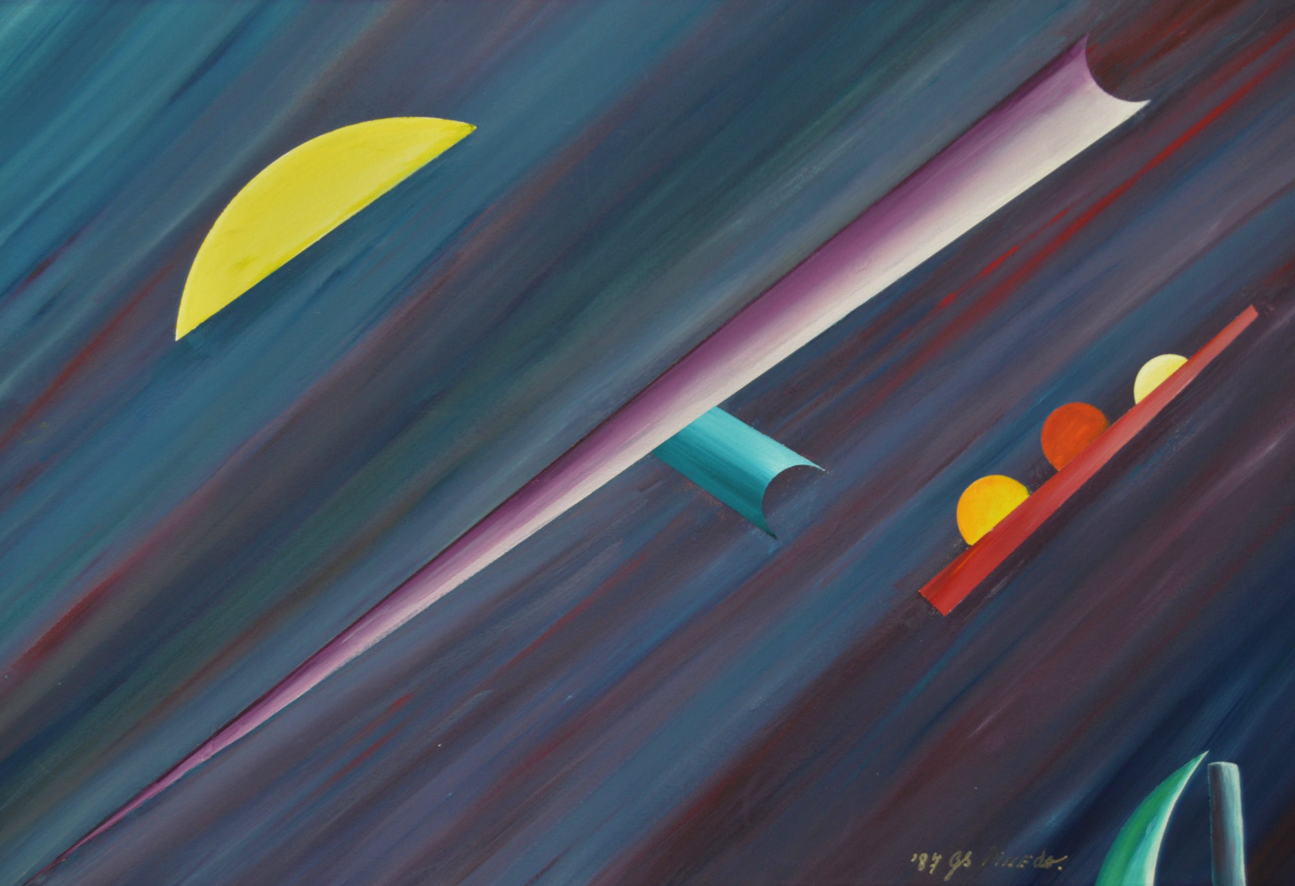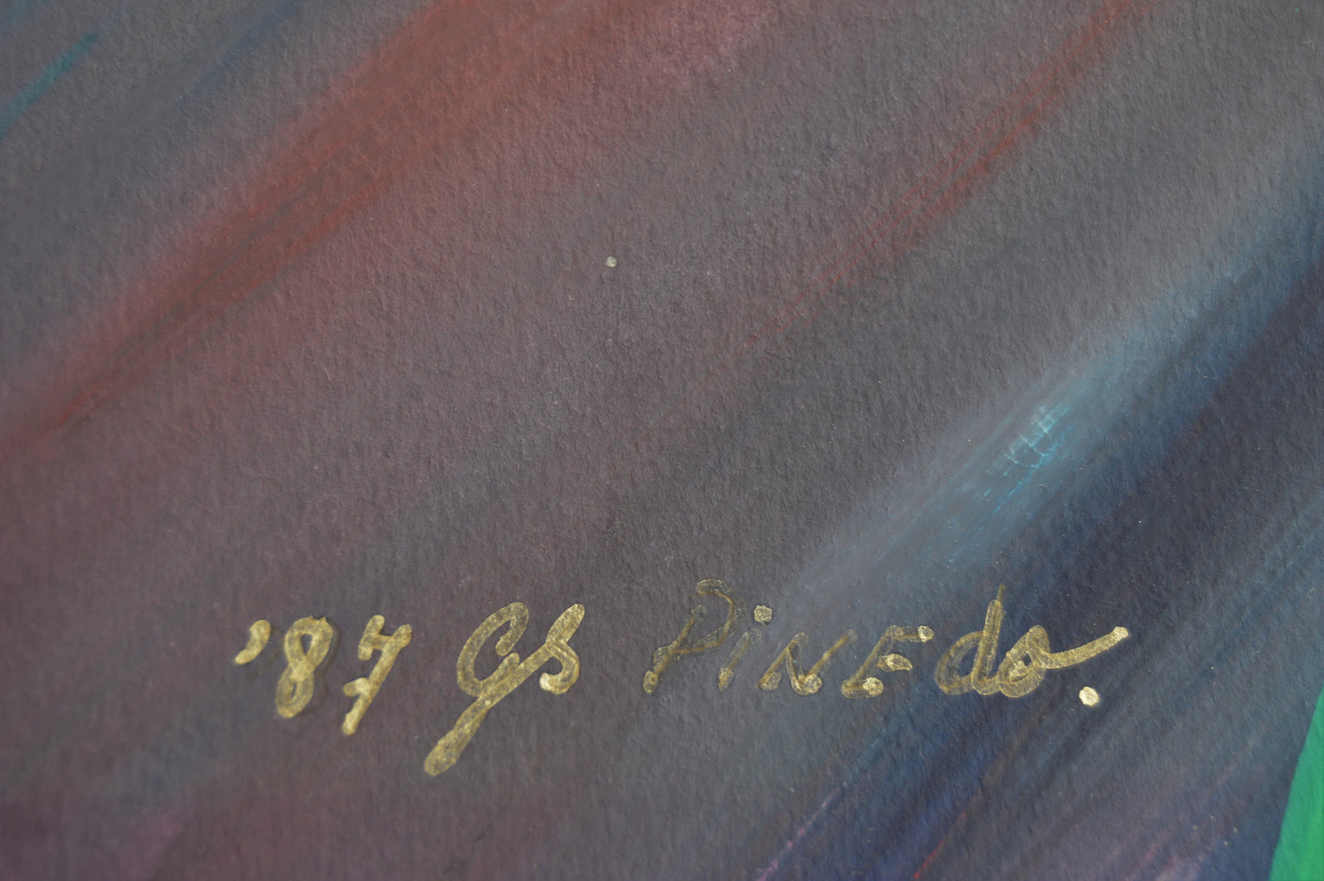 Zeer gave geometrische voorstelling door Pinedo. Geschilderd op dun schilders karton. Gesigneerd en gedateerd rechts onder in het werk.