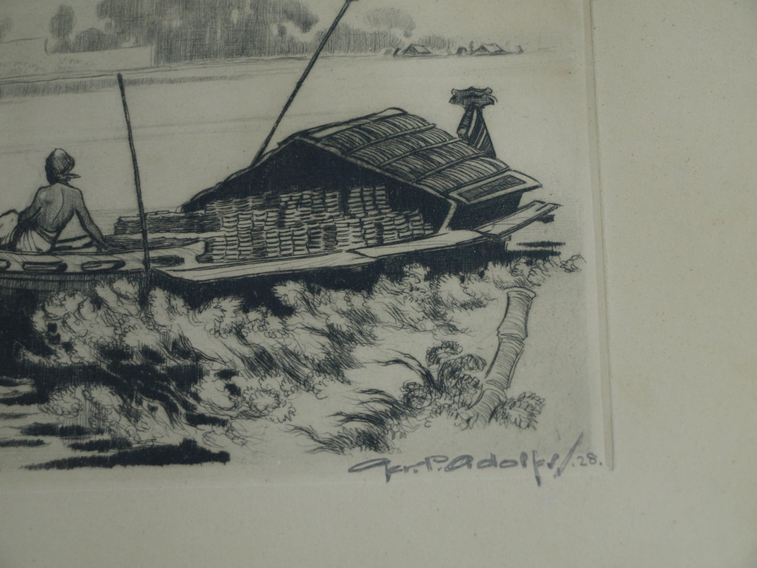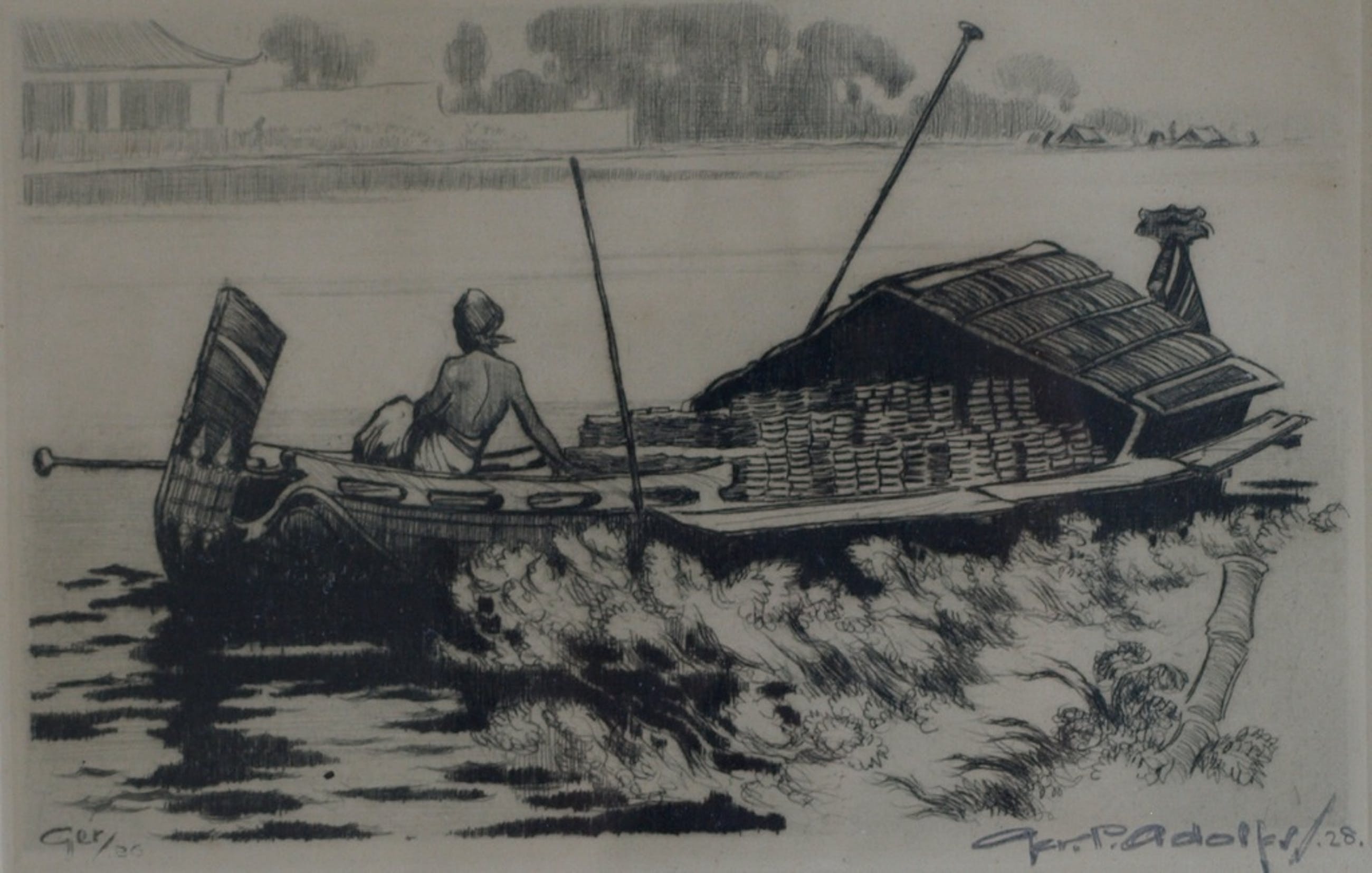 Een ets uit 1926 van de Nederlandse kunstenaar Gerard Adolfs (1897-1968) met een voorstelling van een bootje bij Kajoen in Soerabaja (Indonesië).