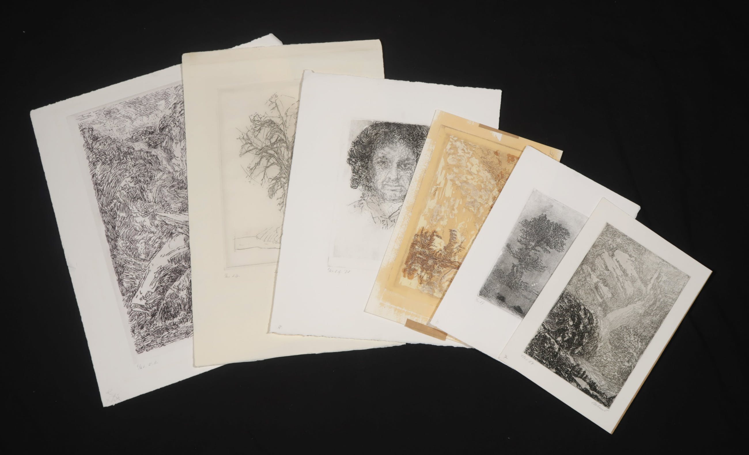 Het werk 'Landschap' (4/20) heeft aan de rechterzijde bruine tape. Het blad van het werk 'Boomstudie' is rondom licht geraffeld. Het 'Gele werk' heeft aan de linker en rechterzijde bruin tape. Het werk 'Portret studie' is langs de randen geraffeld. Het werk 'Boom' heeft aan de bovenzijde wit tape. Het werk 'Gezicht' is langs de linker en rechterzijde gescheurd. De randen van het werk zijn rondom geraffeld. | |||