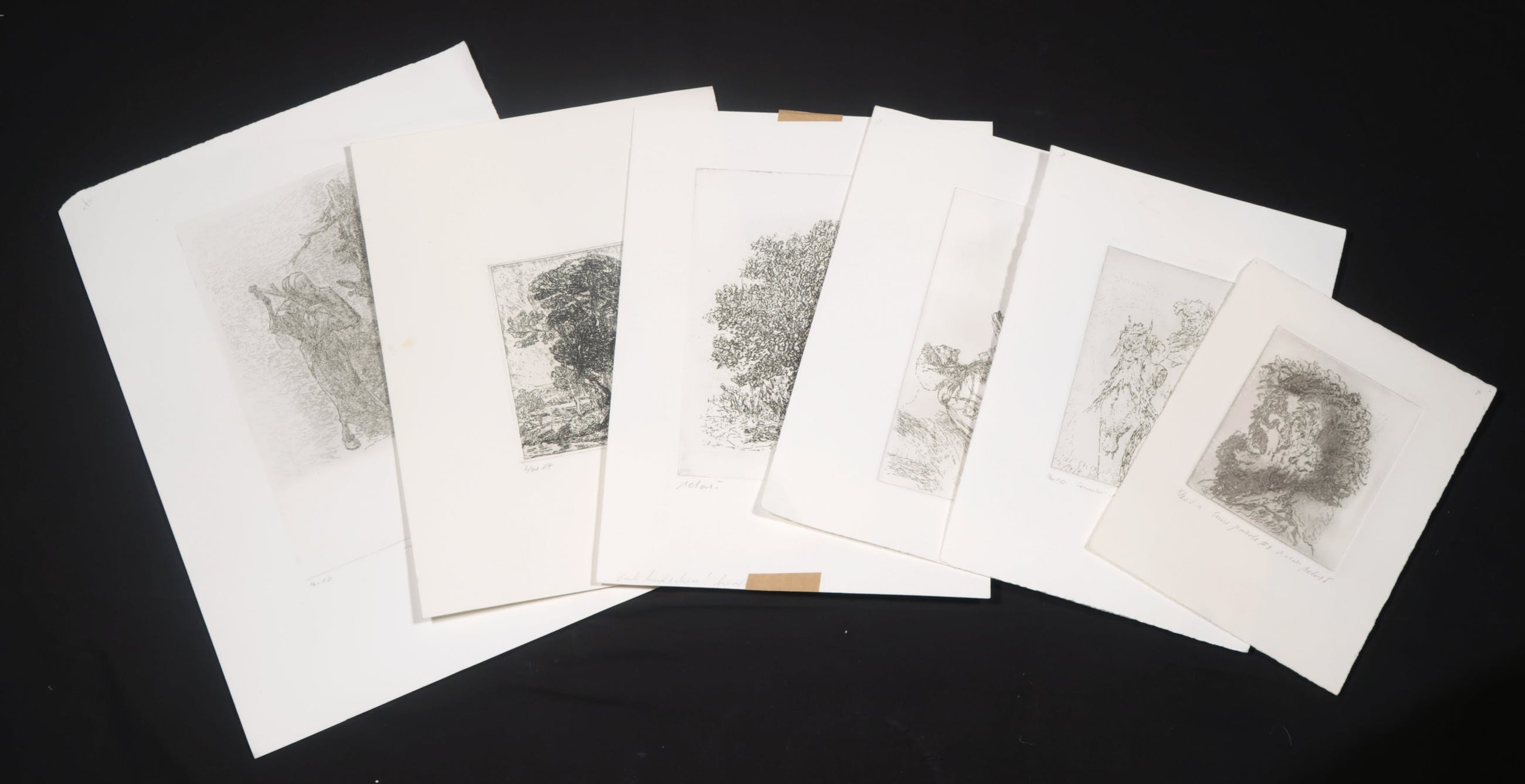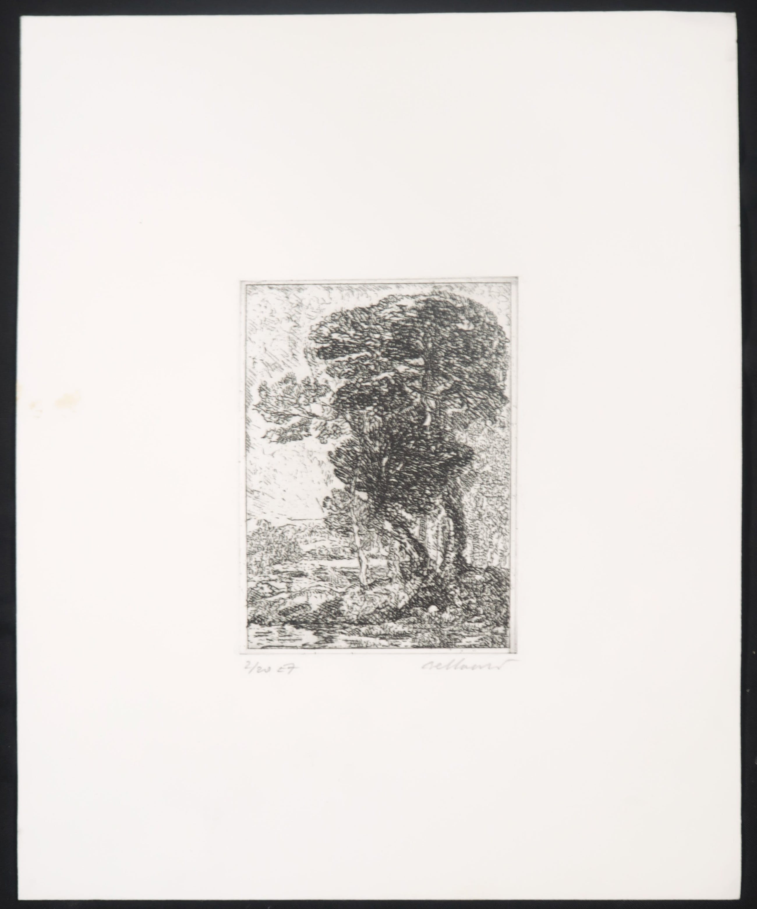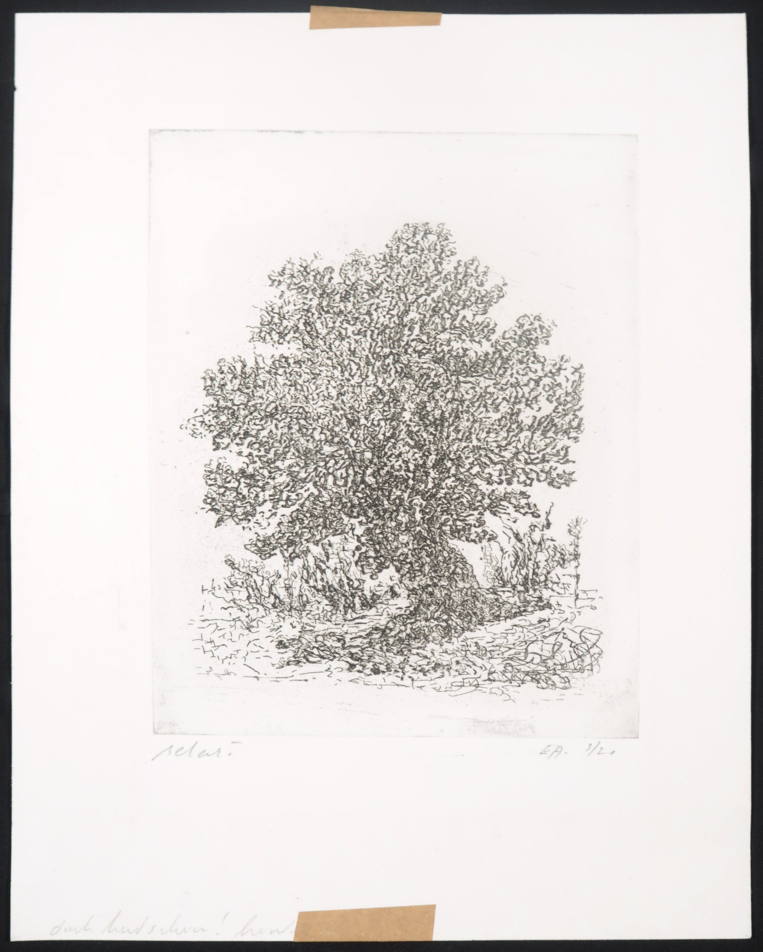 | De etsen zijn in goede conditie. De bladen zijn niet beschadigd. Het werk 'Terminos' is in het midden voorzien van een lichte veeg. Het werk 'met de grote boom' is rondom het beeld licht verkleurd. Dit komt door een eerdere inlijsting, en is bij opnieuw inlijsten niet meer zichtbaar. Daarnaast zit boven en onder in het midden bruin tape. Het werk 'met de kleine boom' heeft aan de linkerzijde een vlek. Het werk 'Mi Careme' heeft rechtsonder een vlek. Rechtsboven in de hoek zit een kreuk in het papier. | |||||||