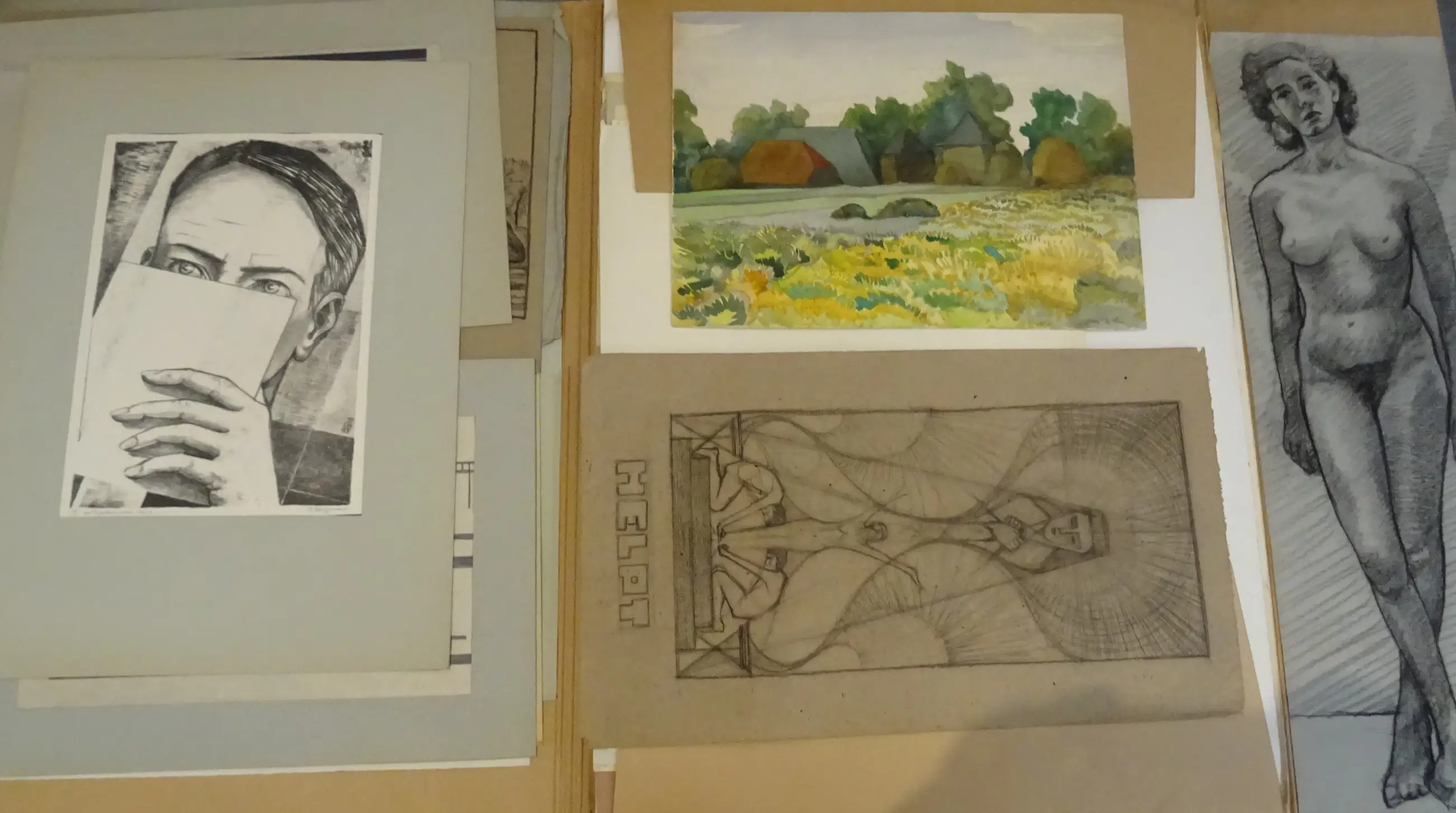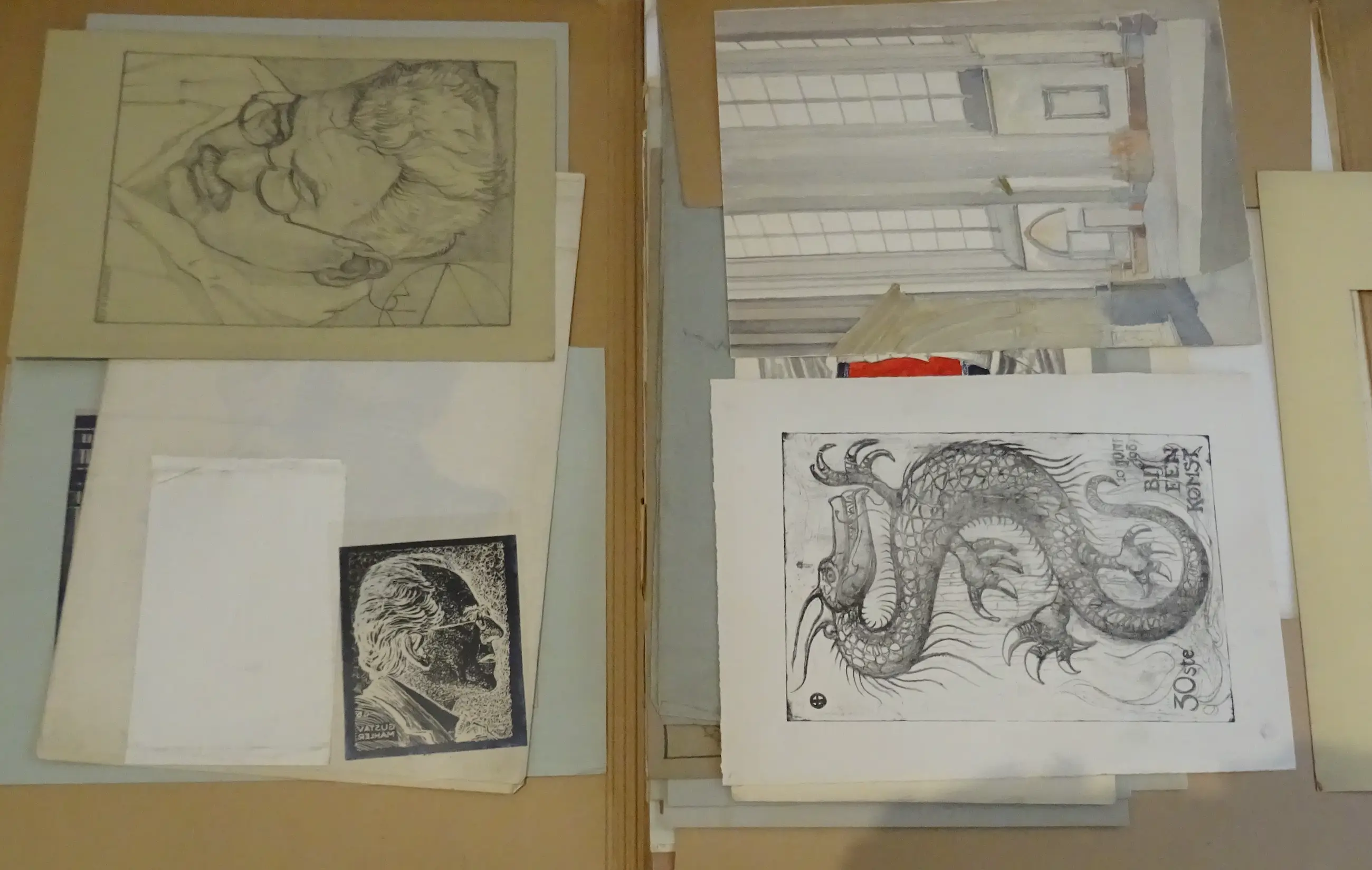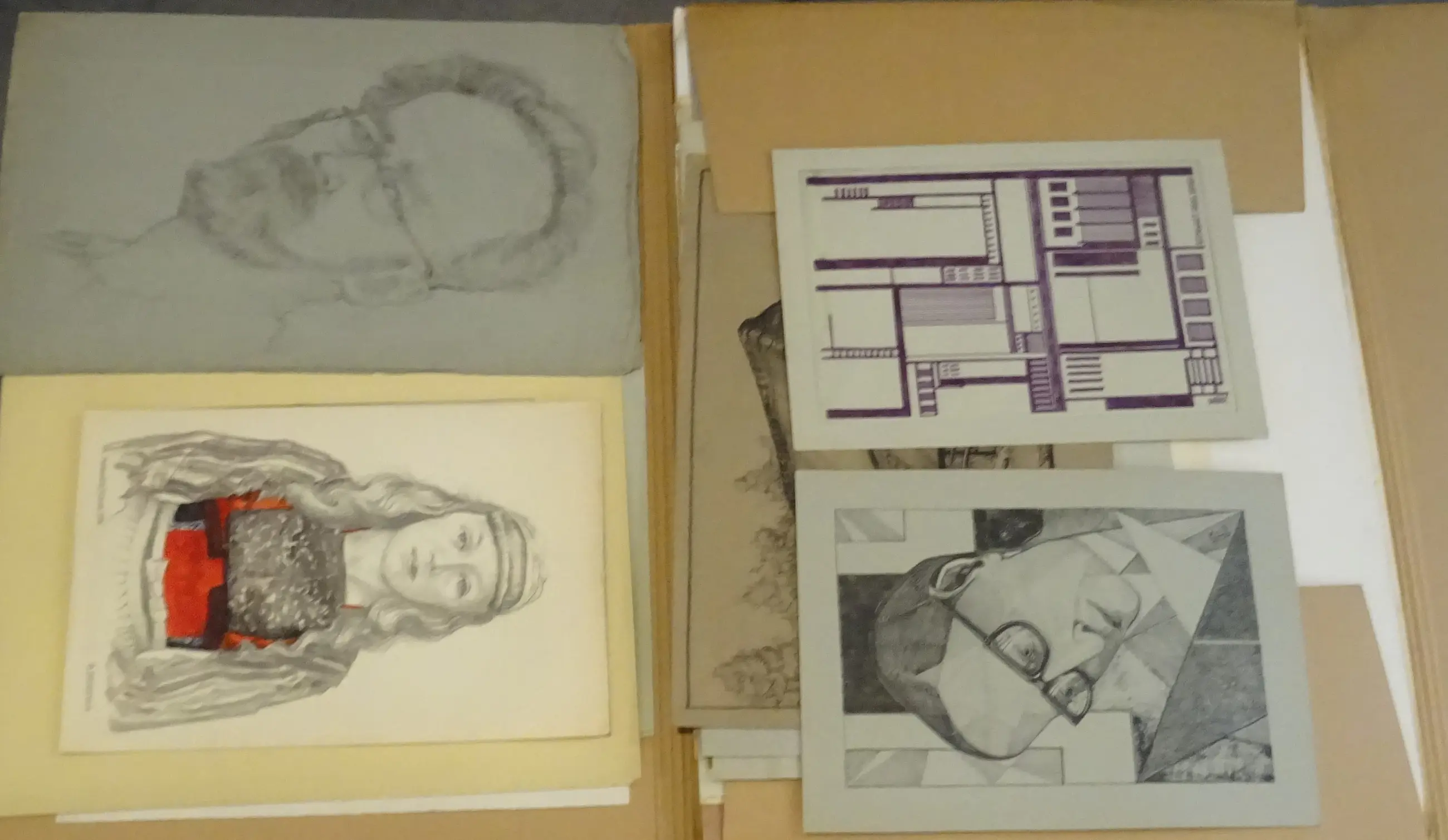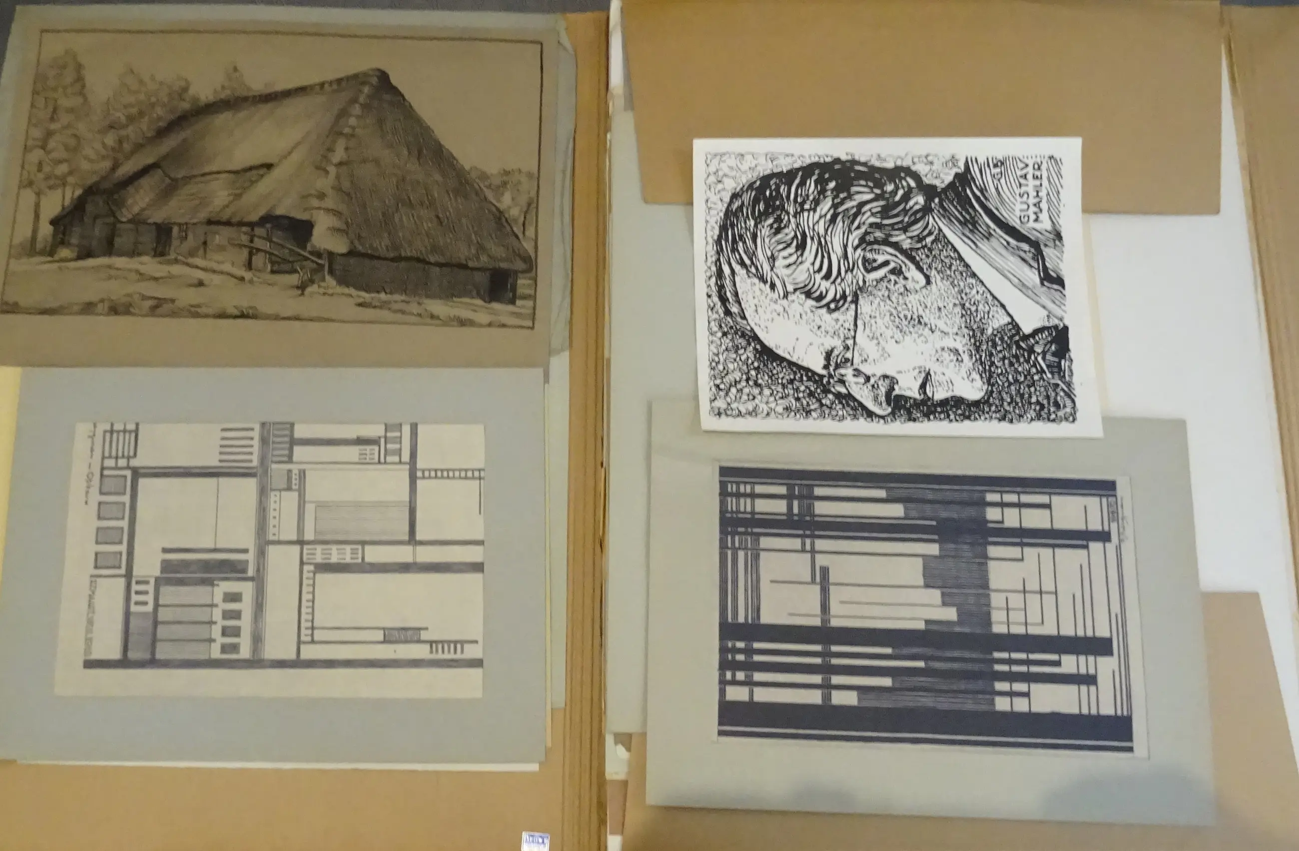 Een map met meer dan 50 stuks werk van Gerard Bergman, diverse tekeningen, aquarellen, ontwerpen etc. Diverse afmetingen, gesigneerd en ongesigneerd.
