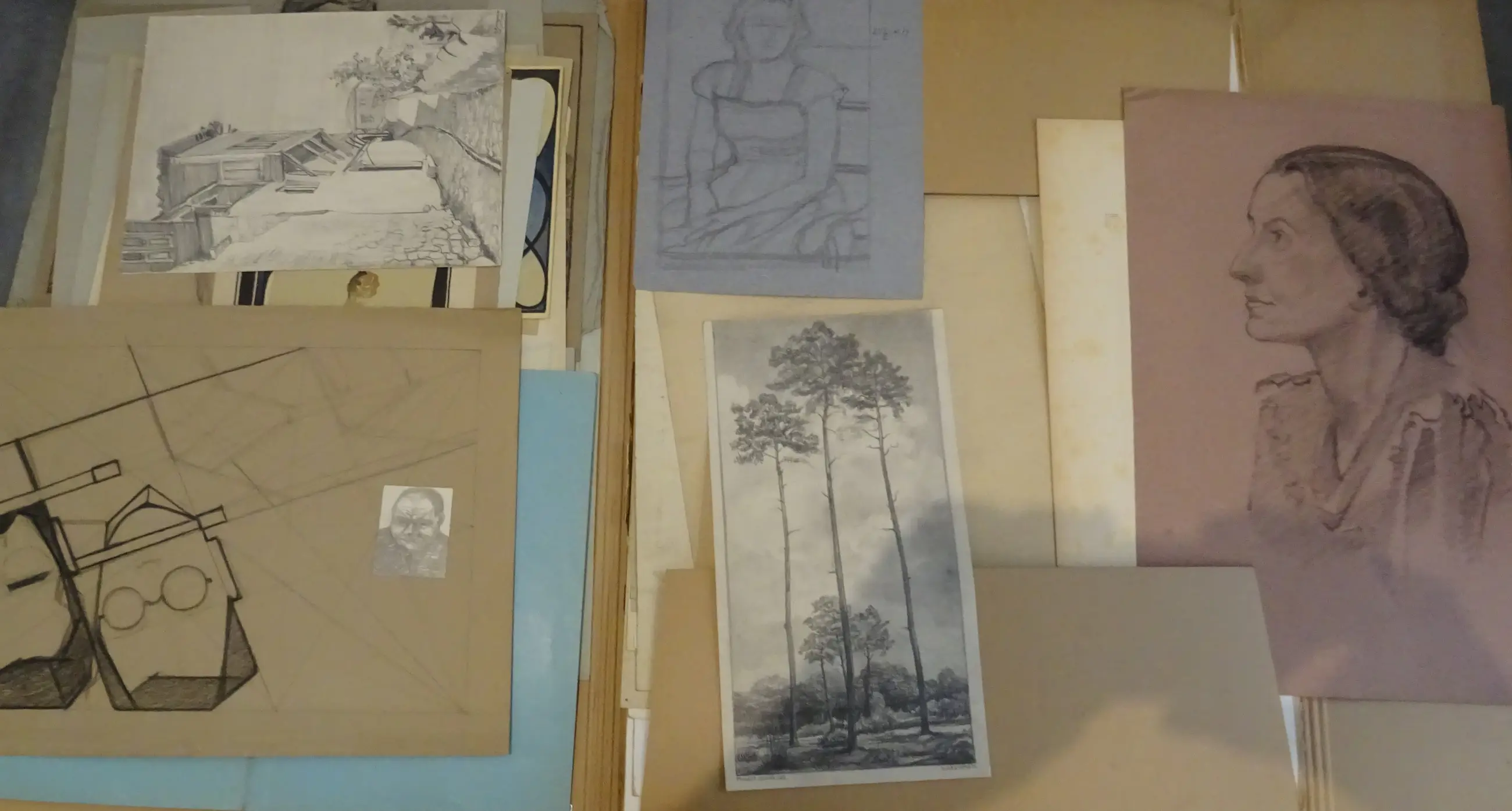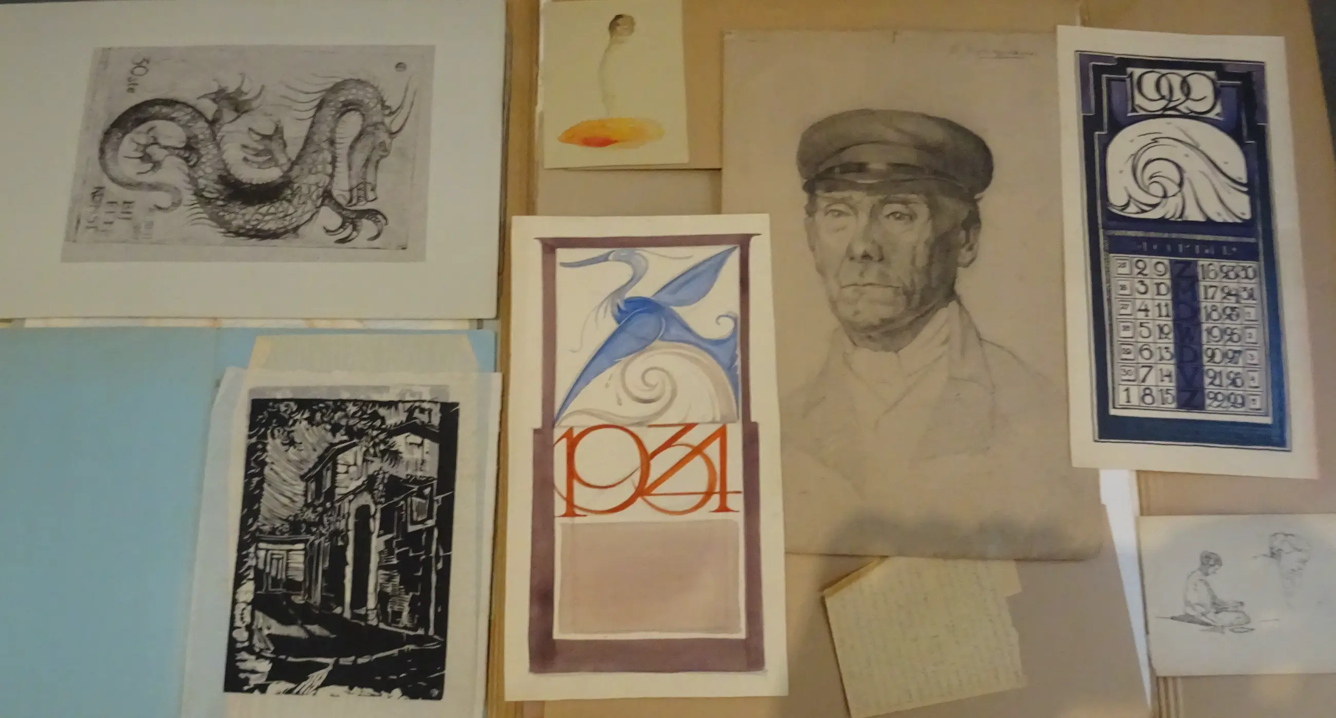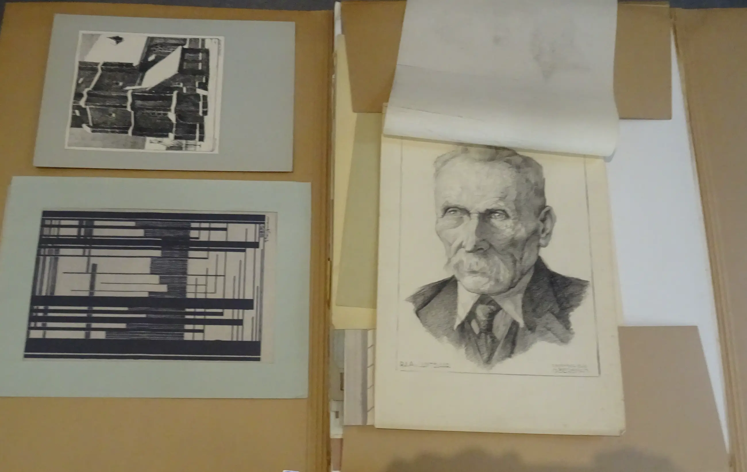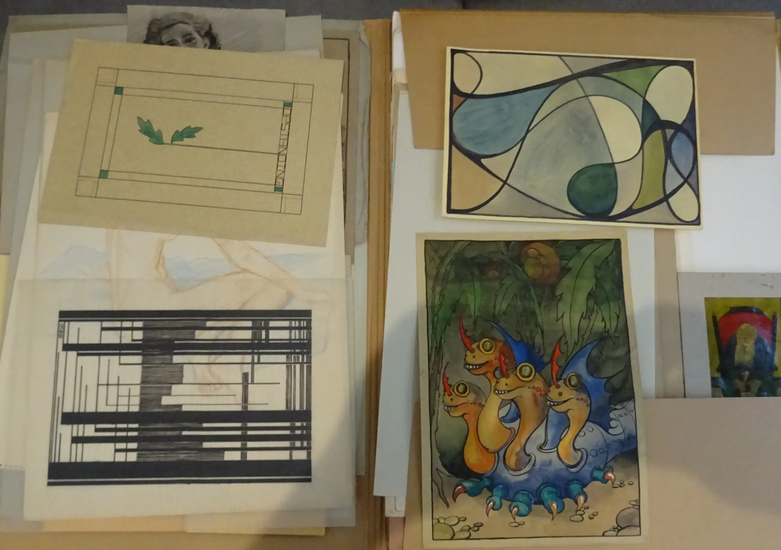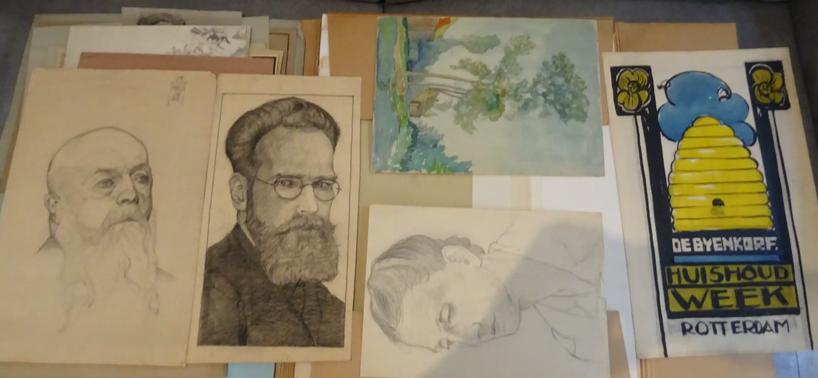 Een map met meer dan 50 stuks werk van Gerard Bergman, diverse tekeningen, aquarellen, ontwerpen etc. Diverse afmetingen, gesigneerd en ongesigneerd.