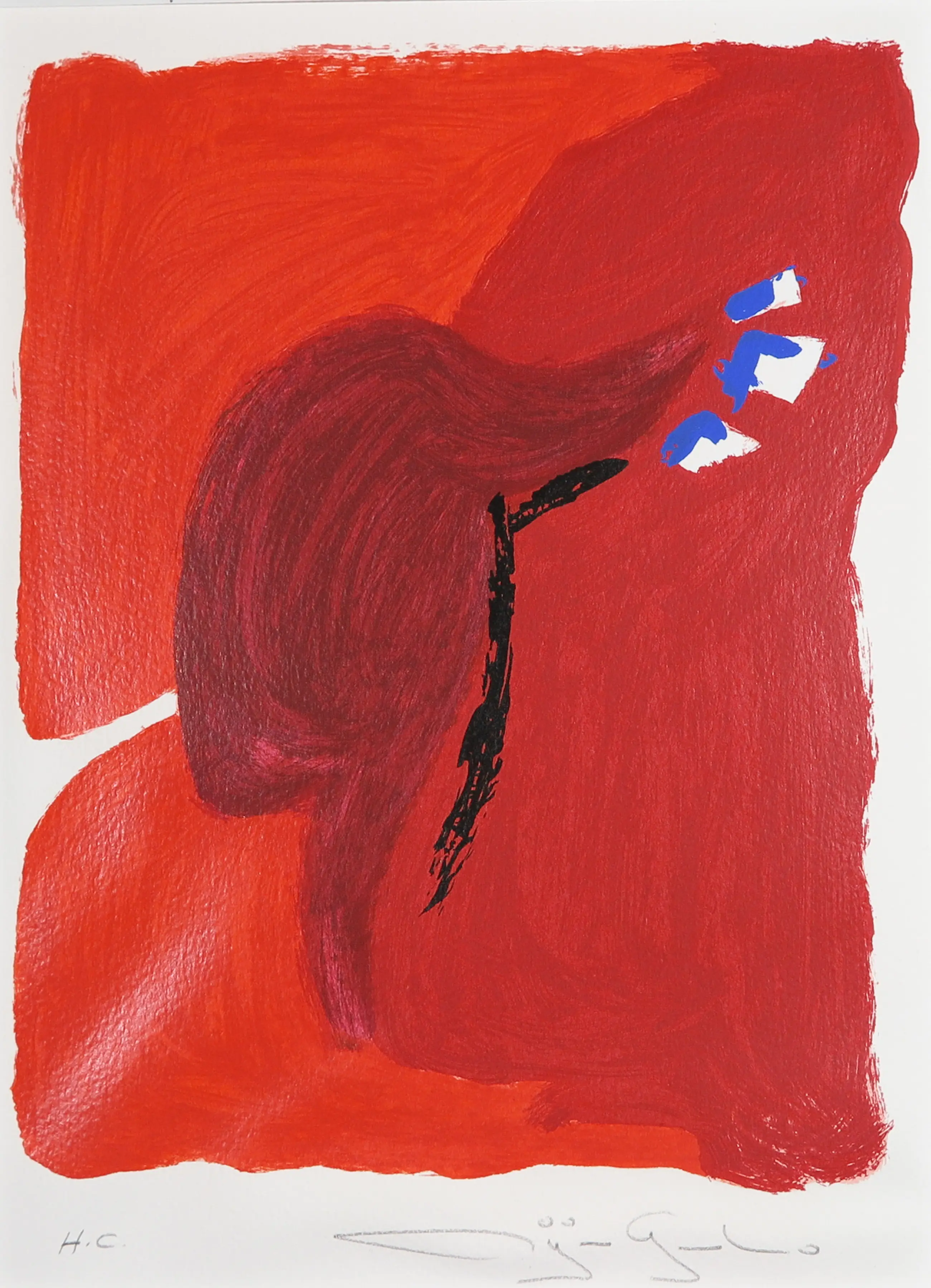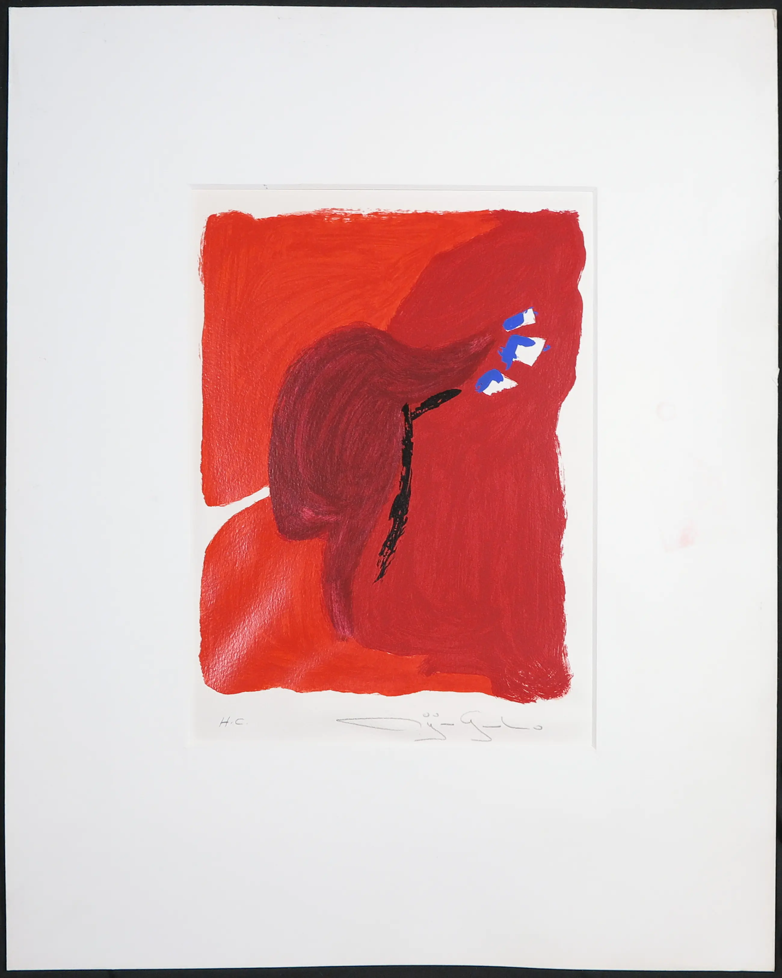 | Het papier van de zeefdruk bobbelt lichtjes, vooral bij het signatuur. Het passe-partout is een beetje vuil. | |||||||||||