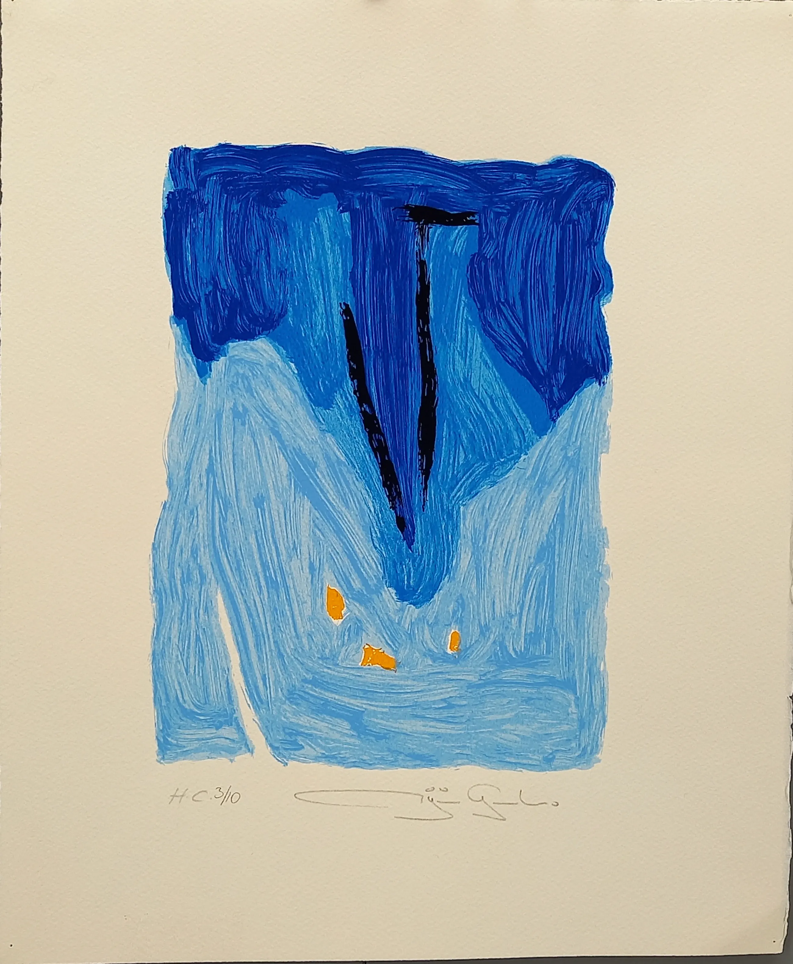 Serie zeefdrukken met hoofdkleur blauw, geel, rood, groen.