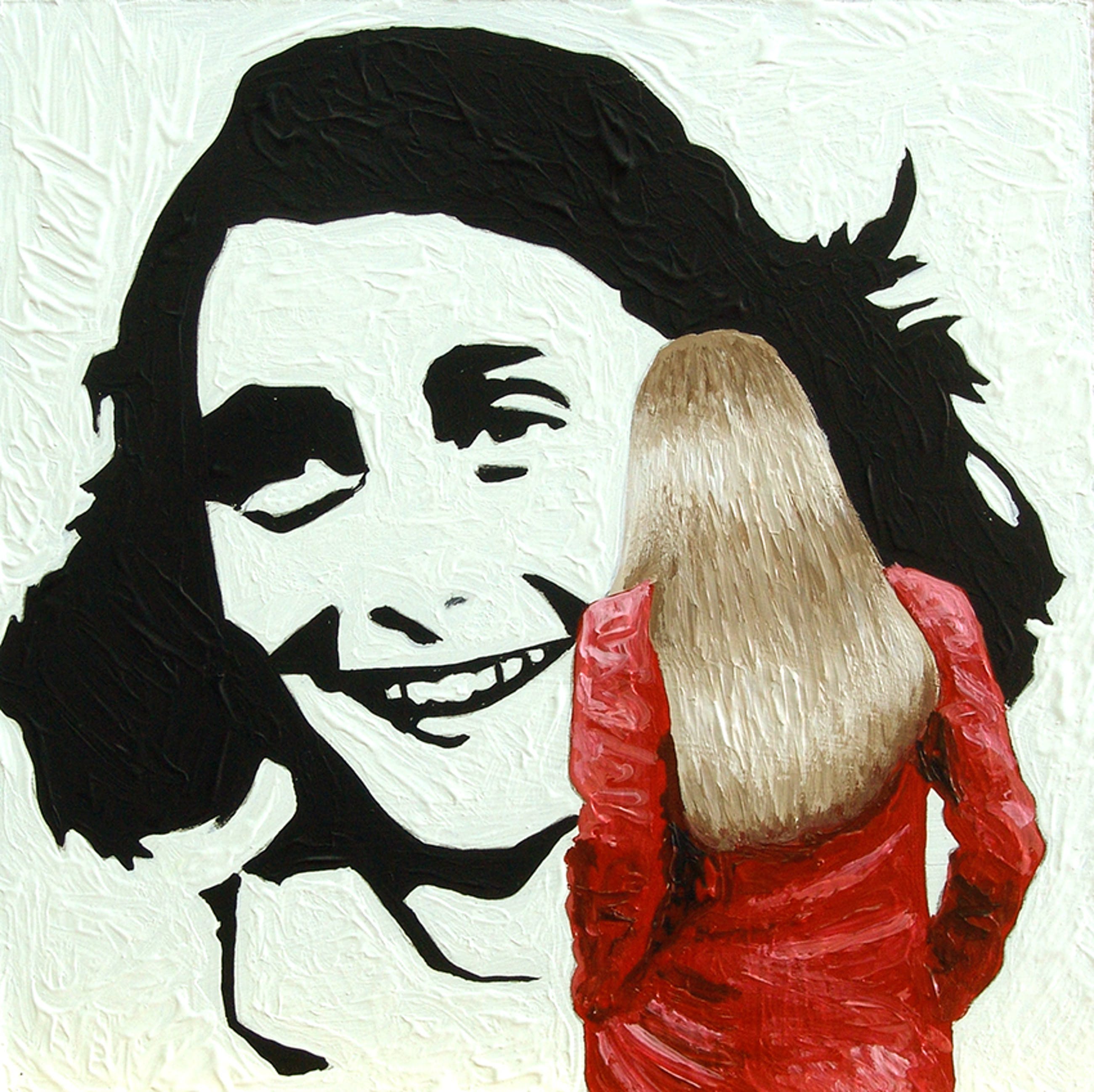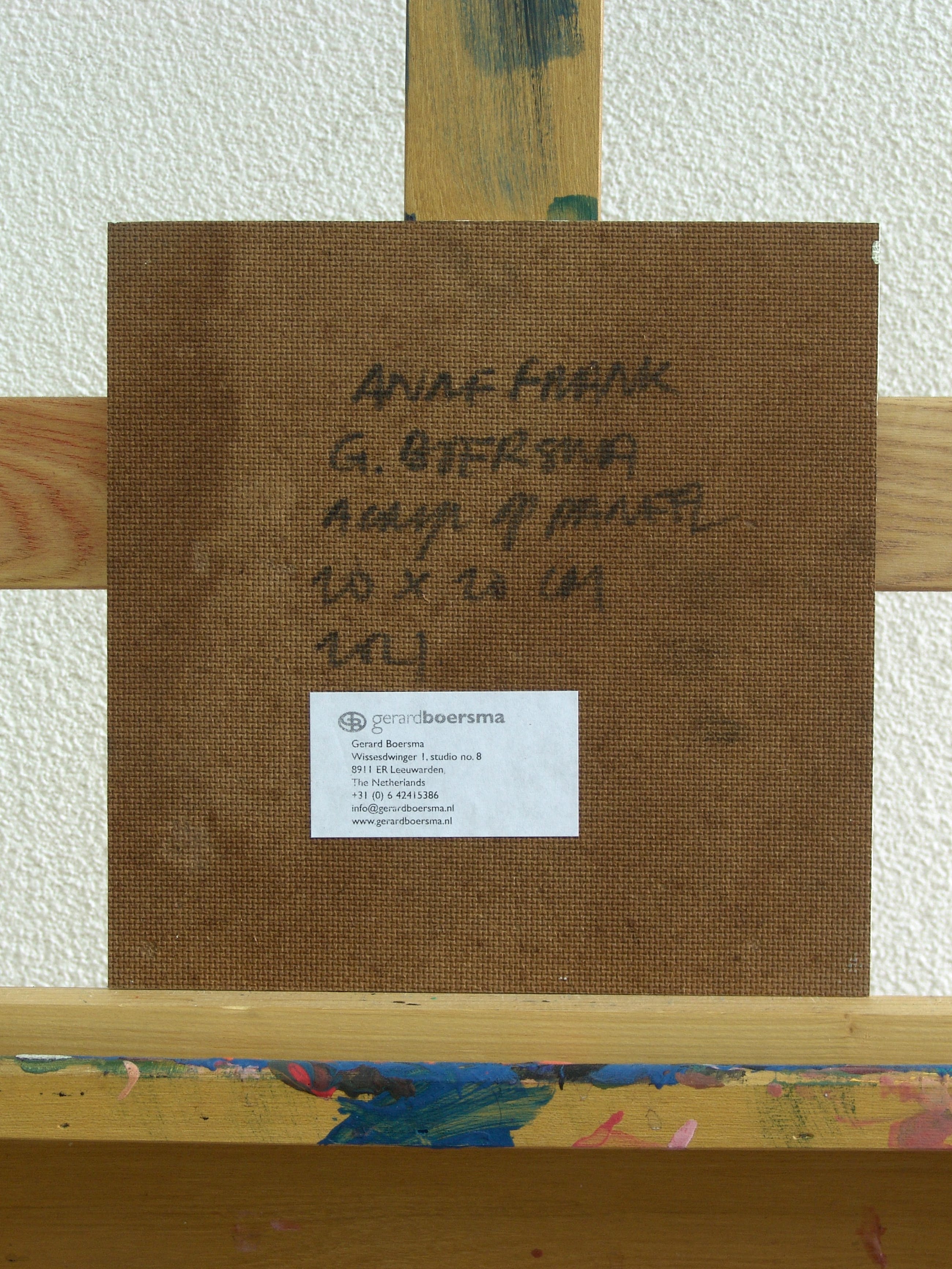 Gerard Boersma staat bekend om zijn schilderijen van mensen die naar bekende schilderijen kijken in musea. Dit werk van 20 x 20 cm toont een vrouw kijkend naar een portret van Anne Frank. Het werk dateert uit 2021 en is gemaakt met acryl op masonite. Gesigneerd op achterkant. Het schilderij is voorzien van een label van de kunstenaar en wordt geleverd met certificaat van echtheid.