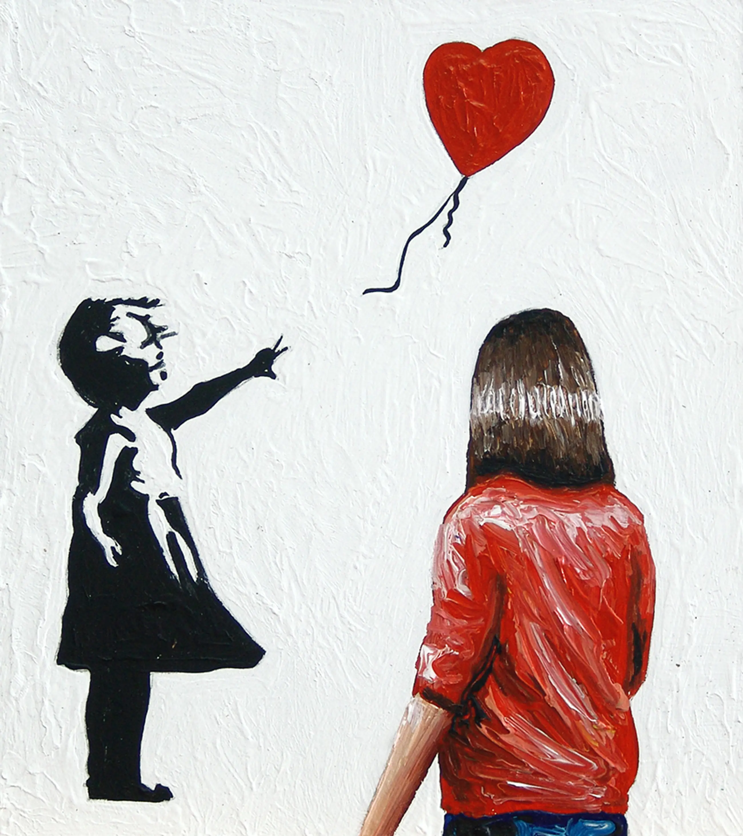 Gerard Boersma staat bekend om zijn schilderijen van mensen die naar bekende schilderijen kijken in musea. Dit werk van 17 x 15 cm toont een vrouw kijkend naar schilderij van Banksy