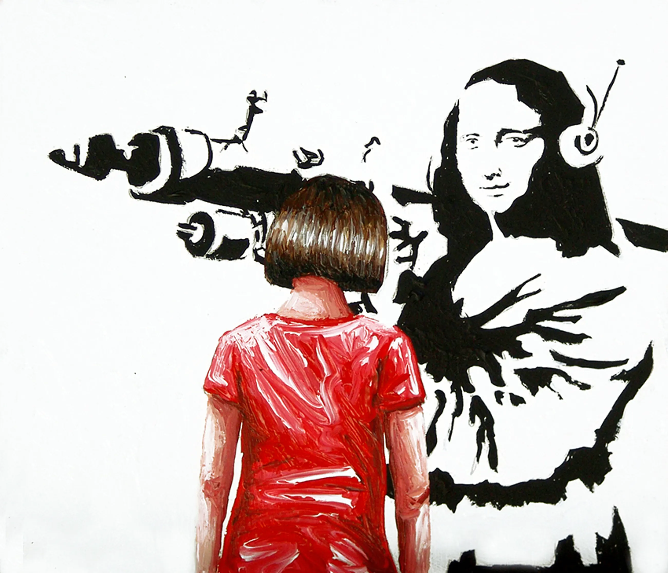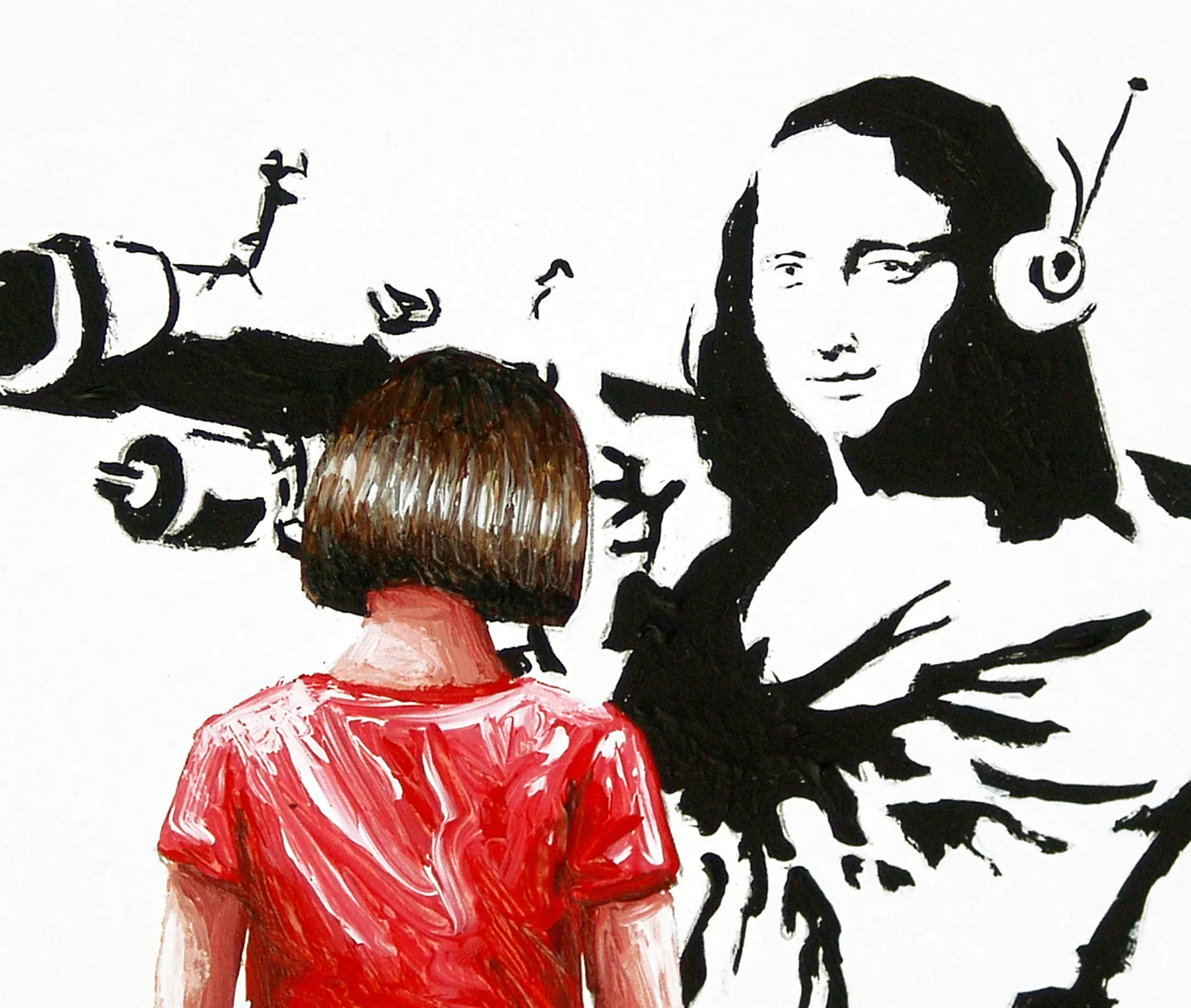 Gerard Boersma staat bekend om zijn schilderijen van mensen die naar bekende schilderijen kijken in musea. Dit werk van 17 x 15 cm toont een vrouw kijkend naar schilderij van Banksy.