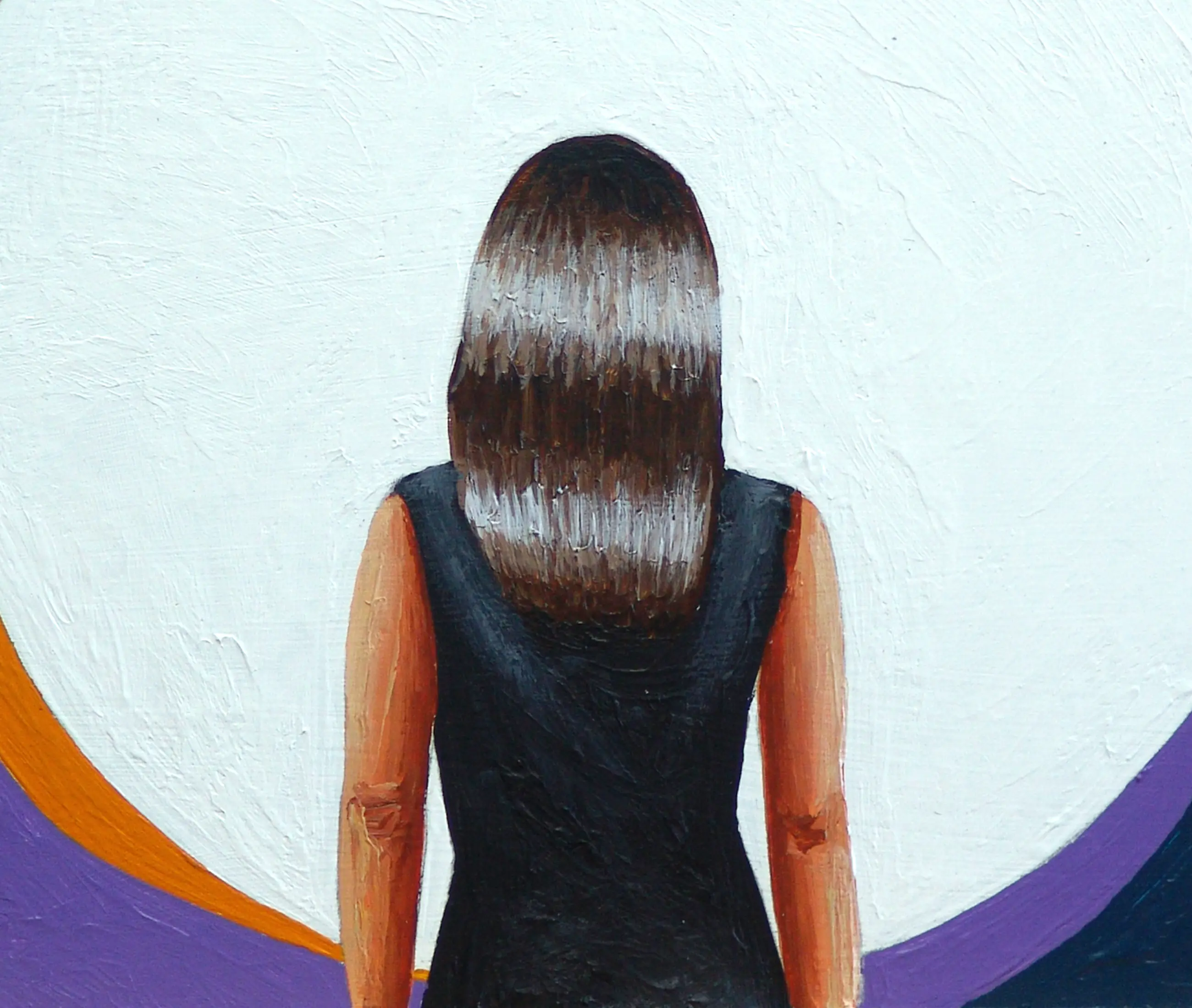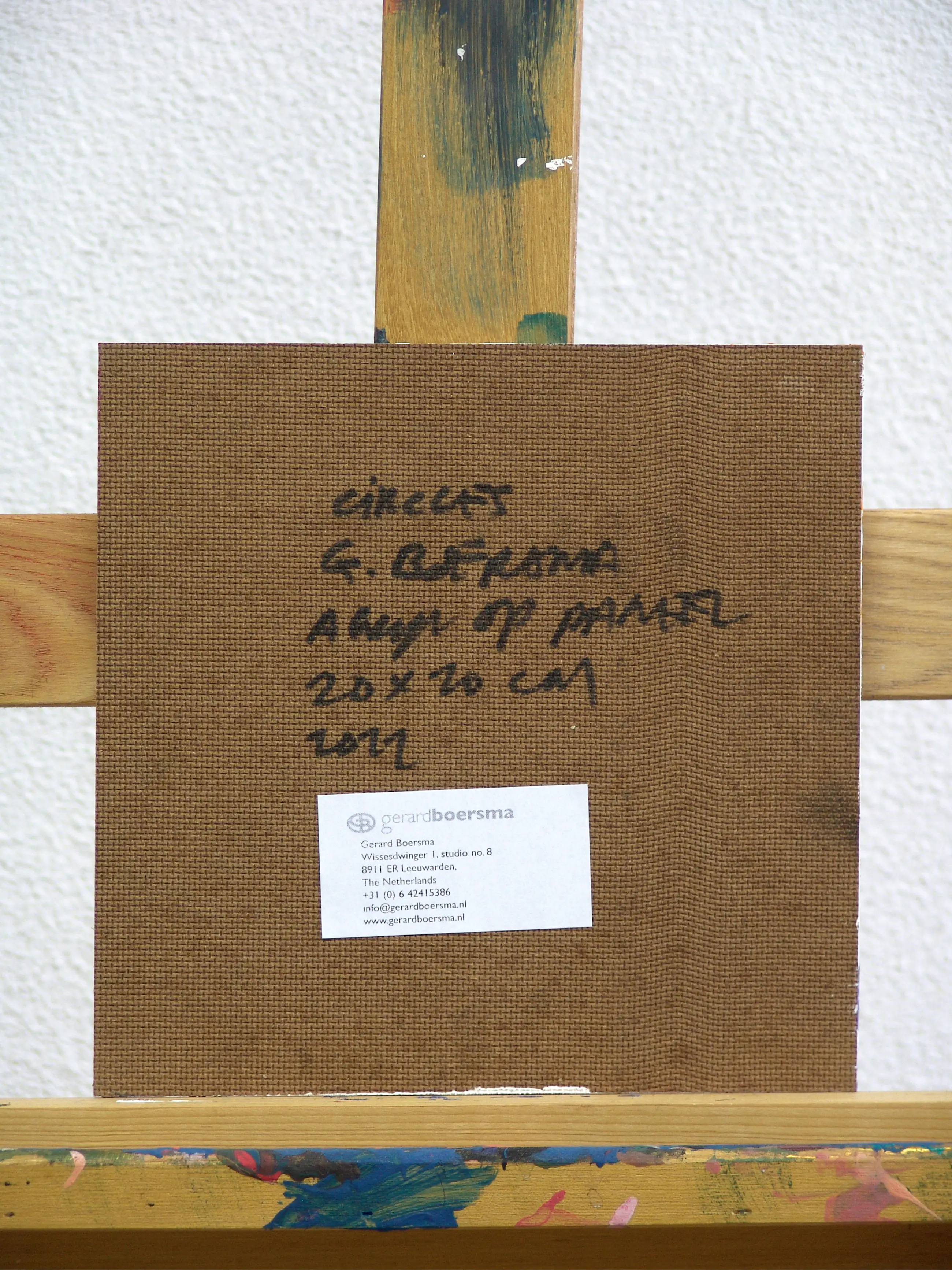 Gerard Boersma staat bekend om zijn schilderijen van mensen die naar bekende schilderijen kijken in musea. Dit werk van 20 x 20 cm toont een vrouw kijkend naar een schilderij van Max Bill.
