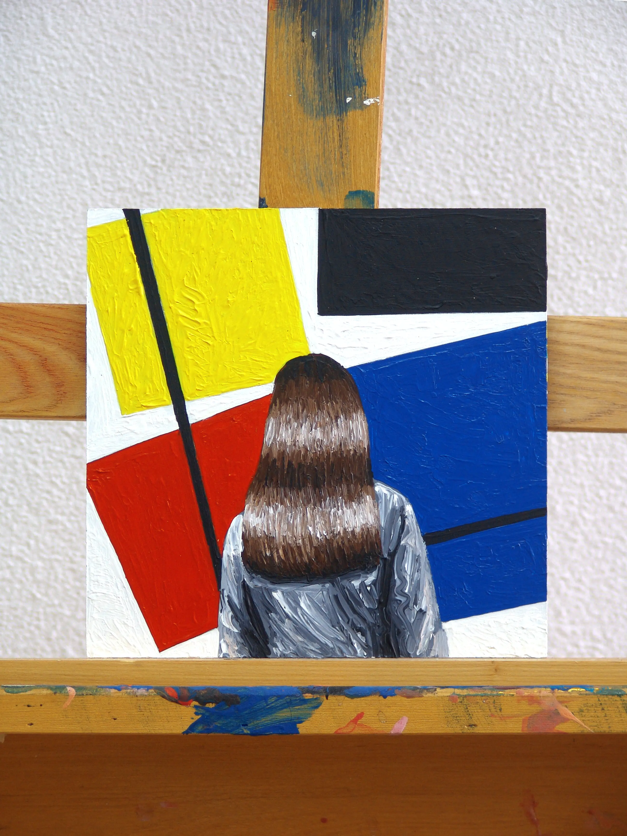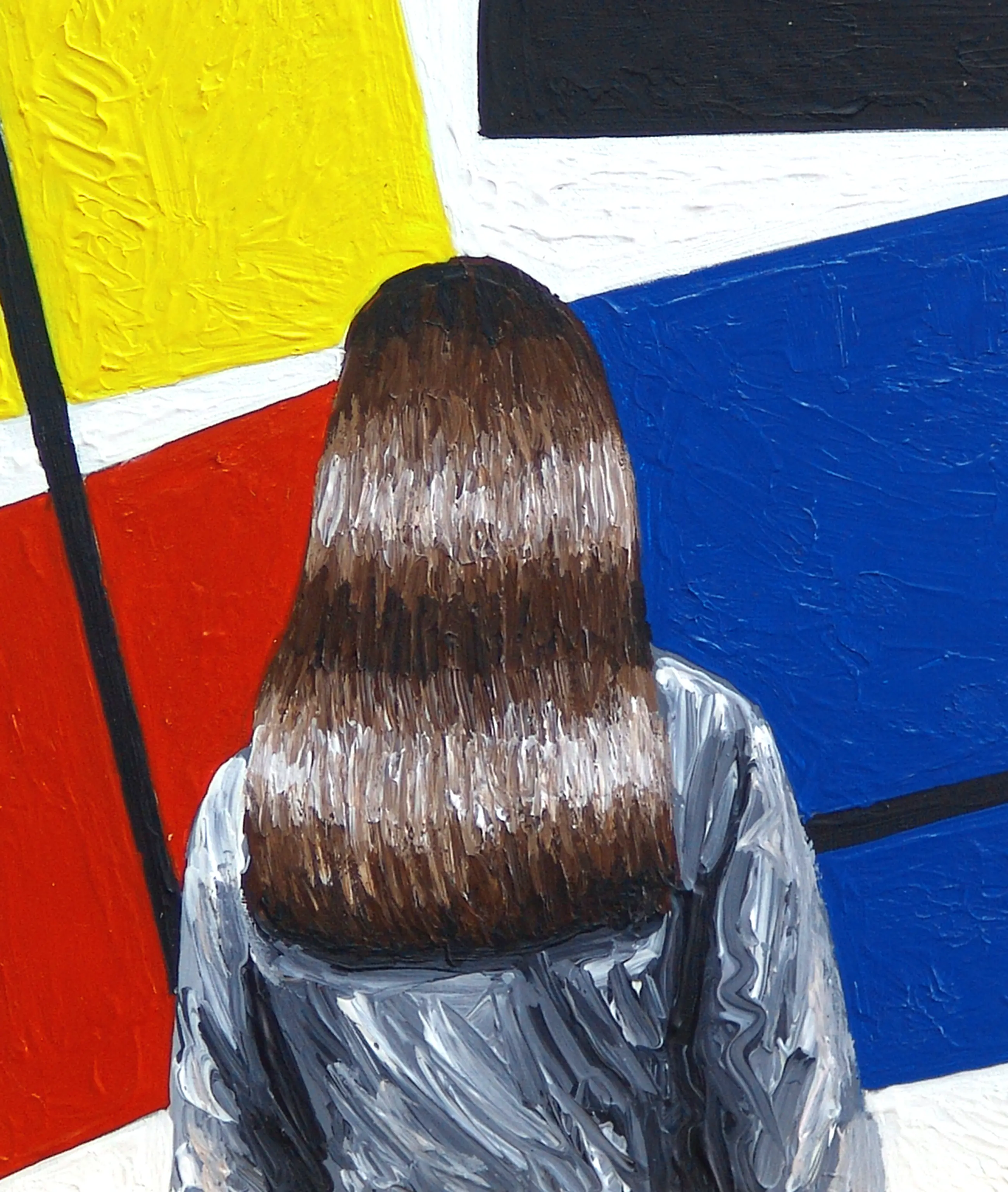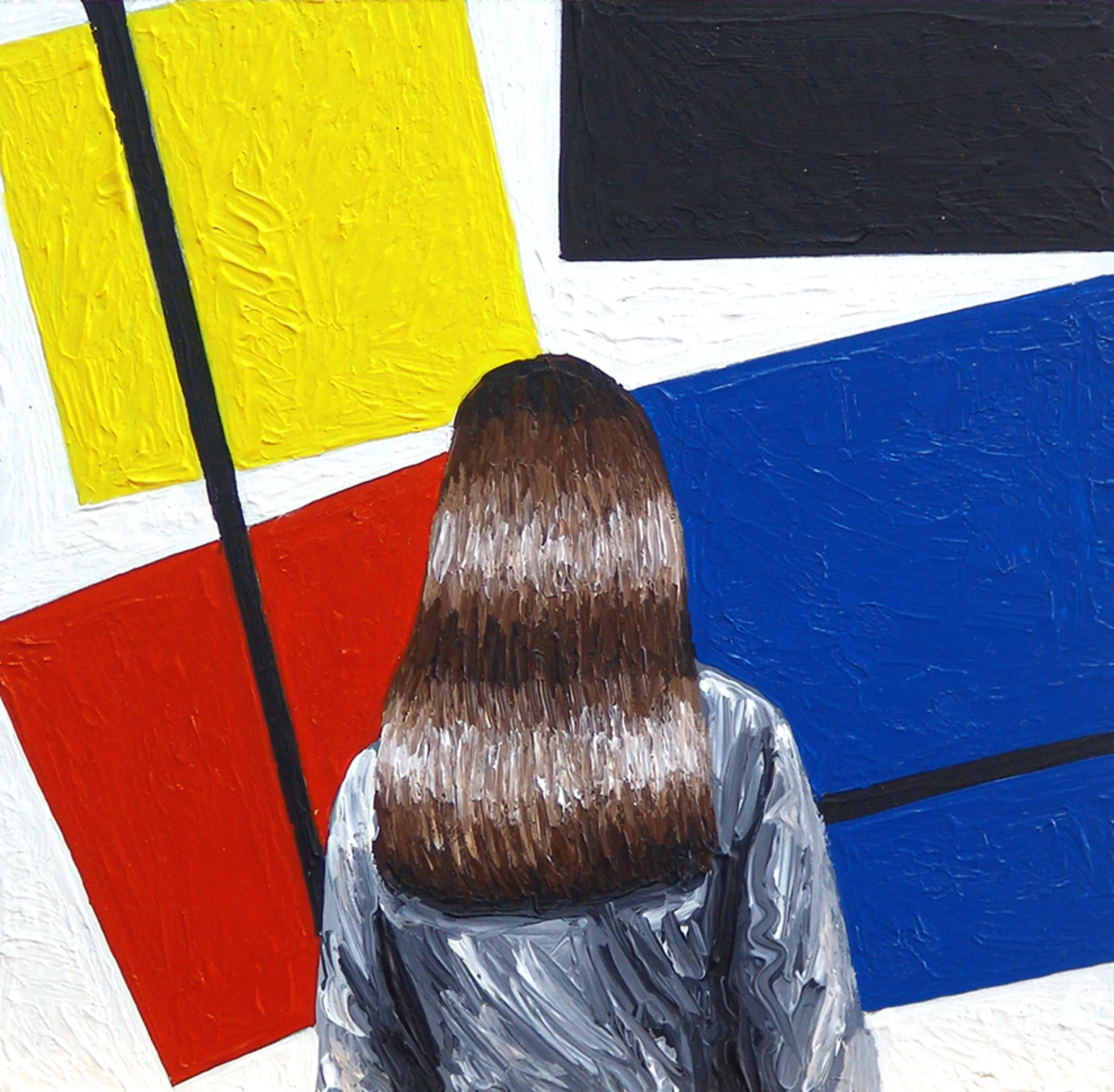 Gerard Boersma staat bekend om zijn schilderijen van mensen die naar bekende schilderijen kijken in musea. Dit werk van 20 x 20 cm toont een vrouw kijkend naar een schilderij van Theo van Doesburg (mede-oprichter van De Stijl).