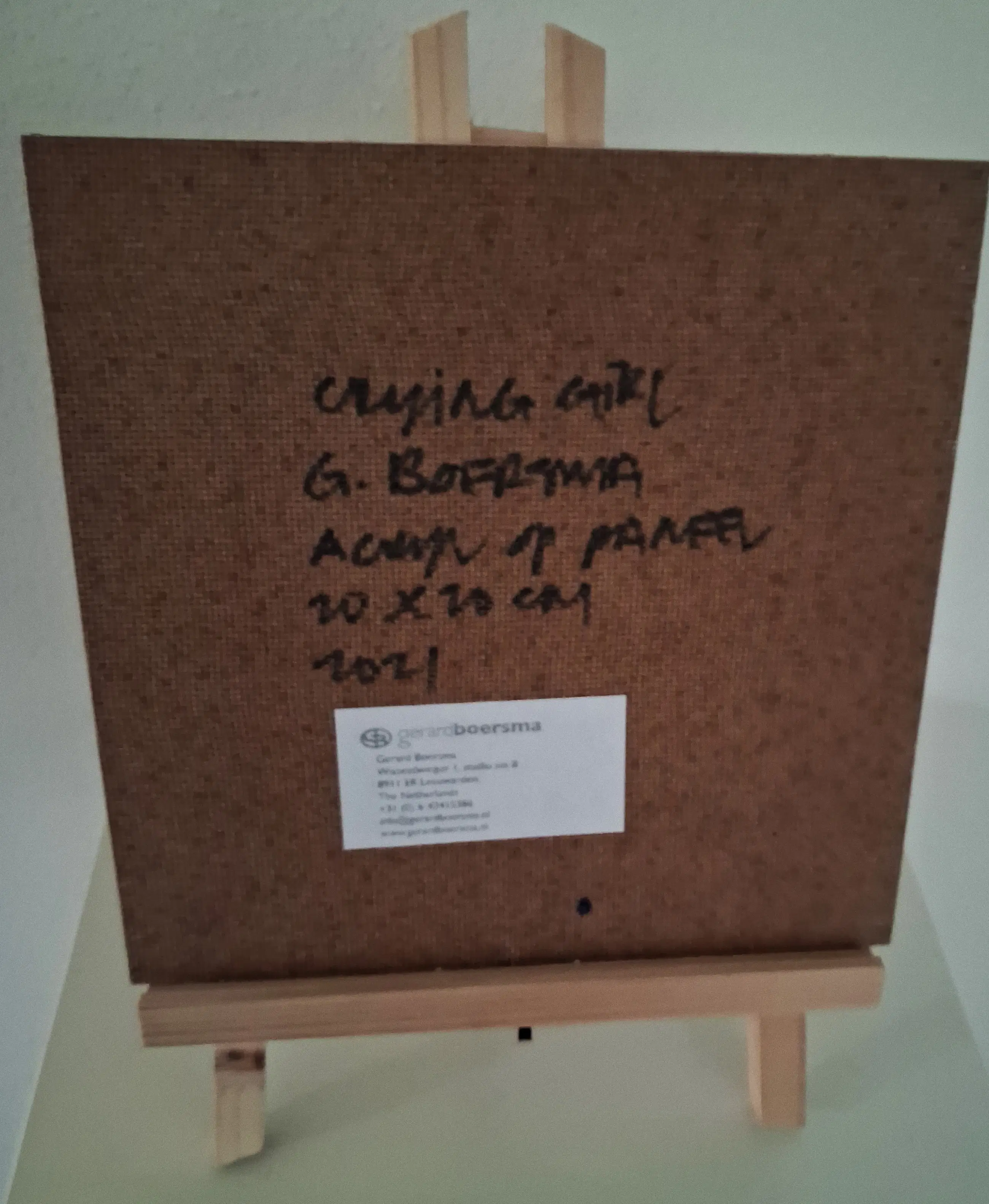 Kunstenaar Gerard Boersma is bekend om zijn schilderijen van mensen kijkend naar bekende schilderijen in musea. Dit werk toont een vrouw kijkend naar het schilderij 'Crying Girl' van Roy Lichtenstein. Het werk dateert uit 2021 en is gemaakt met acryl op masonite. en is gesigneerd op de achterkant. (exclusief schildersezeltje)
