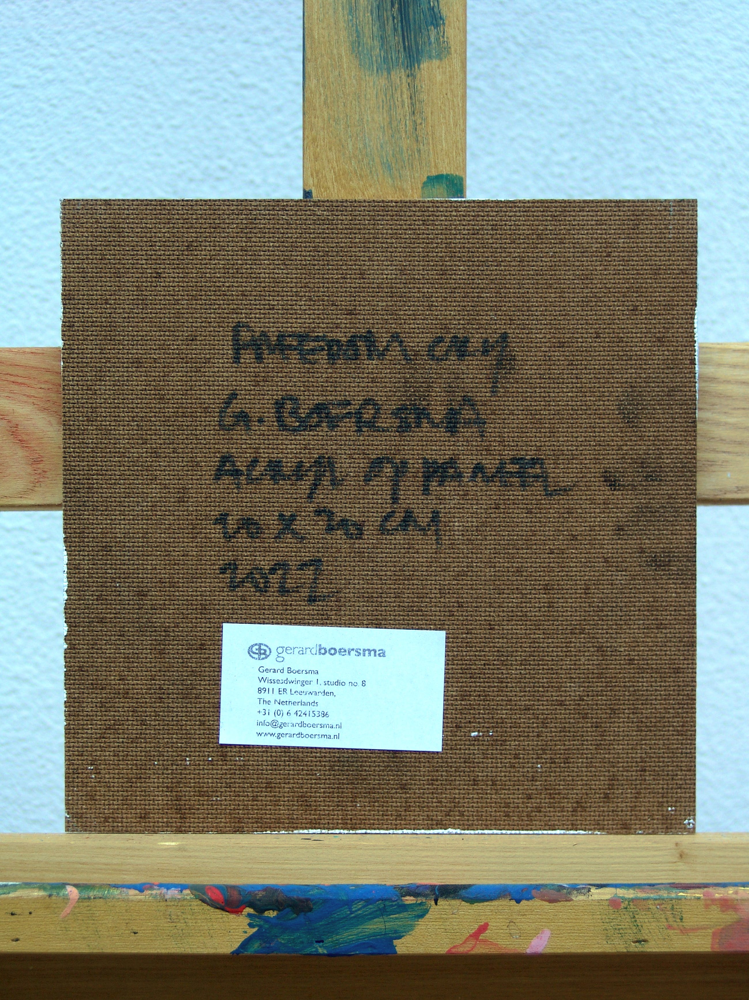Het werk dateert uit 2022 en is gemaakt met acryl op masonite. Gesigneerd op achterkant. Het schilderij is voorzien van een label van de kunstenaar en wordt geleverd met certificaat van echtheid.