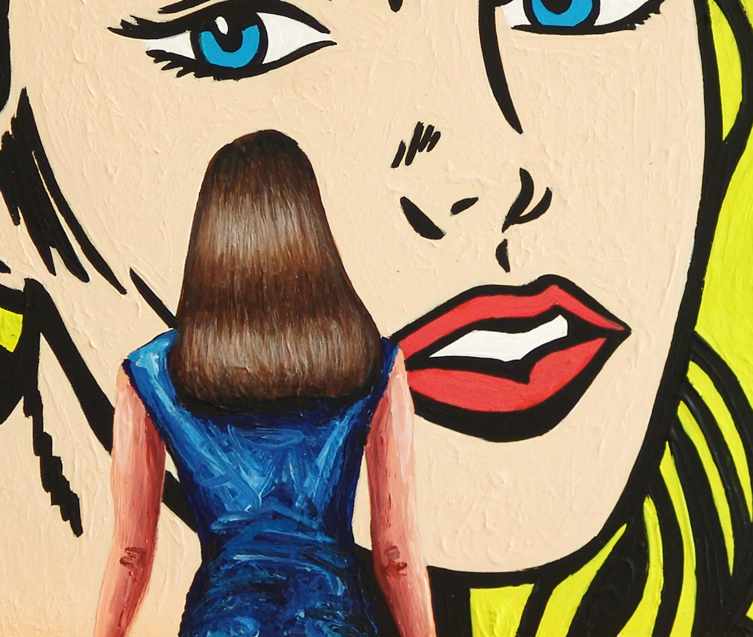 Gerard Boersma staat bekend om zijn schilderijen van mensen die naar bekende schilderijen kijken in musea. Dit werk van 25 x 25 cm toont een vrouw kijkend naar een schilderij van Roy Lichtenstein.