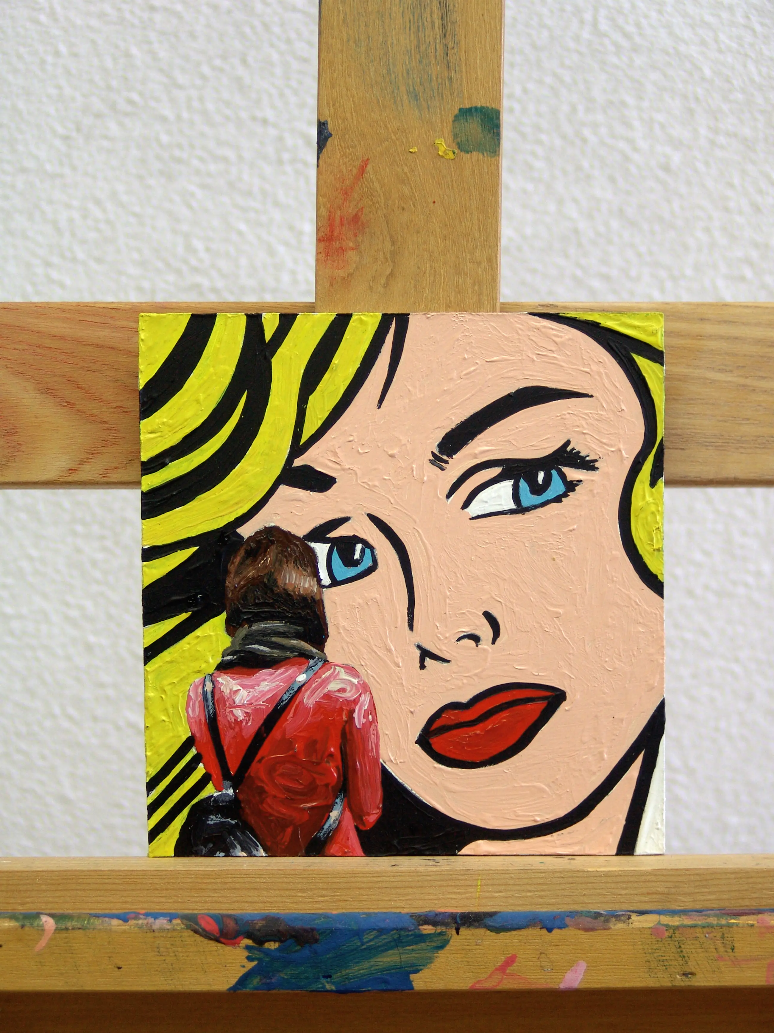 Gerard Boersma staat bekend om zijn schilderijen van mensen die naar bekende schilderijen kijken in musea. Dit werk van 15 x 14,,5 cm toont een vrouw kijkend naar een pop art schilderij Maybe van Roy Lichtenstein.