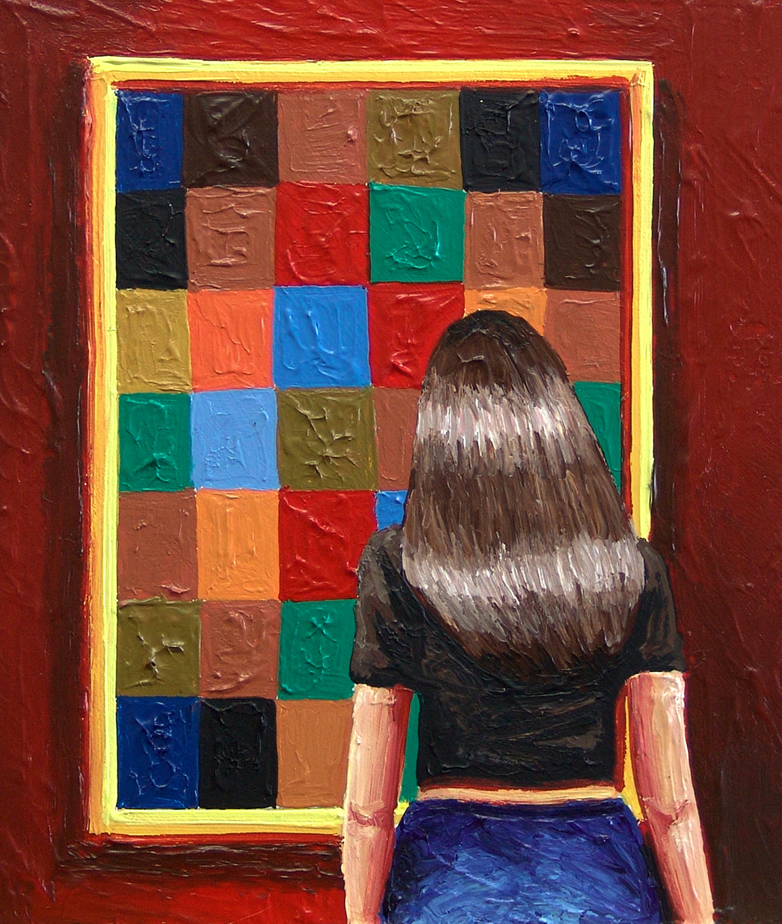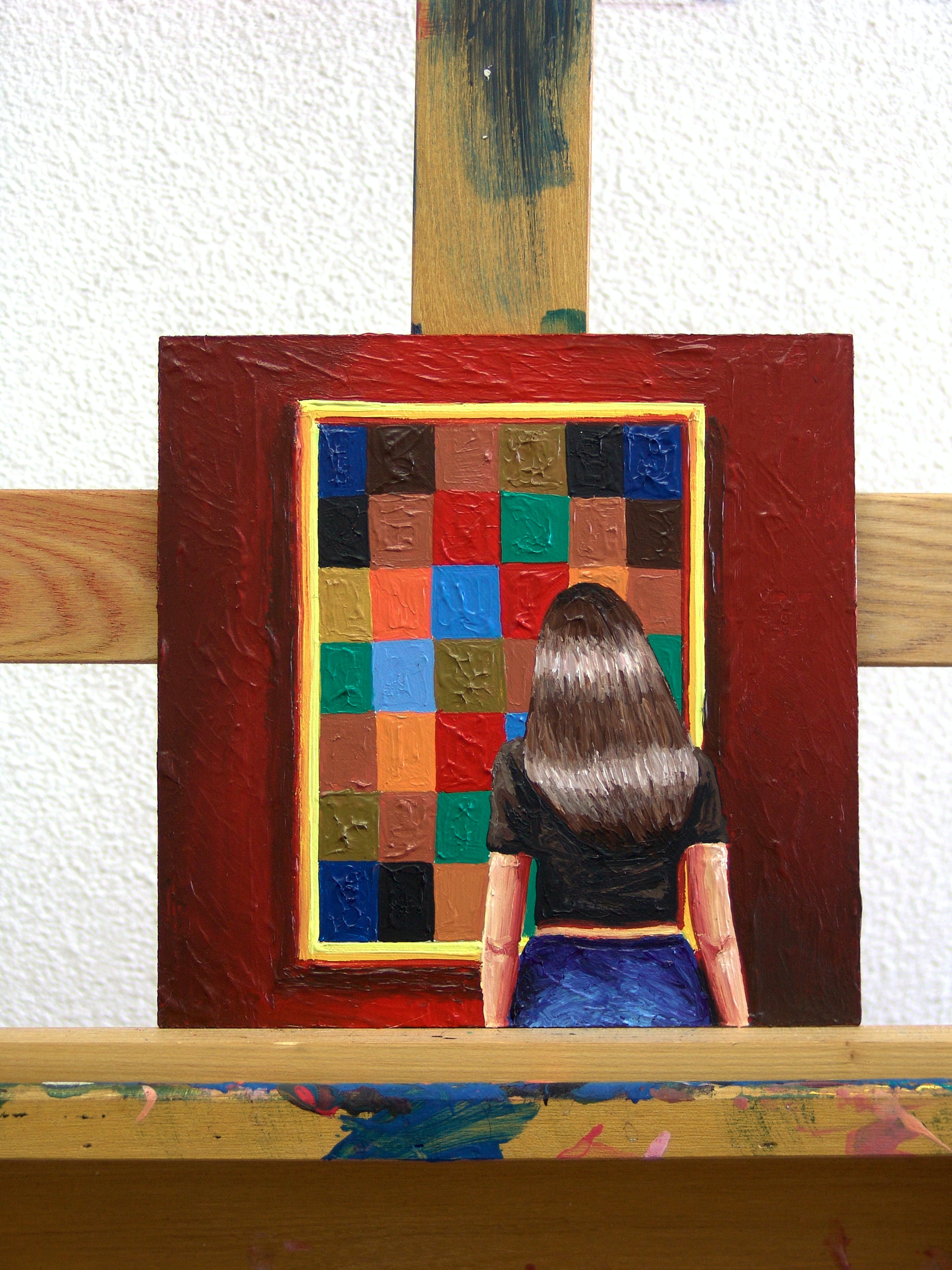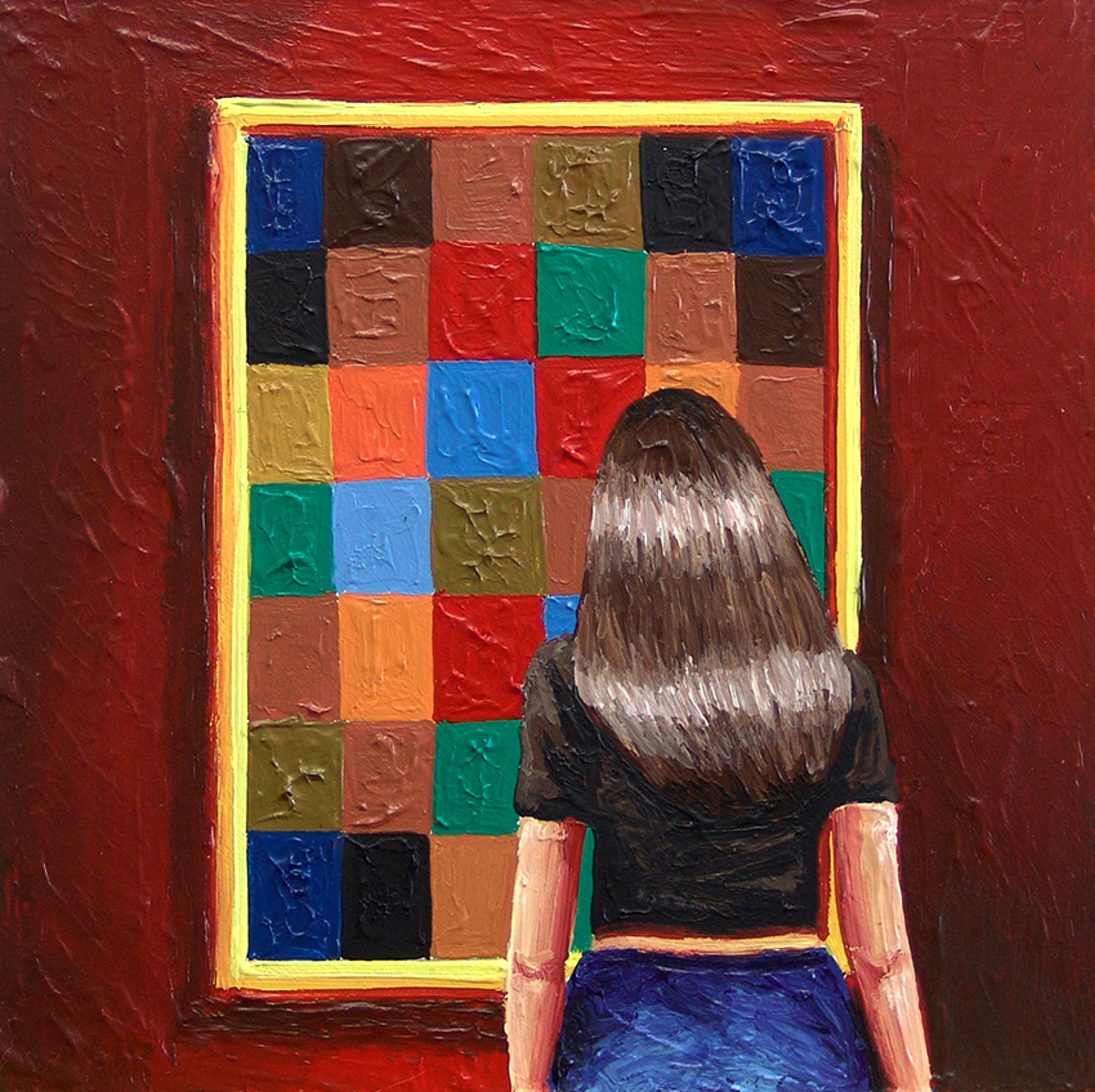 Gerard Boersma staat bekend om zijn schilderijen van mensen die naar bekende schilderijen kijken in musea. Dit werk van 20 x 20 cm toont een vrouw kijkend naar een schilderij van Paul Klee. Het werk dateert uit 2021 en is gemaakt met acryl op masonite. Gesigneerd op achterkant. Het schilderij is voorzien van een label van de kunstenaar en wordt geleverd met certificaat van echtheid.