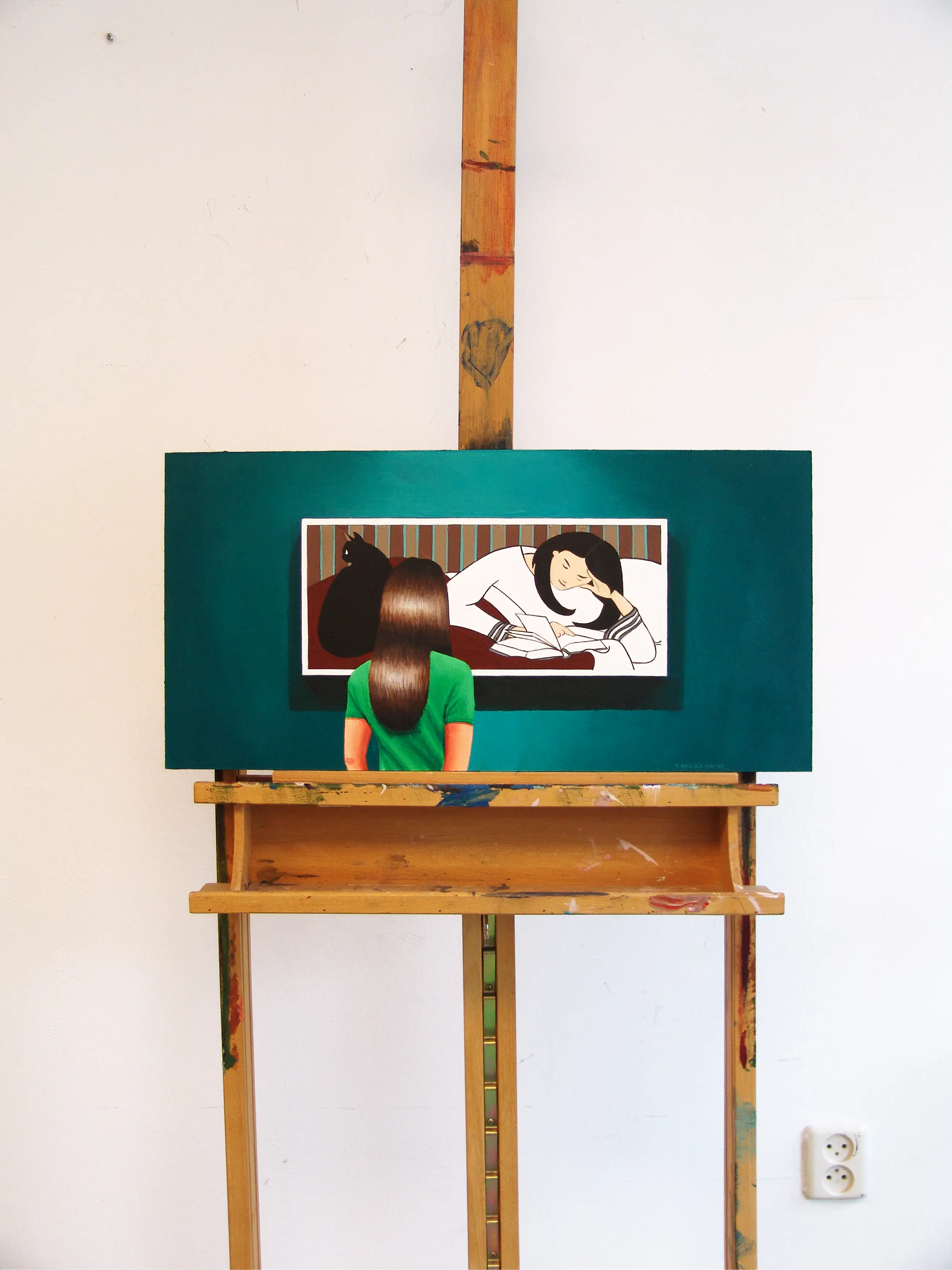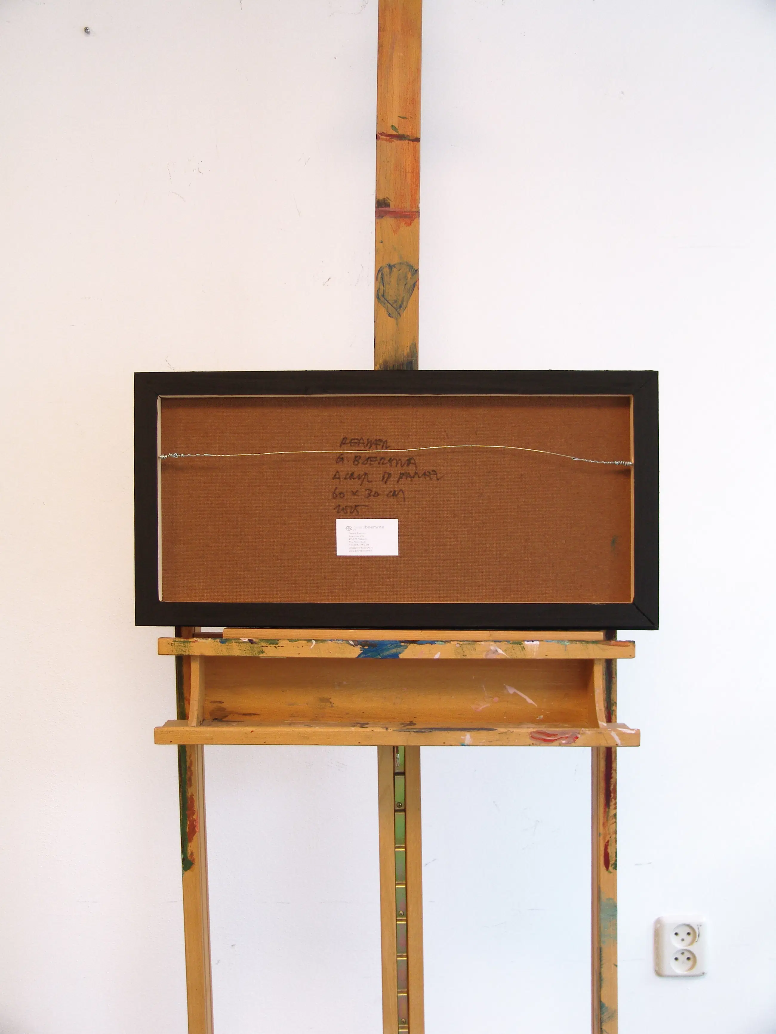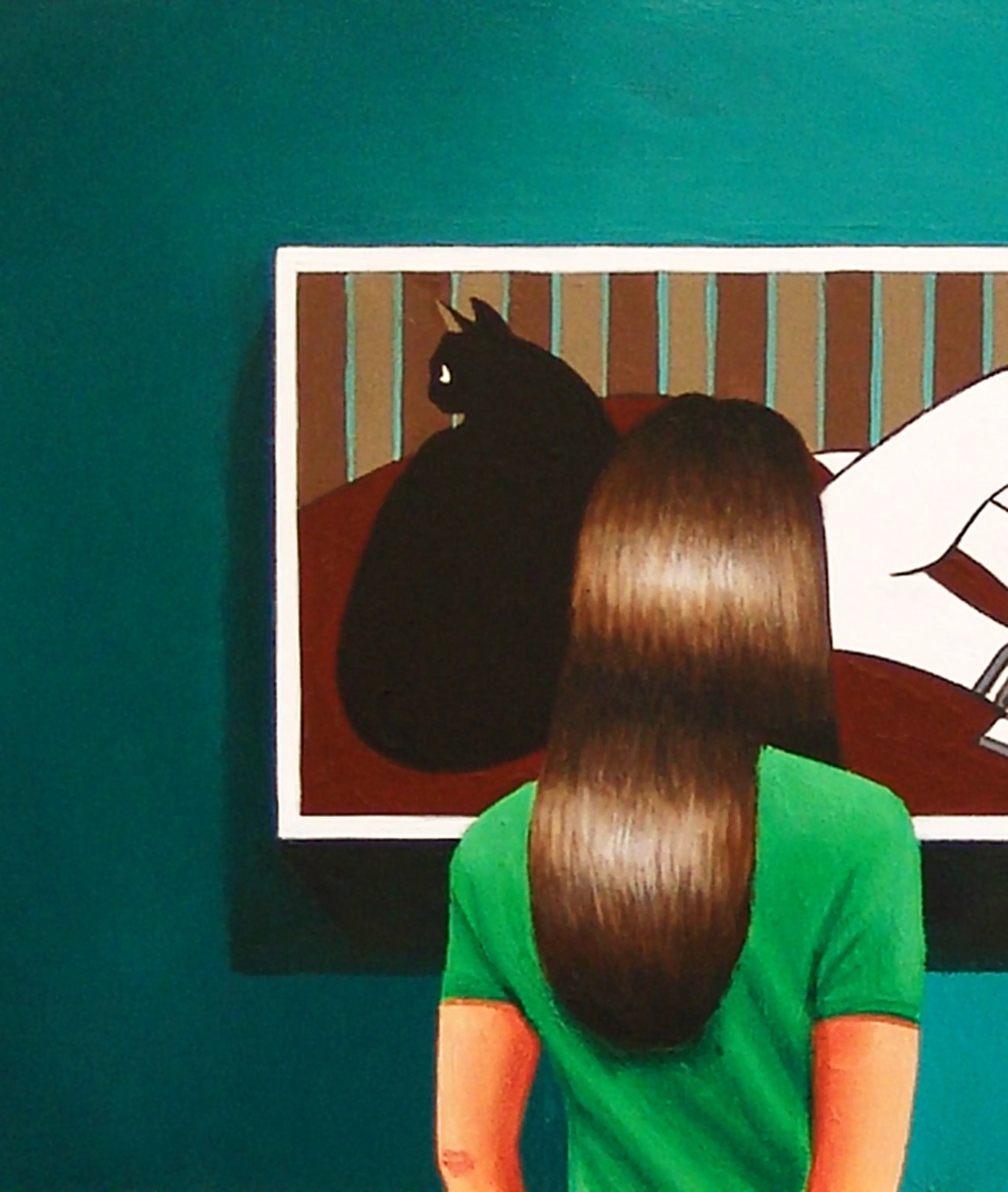 Gerard Boersma staat bekend om zijn schilderijen van mensen die naar bekende schilderijen kijken in musea. Dit werk van 30 x 60 cm toont een vrouw genietend van een schilderij van Will Barnet.
