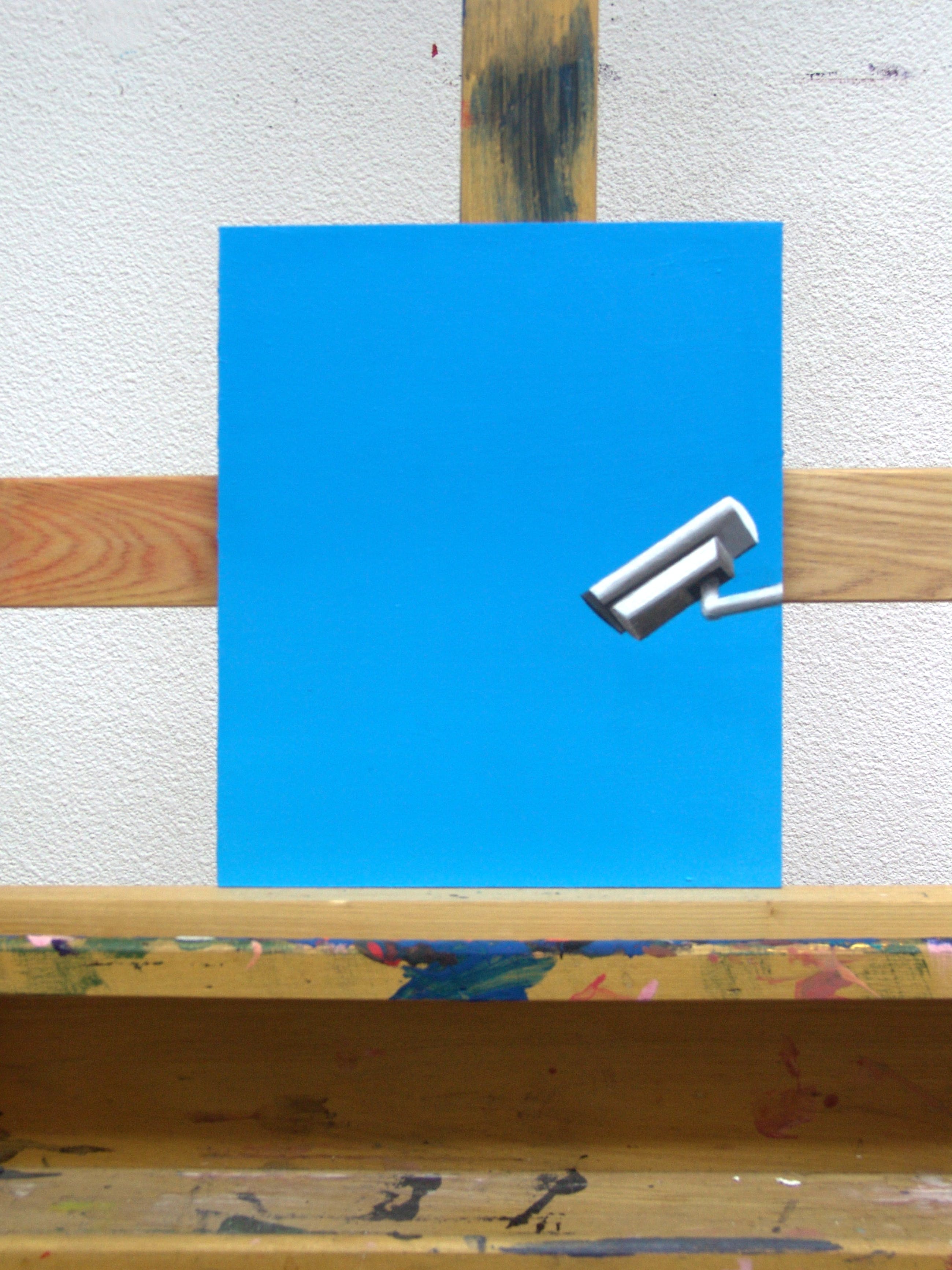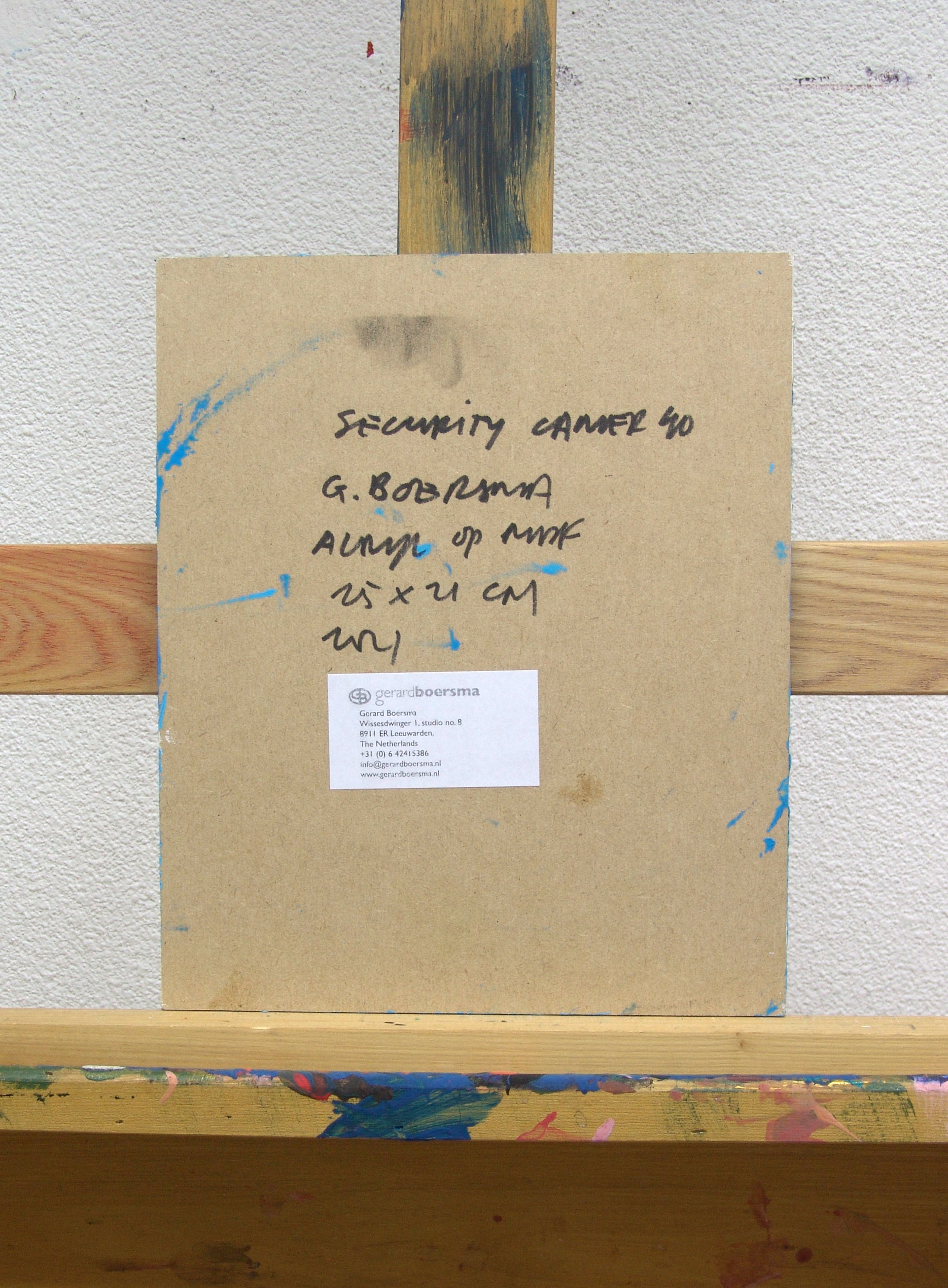 Dit stilleven van 25 x 21 cm toont een CCTV beveiligingscamera tegen een strak blauwe lucht. Het werk dateert uit 2021 en is gemaakt met acryl op mdf. Gesigneerd op achterkant. Het schilderij is voorzien van een label van de kunstenaar en wordt geleverd met certificaat van echtheid.