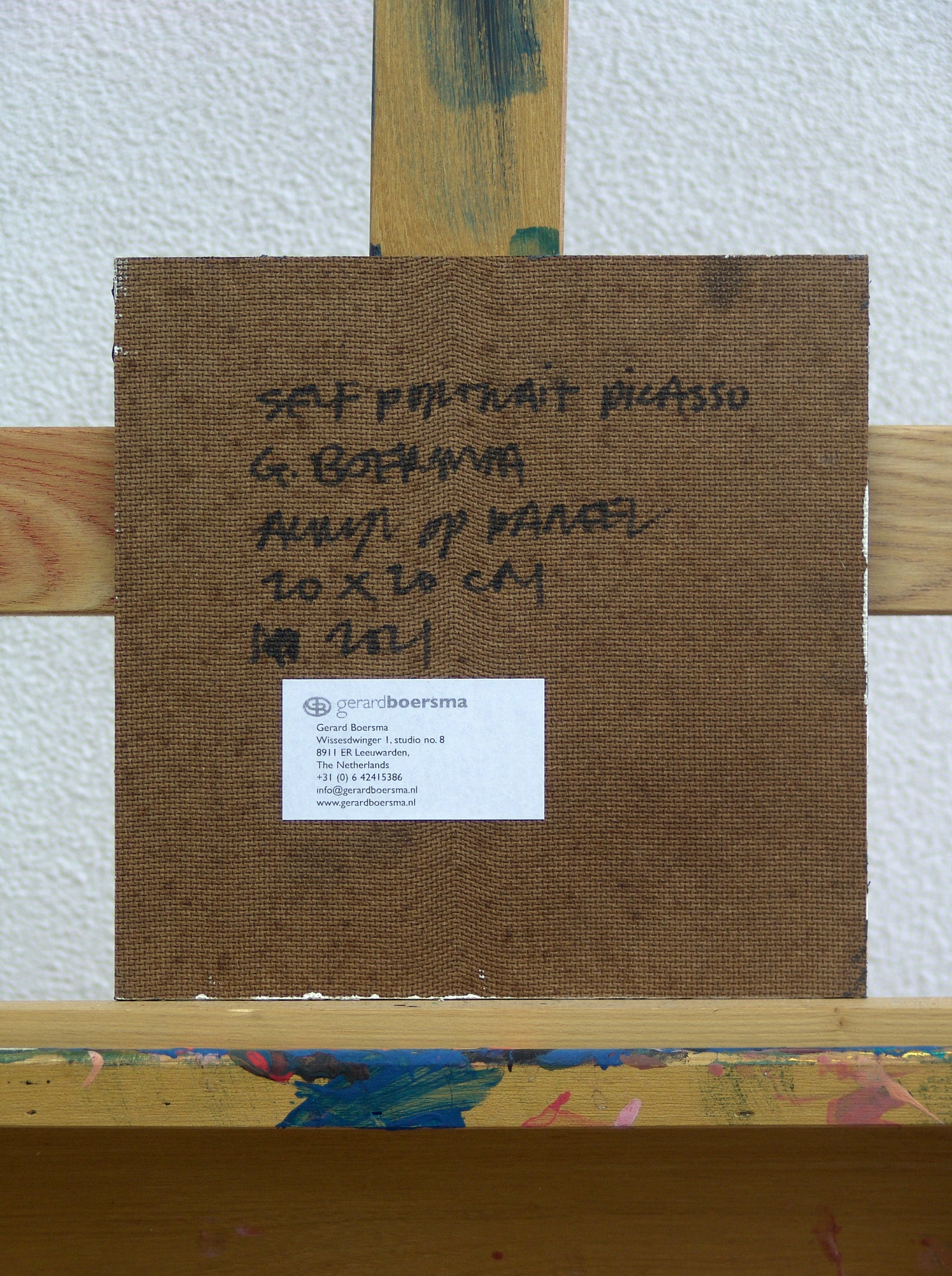 Gerard Boersma staat bekend om zijn schilderijen van mensen die naar bekende schilderijen kijken in musea. Dit werk van 20 x 20 cm toont een vrouw kijkend naar een zelfportret van Picasso. Het werk dateert uit 2021 en is gemaakt met acryl op masonite. Gesigneerd op achterkant. Het schilderij is voorzien van een label van de kunstenaar en wordt geleverd met certificaat van echtheid.