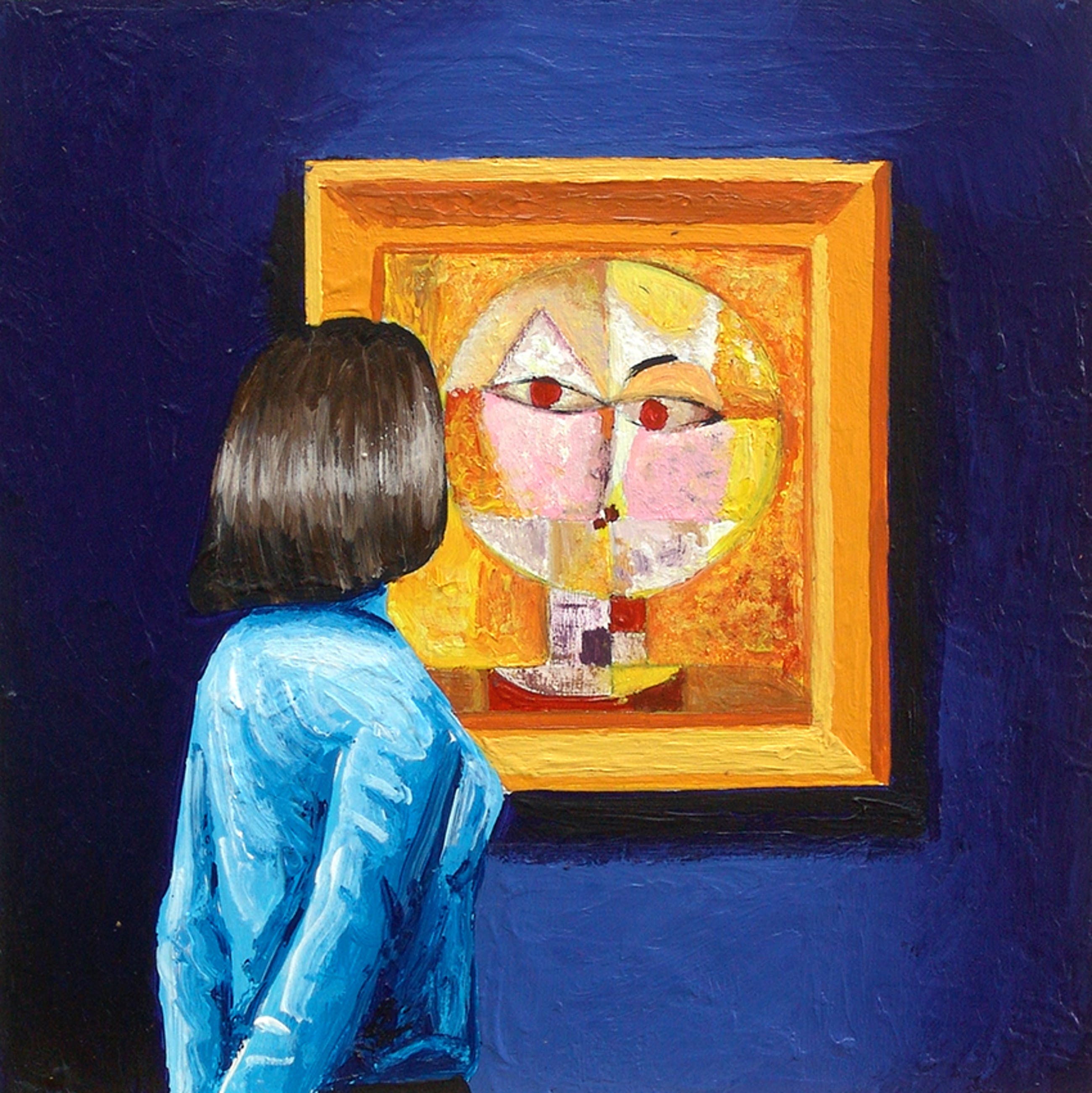 Gerard Boersma staat bekend om zijn schilderijen van mensen die naar bekende schilderijen kijken in musea. Dit werk van 20 x 20 cm toont een vrouw kijkend naar een schilderij van Paul Klee. Het werk dateert uit 2021 en is gemaakt met acryl op masonite. Gesigneerd op achterkant. Het schilderij is voorzien van een label van de kunstenaar en wordt geleverd met certificaat van echtheid.