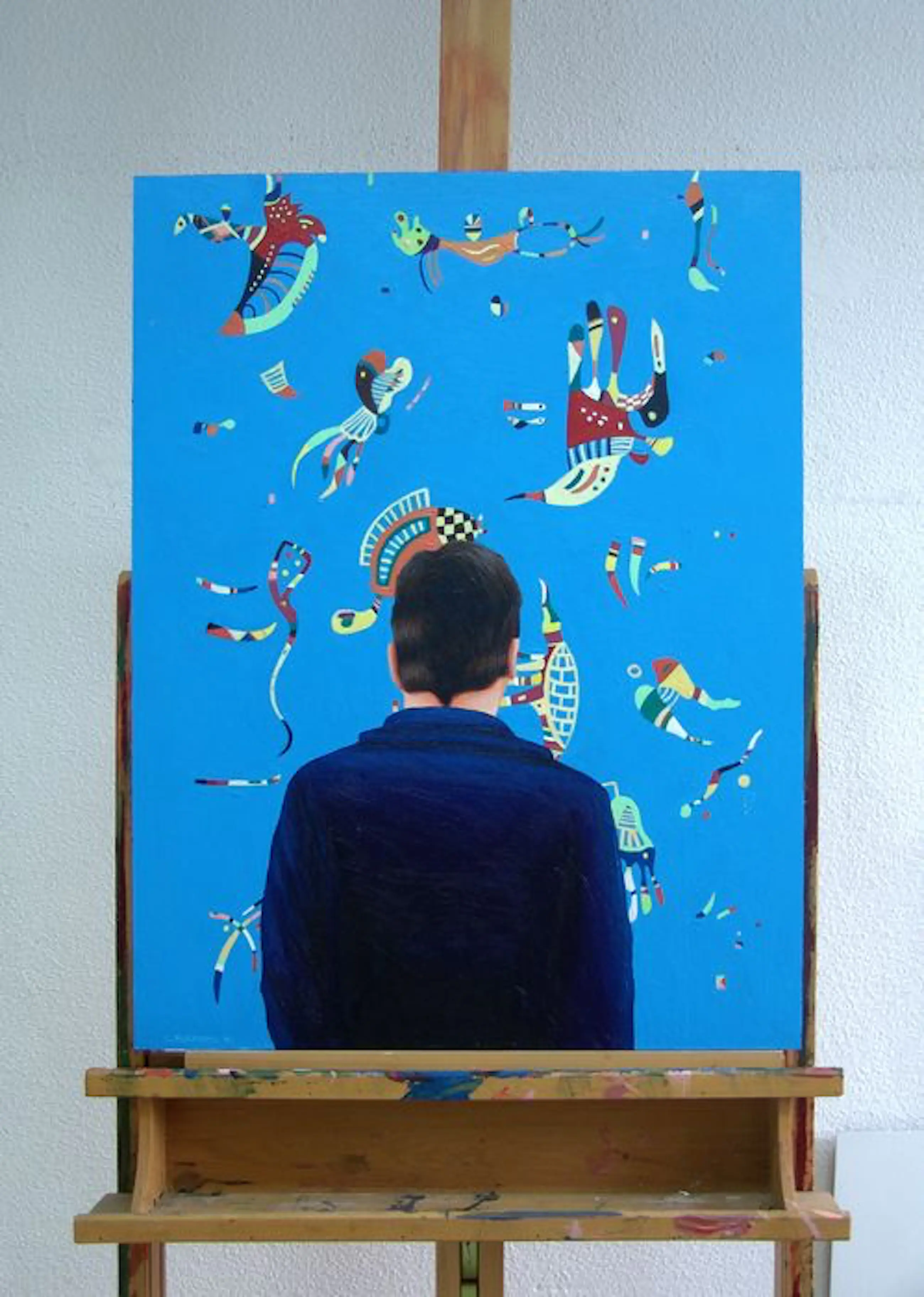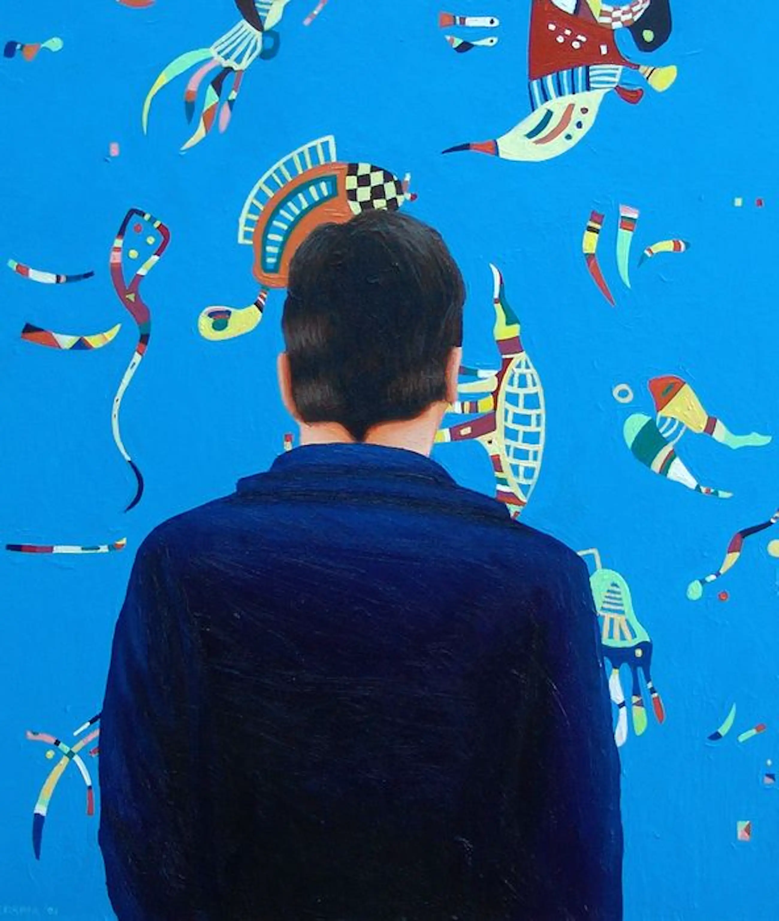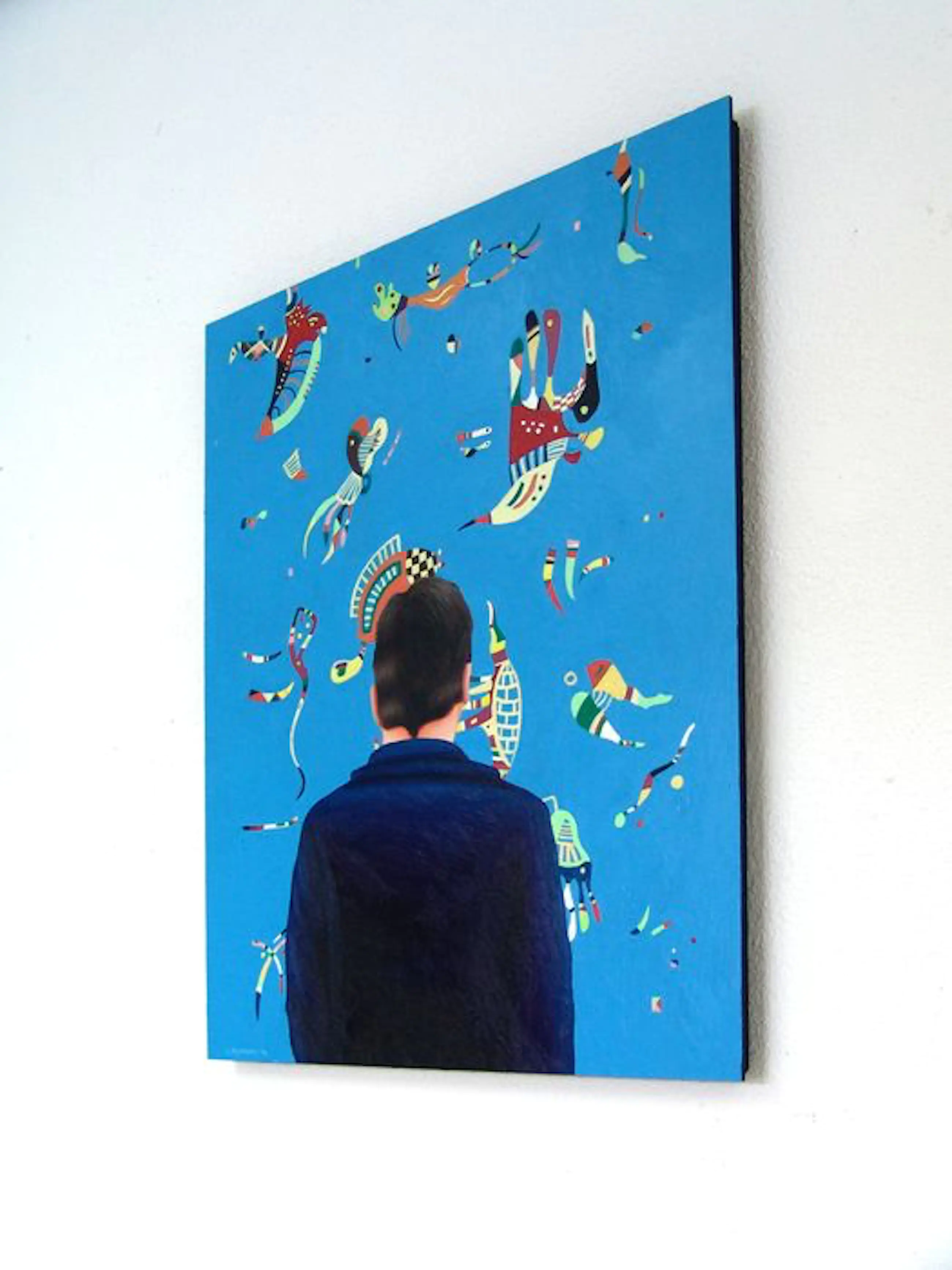 Dit werk van 64 x 48 cm toont een man genietend van een schilderij van Wassily Kandinsky.