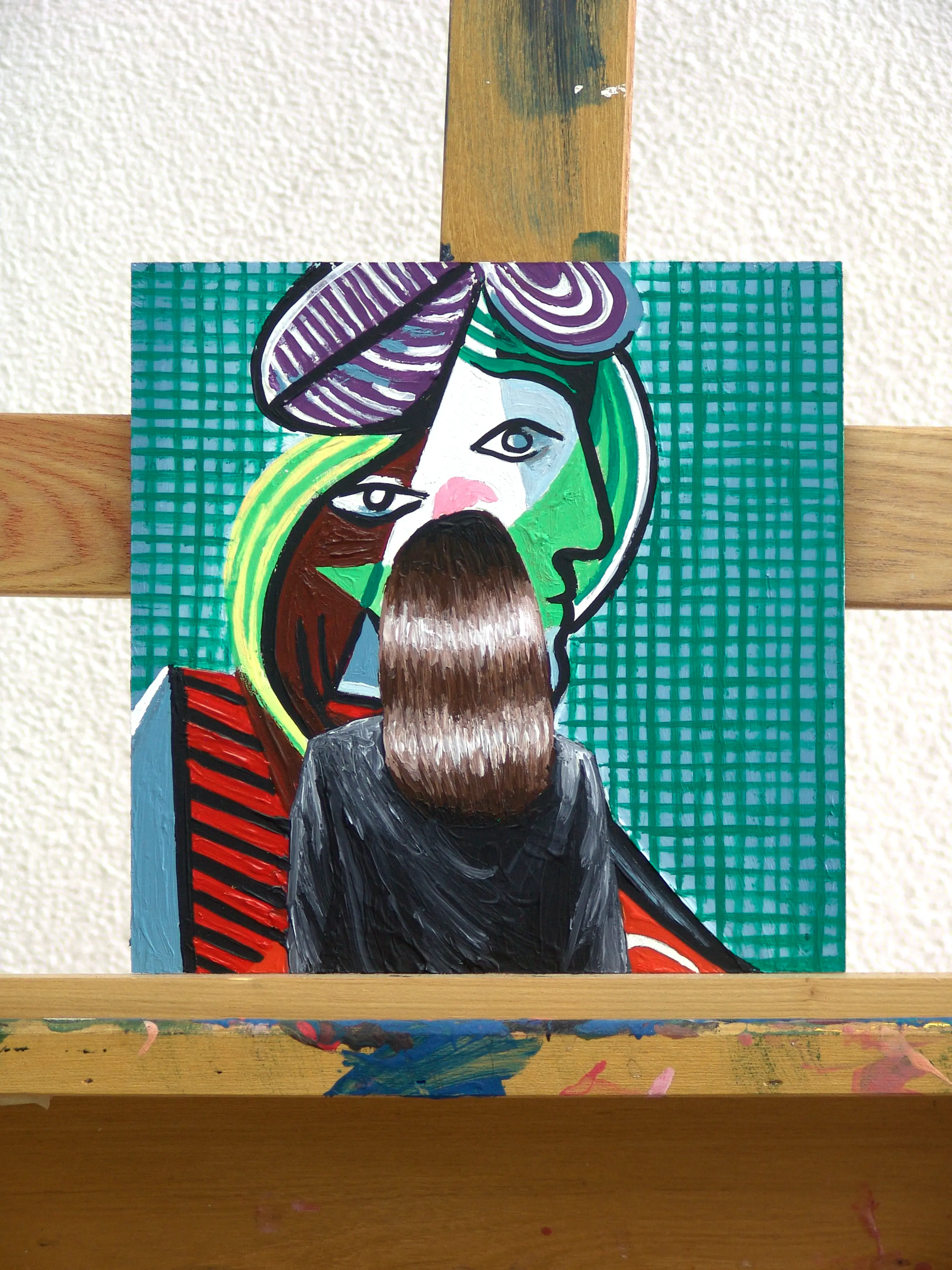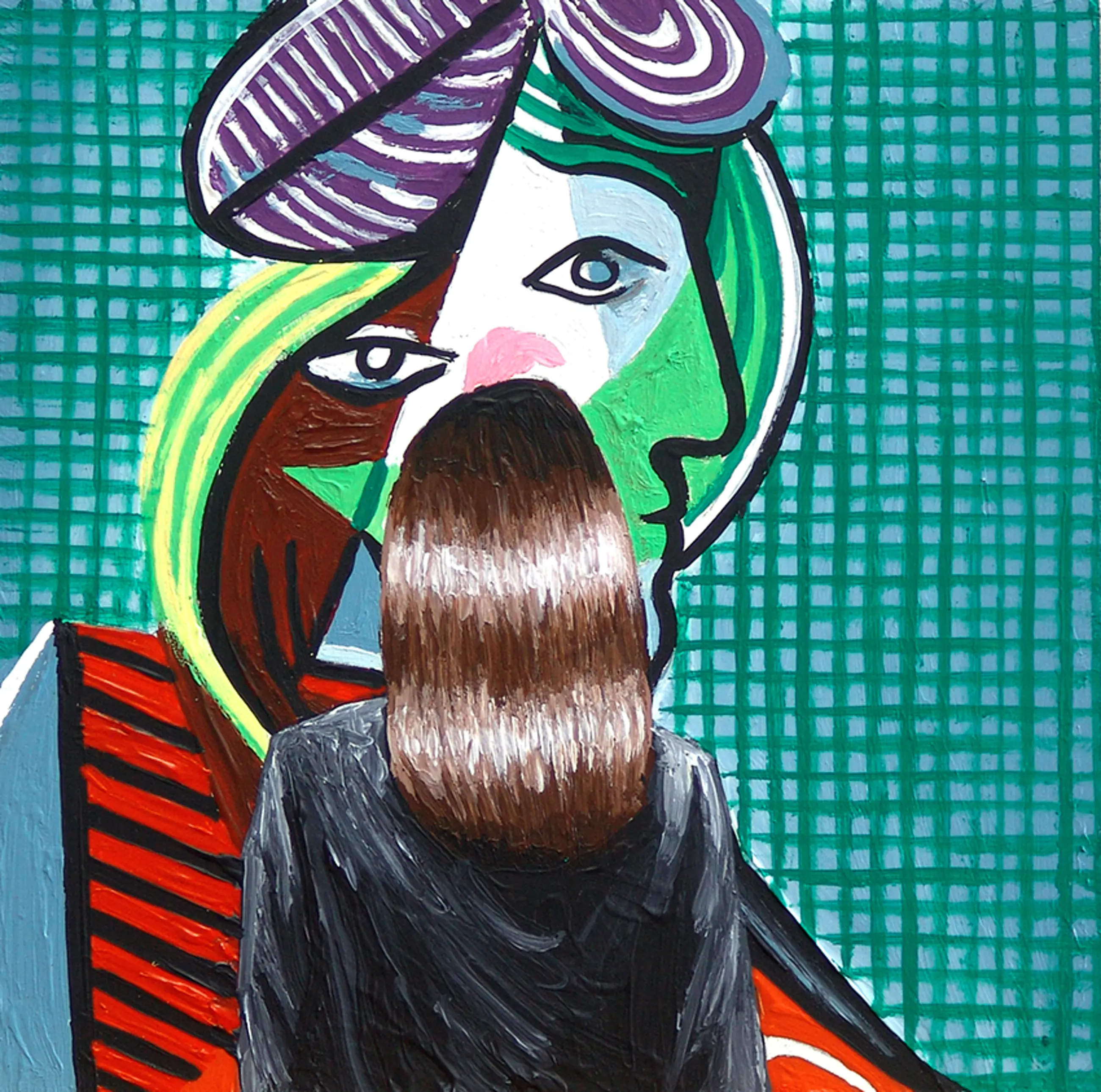 Gerard Boersma staat bekend om zijn schilderijen van mensen die naar bekende schilderijen kijken in musea. Dit werk van 20 x 20 cm toont een vrouw kijkend naar een schilderij van Picasso