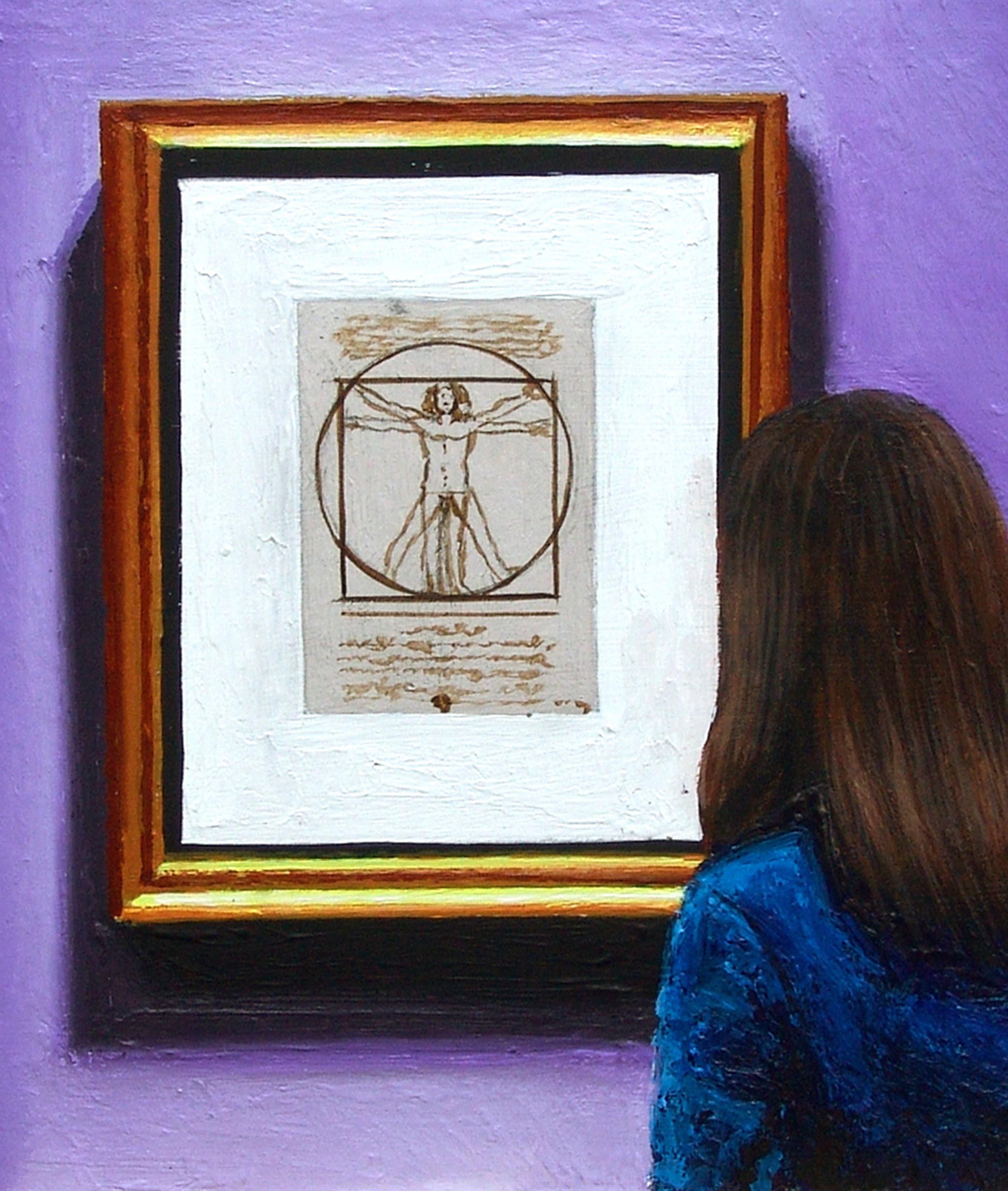 Gerard Boersma staat bekend om zijn schilderijen van mensen die naar bekende schilderijen kijken in musea. Dit werk van 20 x 20 cm toont een vrouw kijkend naar een tekening van Leonardo Da Vinci. Het werk dateert uit 2021 en is gemaakt met acryl op masonite. Gesigneerd op achterkant. Het schilderij is voorzien van een label van de kunstenaar en wordt geleverd met certificaat van echtheid.