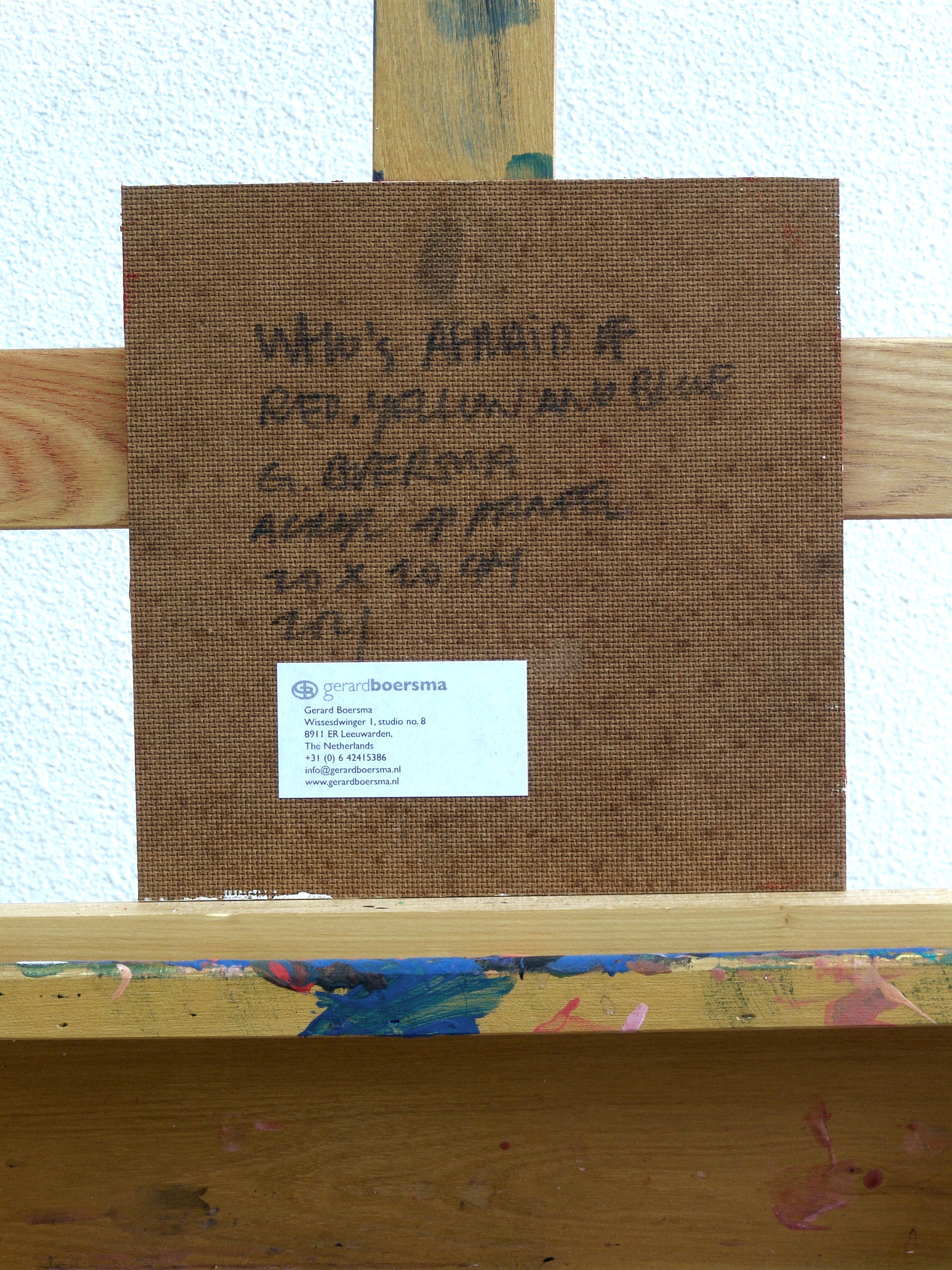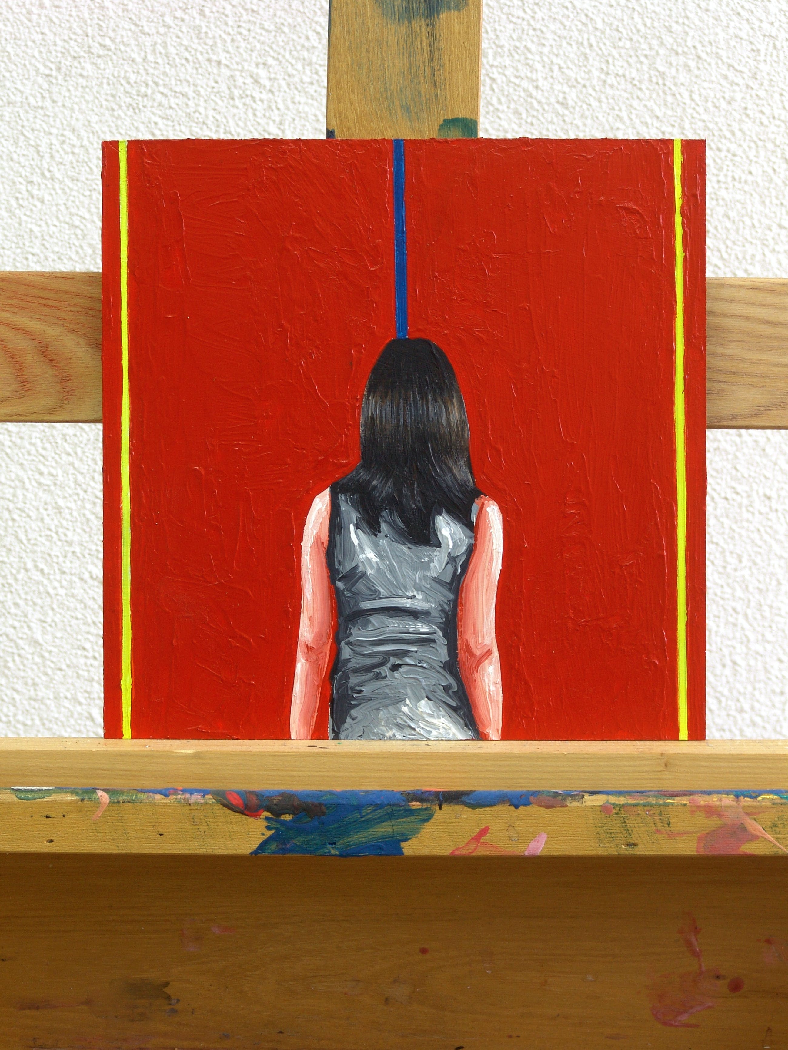 Gerard Boersma staat bekend om zijn schilderijen van mensen die naar bekende schilderijen kijken in musea. Dit werk van 20 x 20 cm toont een vrouw kijkend naar een schilderij van Barnett Newman. Het werk dateert uit 2021 en is gemaakt met acryl op masonite. Gesigneerd op achterkant. Het schilderij is voorzien van een label van de kunstenaar en wordt geleverd met certificaat van echtheid.