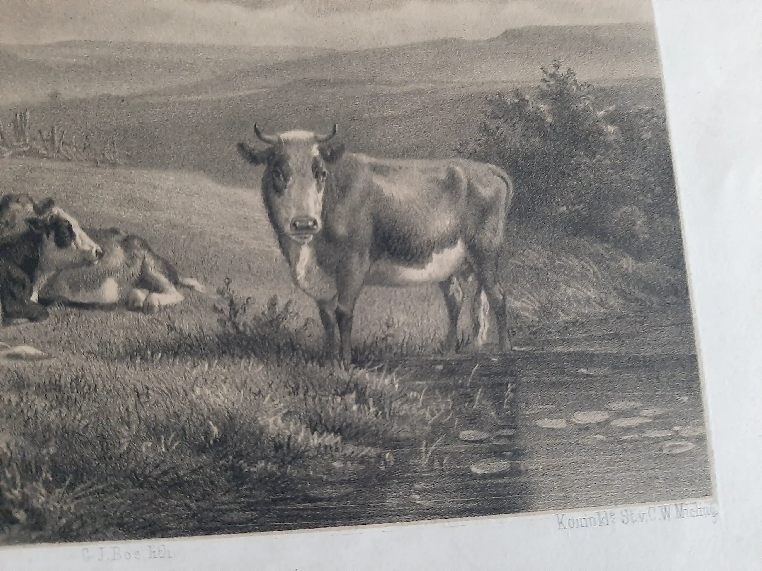 Koeien aan het water Een koe staat half in het water. Twee koeien liggen in het gras en een vierde koe staat verderop bij een hek. Naar een schilderij van Jan Bedijs Tom. Maker: prentmaker: Gerard Jan Bos (vermeld op object)naar schilderij van: Jan Bedijs Tom (vermeld op object)drukker: Koninklijke Nederlandse Steendrukkerij van C.W. Mieling (vermeld op object) Datering: 1835 - 1898 Fysieke kenmerken: toonlithografie Materiaal: papier Techniek: toonlithografie Afmetingen: blad: h 262 mm × b 348 mm Afmeting plaat: 155mm x 208mm