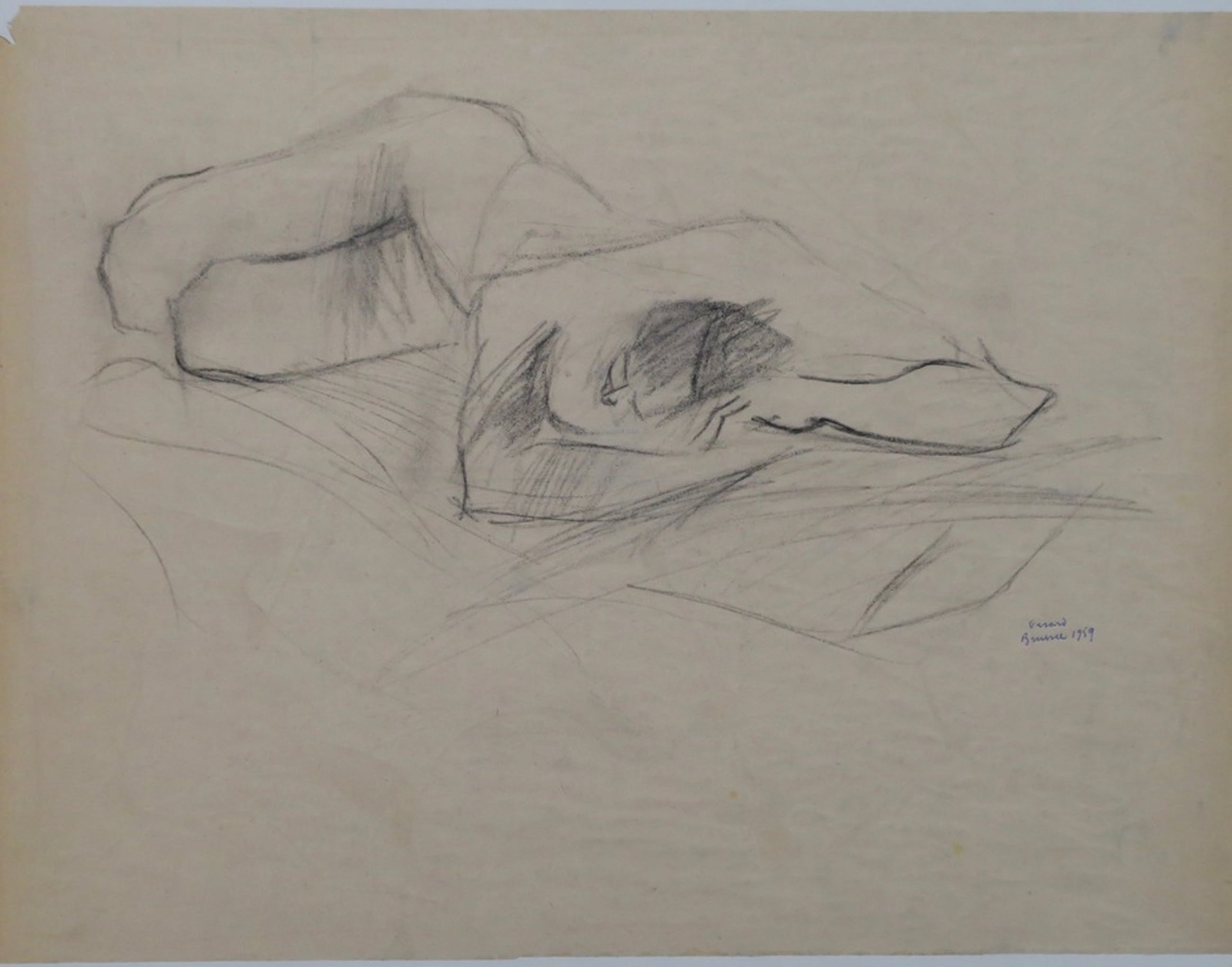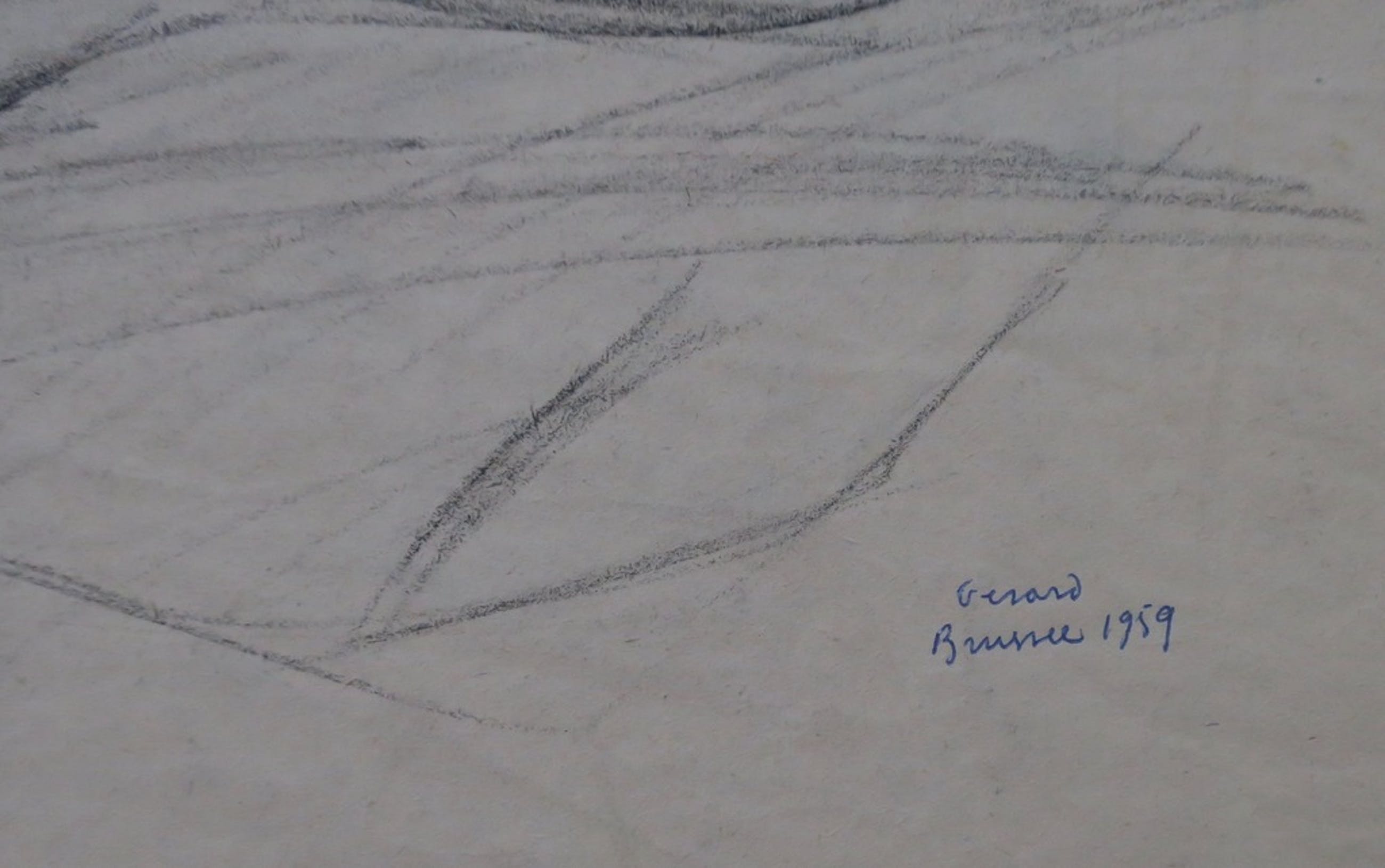 Materiaal: Houtskool tekening op papier, bevestigd op achterblad